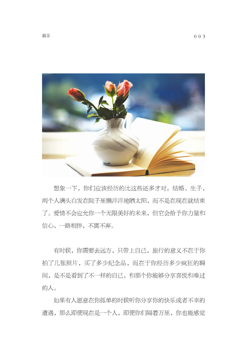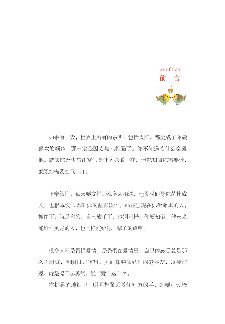 这是一本情感哲理美文集,用温暖清新的文字和温馨正能量的情感,和你一起经历爱情种种美好的样子,涵盖了从相遇到相知,从怦然心动到细水长流,从坚持到包容等多个方面。生命是一场情理之中的意外,没有哪次相遇可以准备,没有哪次重逢可以预演,美的遇见总在刹那间,时间会把那个对的人留到后。总有一个人会放下底线来纵容你,不是天生好脾气,只是怕失去,才宁愿把你宠坏,困在怀里。请你在美好的年纪,大胆地爱一回,不用轰轰烈烈,只要不离不散,便不枉此生。
