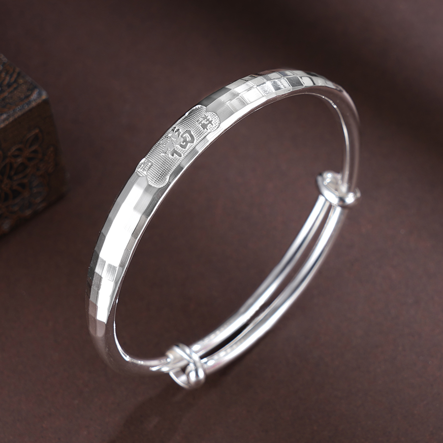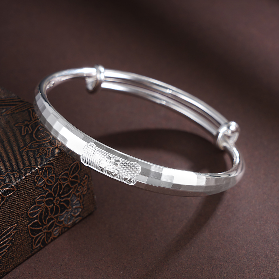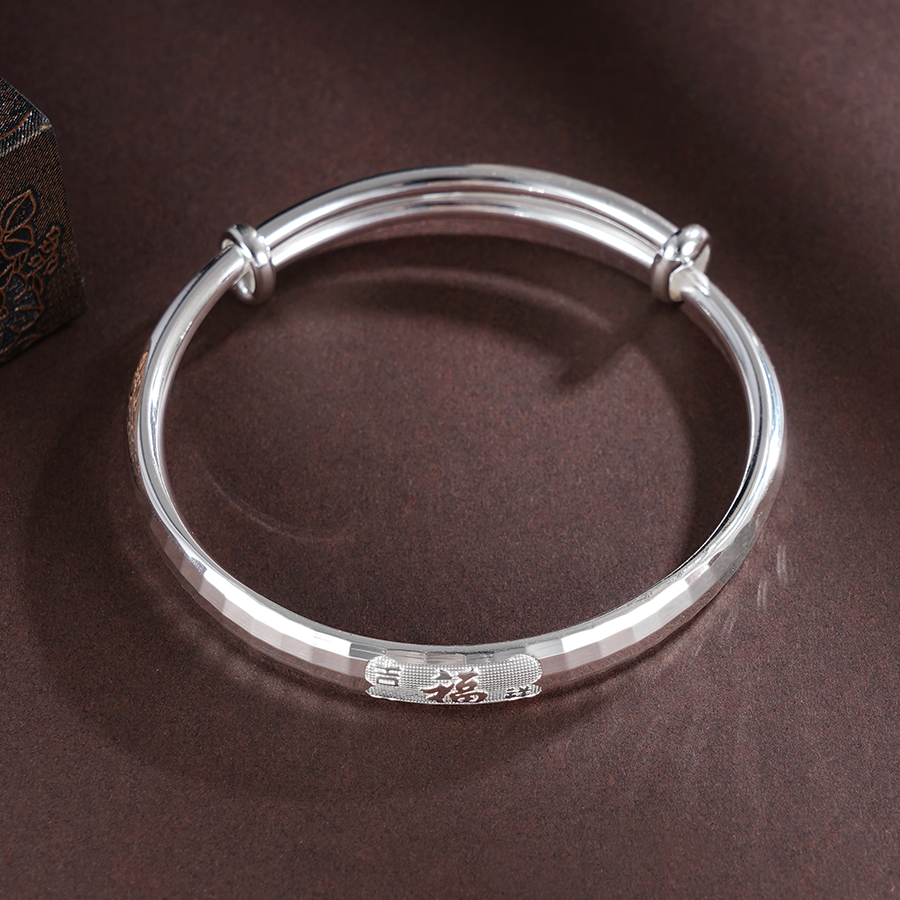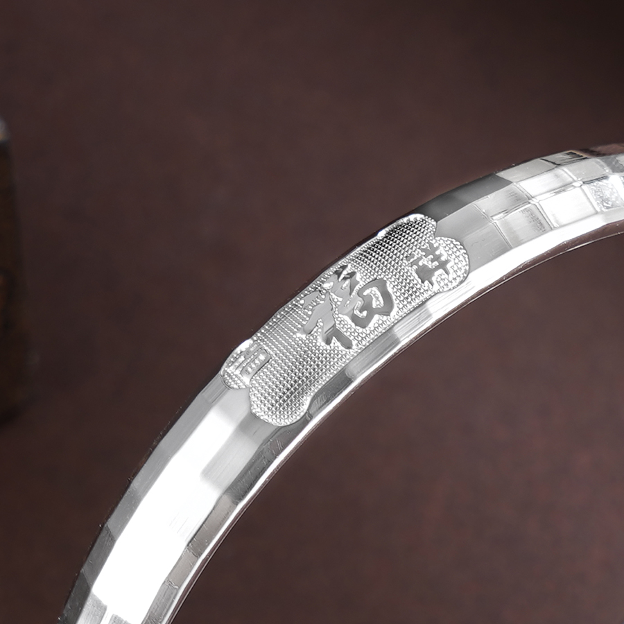 【寓意】:一款细腻的纯银手镯,通体抛光打磨,呵护细嫩肌肤。手镯表面点缀福字,寓意一生吉祥,幸福安康。
