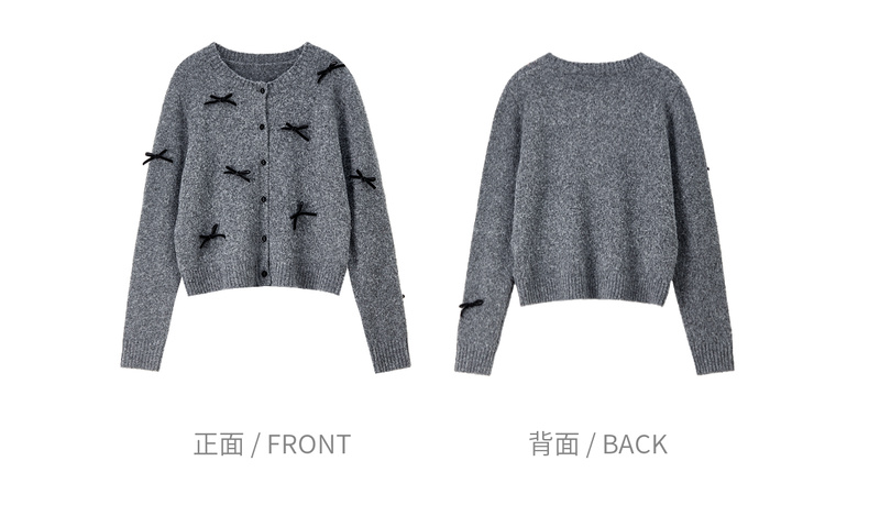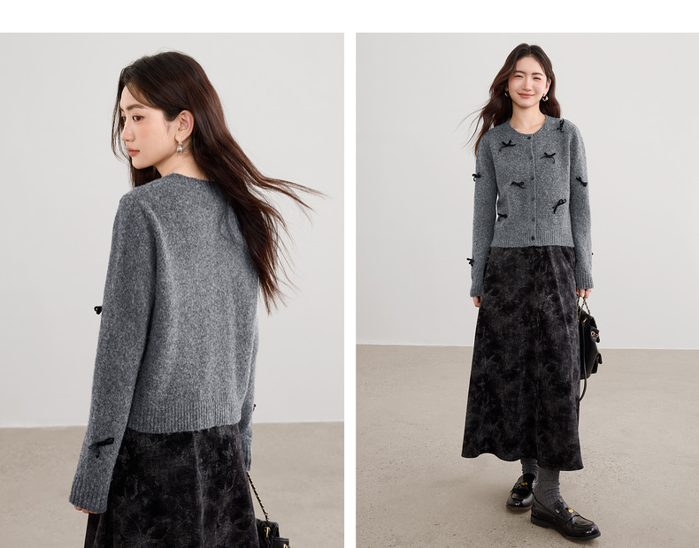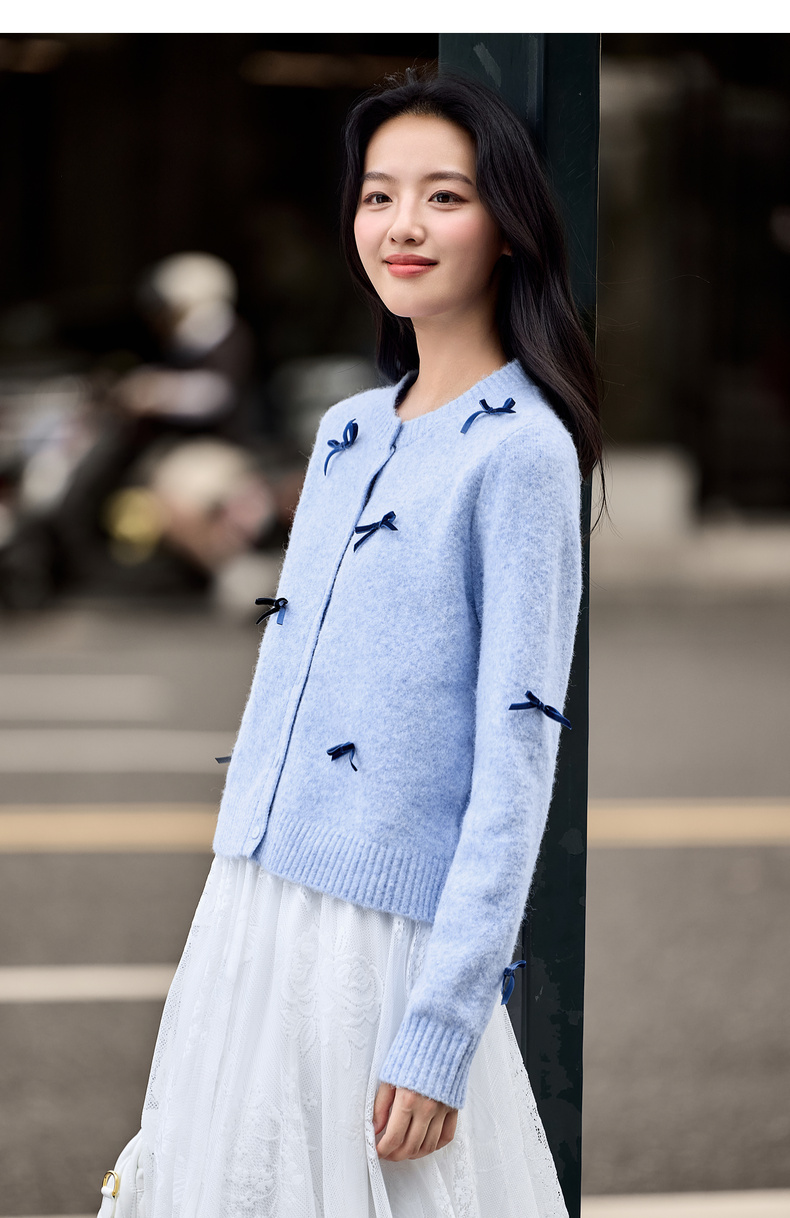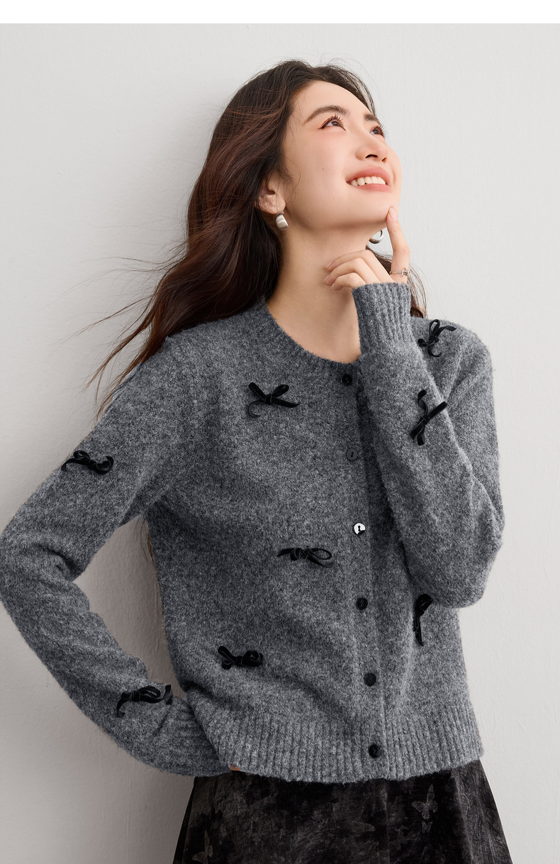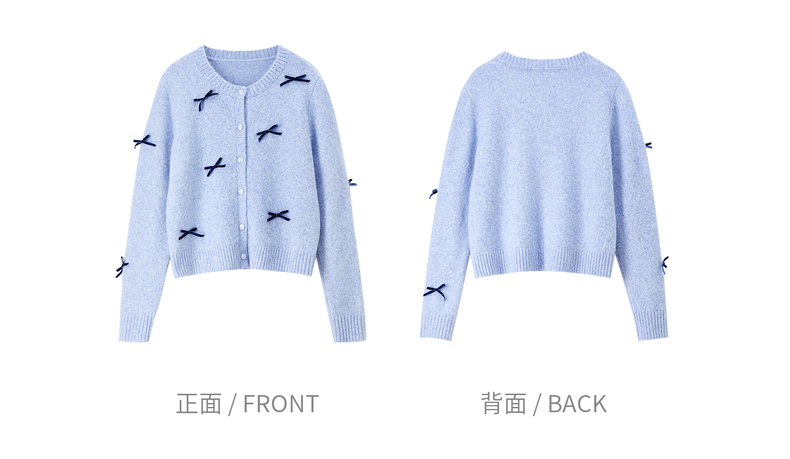 【内购】【含绵羊毛】通勤圆领贝壳扣撞色手工丝绒蝴蝶结软糯弹力开衫毛衣-W54EB3758