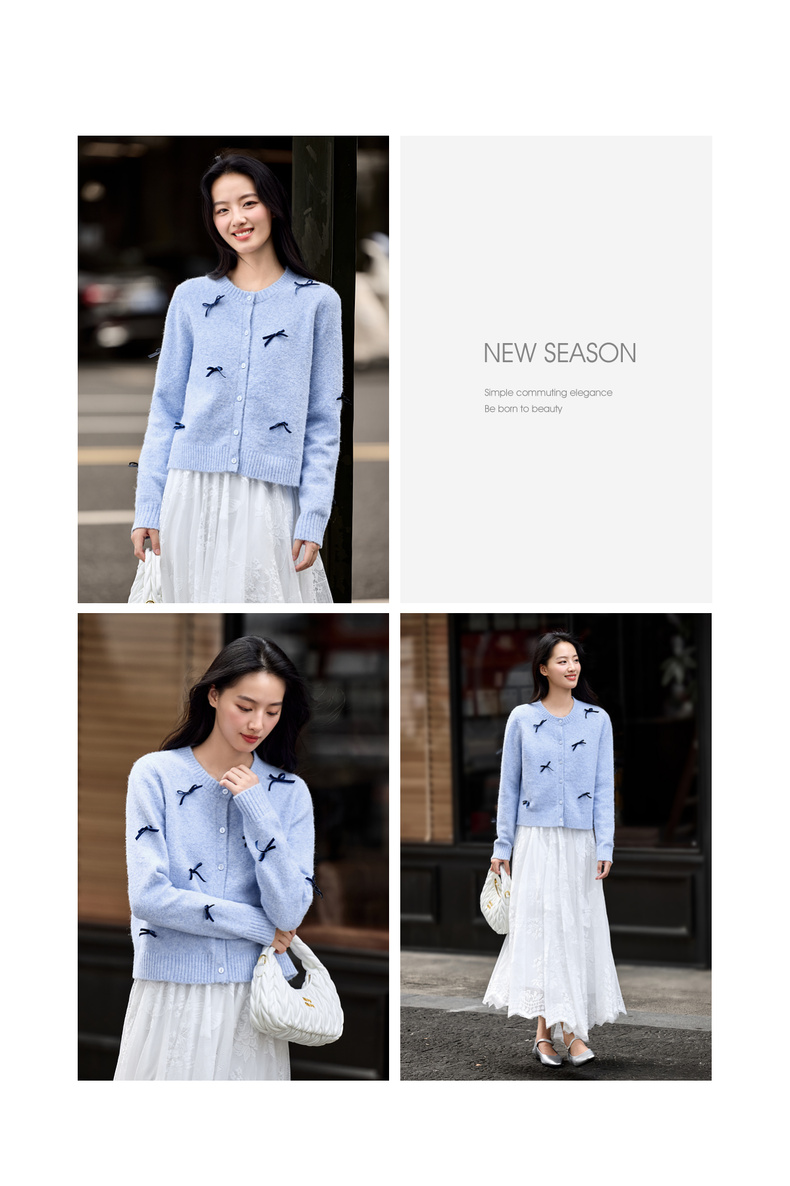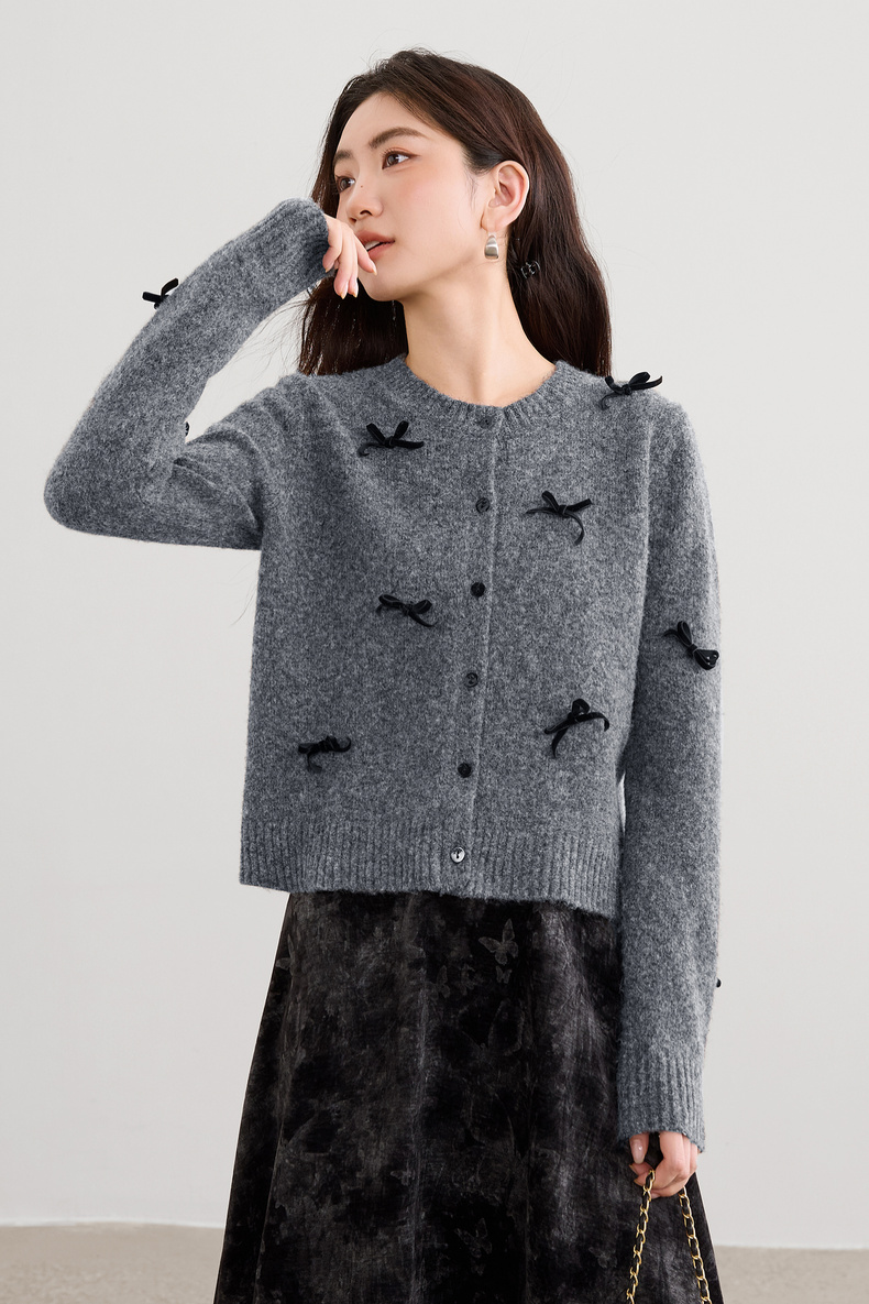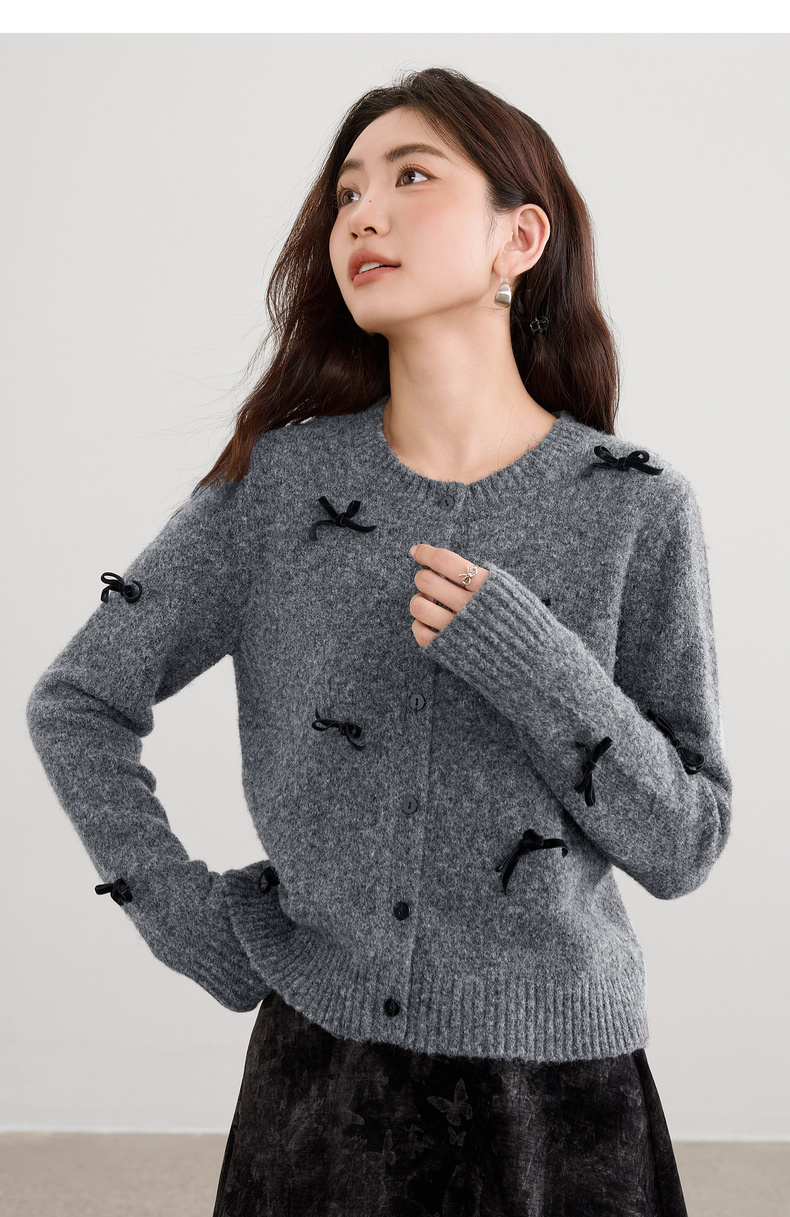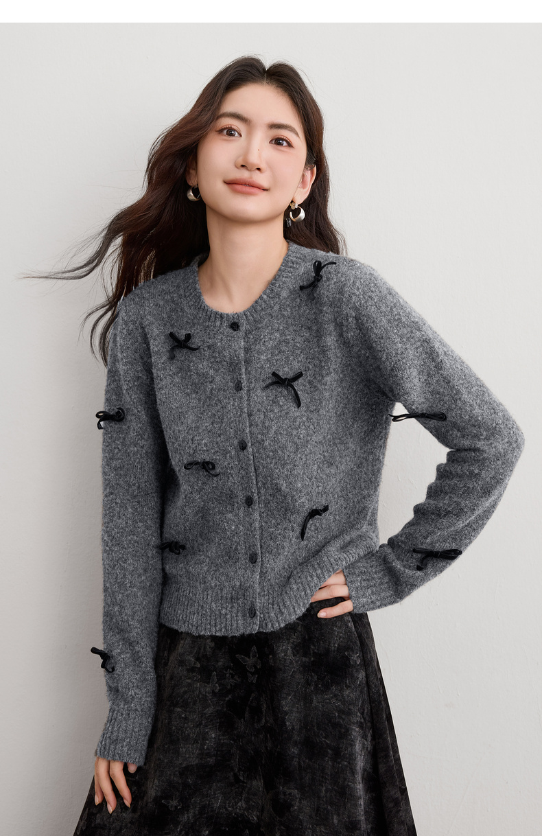 【内购】【含绵羊毛】通勤圆领贝壳扣撞色手工丝绒蝴蝶结软糯弹力开衫毛衣-W54EB3758