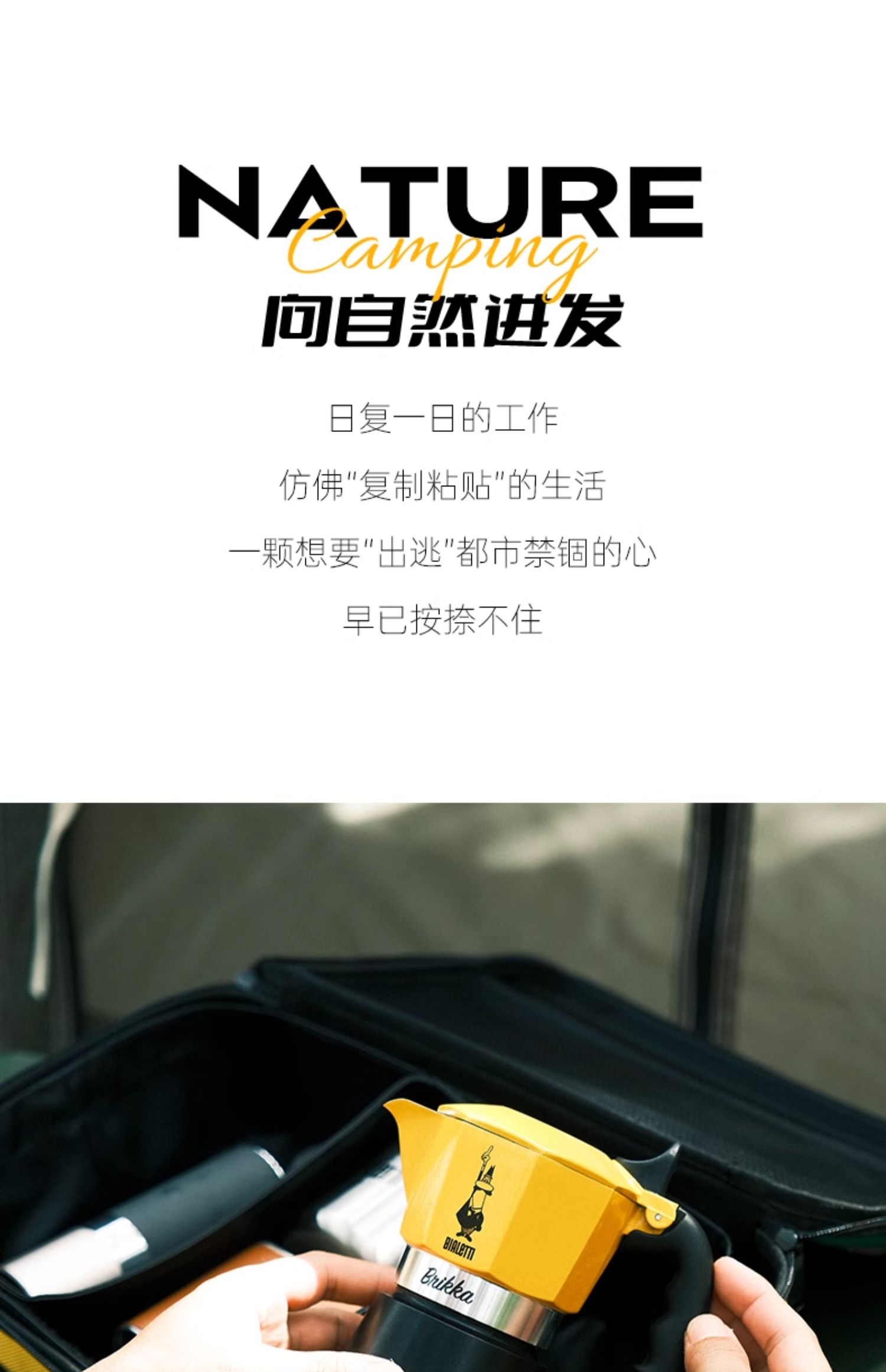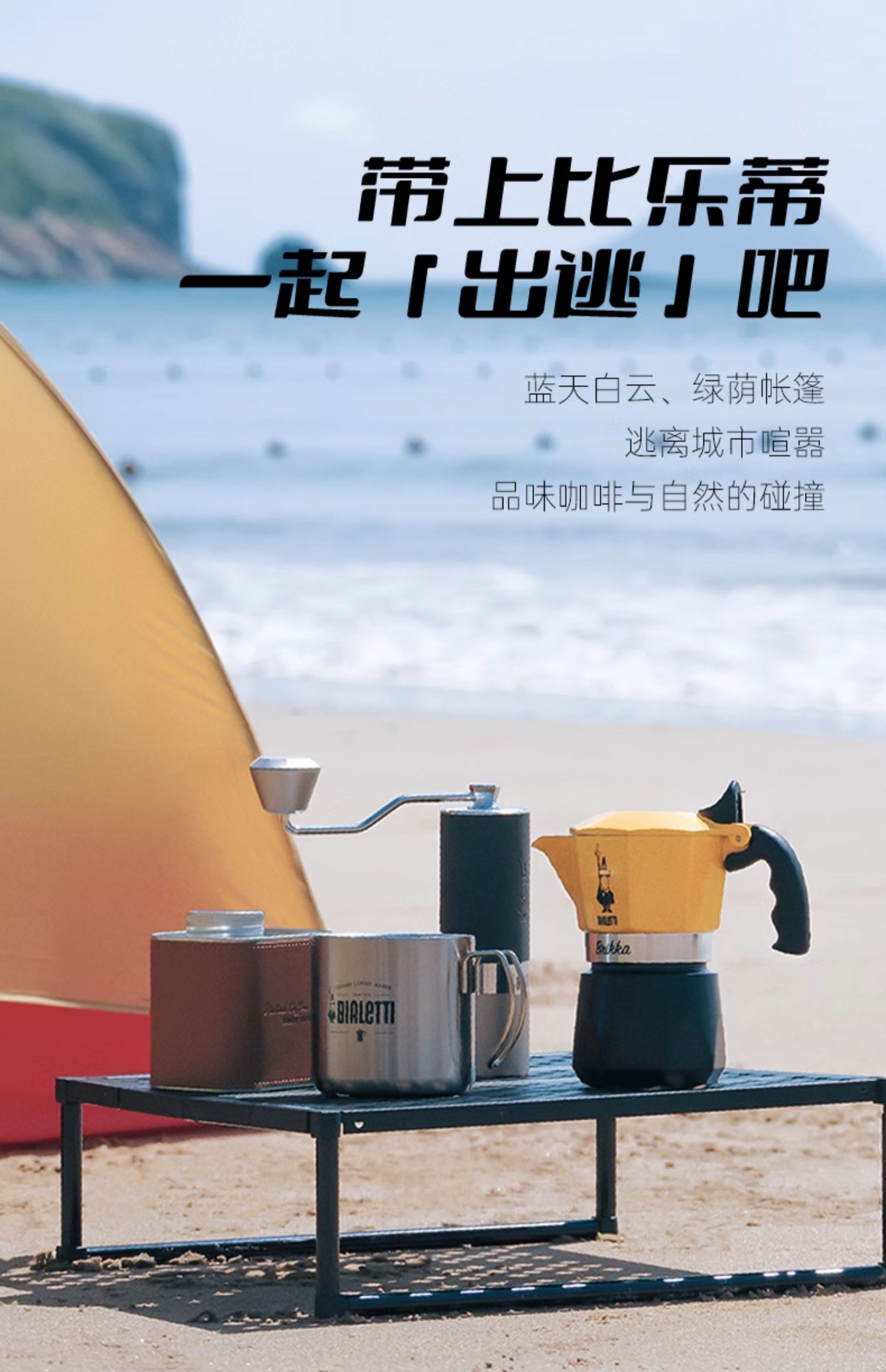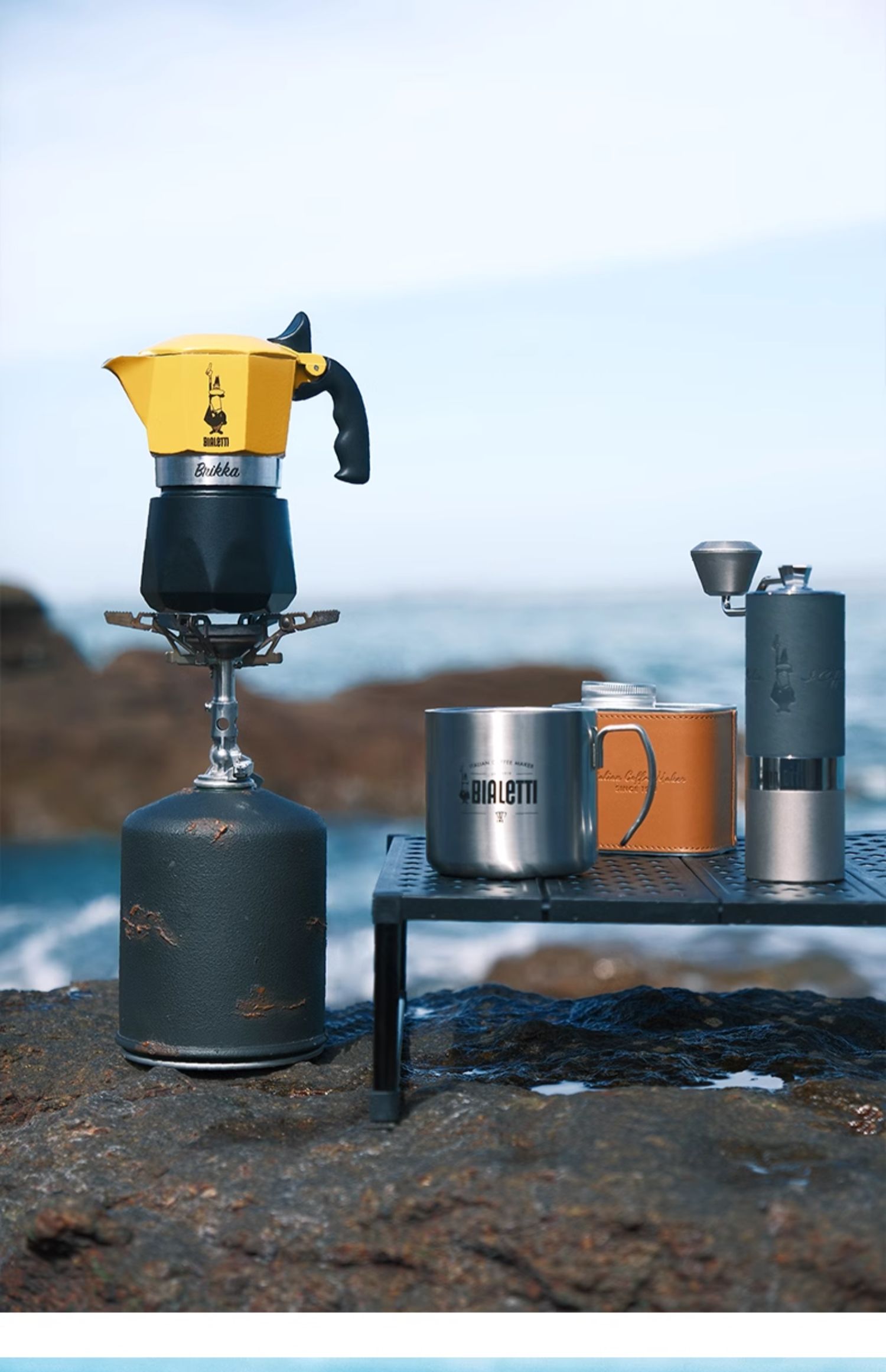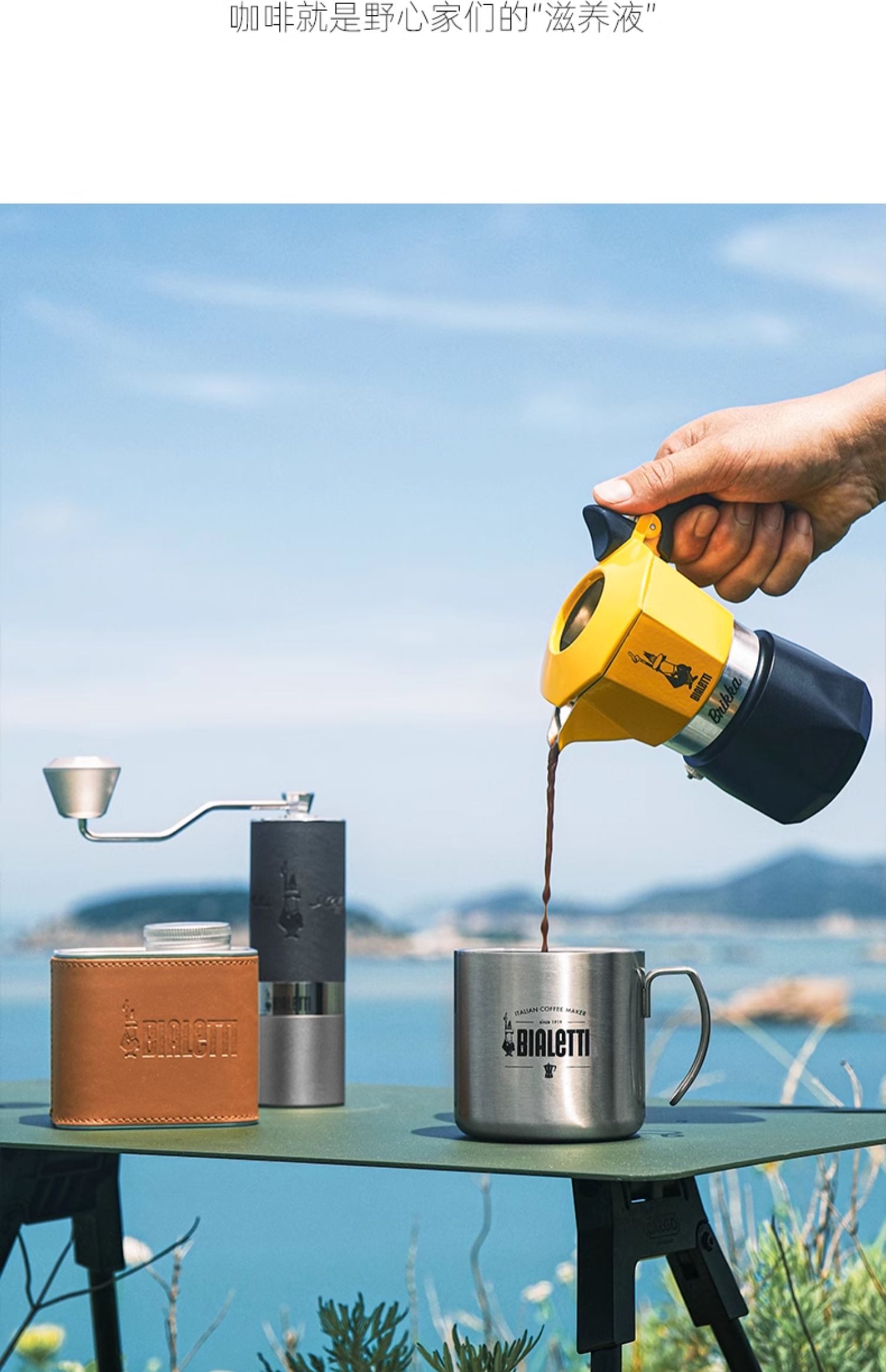 比乐蒂(Bialetti)摩卡壶户外露营套装 咖啡壶咖啡杯磨豆机礼盒套组收纳包双阀组合 黄色2杯份基础版 4件套 100ml