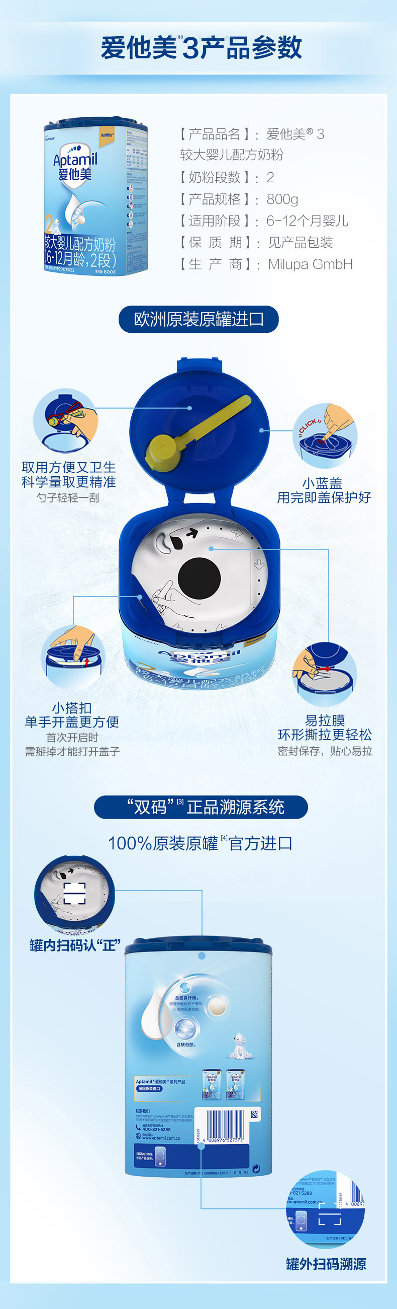 爱他美较大婴儿配方奶粉6-12月龄2段800克