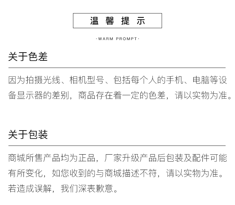 退换货说明: 1、收到快递后请先拆包验货再签收。 2、质量问题请及时拍照并联系客服处理。 3、非产品质量问题的,商品签收72小时后不受理无条件退货申请,签收超过一周后不受理无条件退/换货申请(积分兑换、特价商品非质量问题不受理退/换货申请,详情联系客服咨询)。 4、无理由退/换货需保证商品标签,配件,包装完整,无明显污渍,无异味并未经使用,无理由退换货运费由买家承担。 *下单后默认同意此说明,请仔细阅读以上说明,介意慎拍。 |