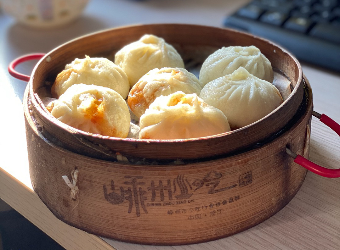 【口感】传统老面发酵,面皮松软不失嚼劲,猪腿肉内馅配上绍兴梅干菜,特殊香味,回味无穷!