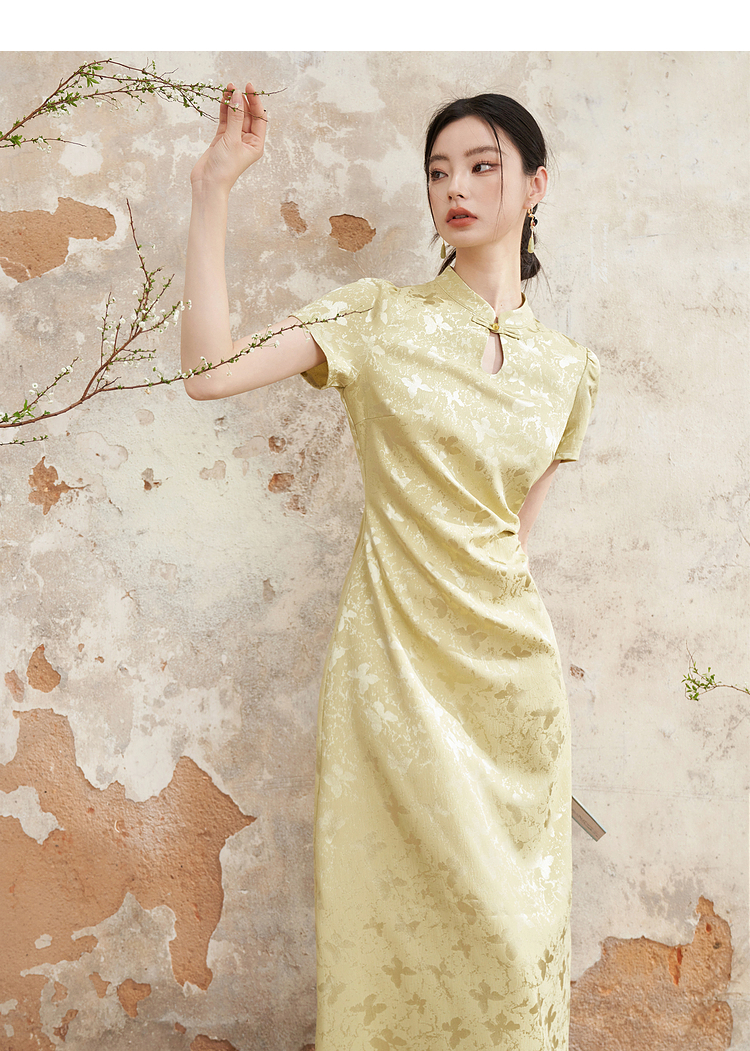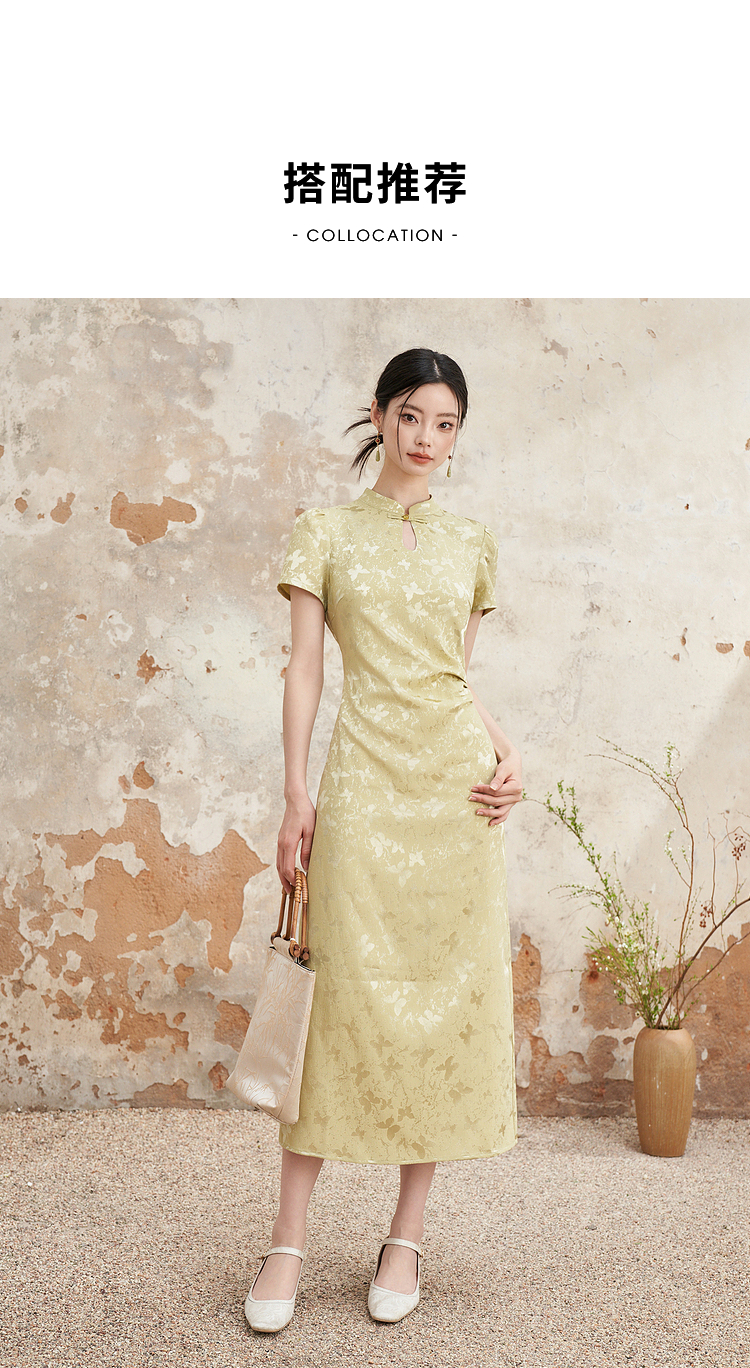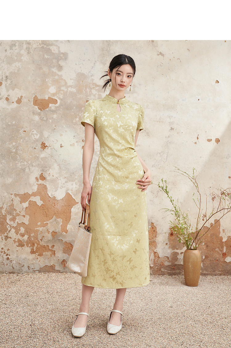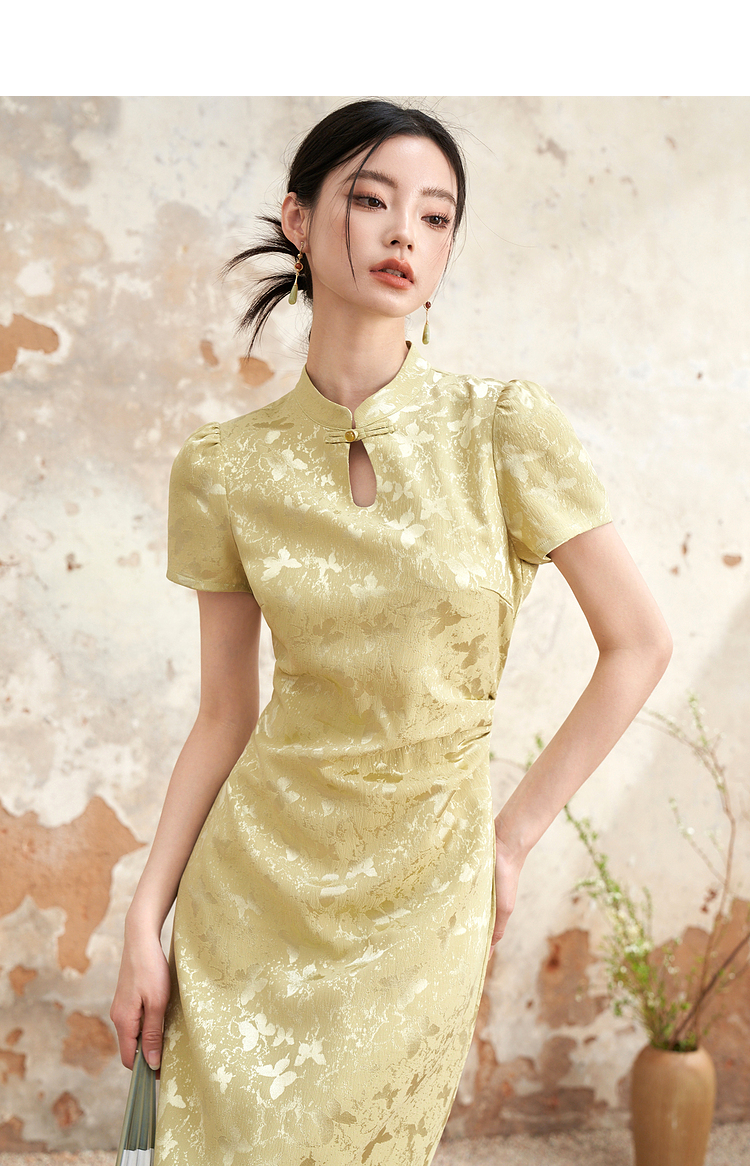 新中式国风旗袍领肌理提花连衣裙女夏季聚褶收腰开叉长裙V0041355