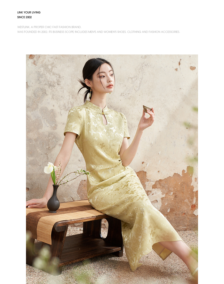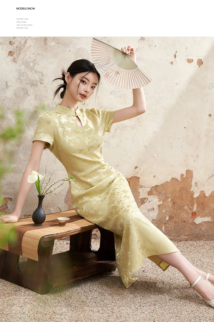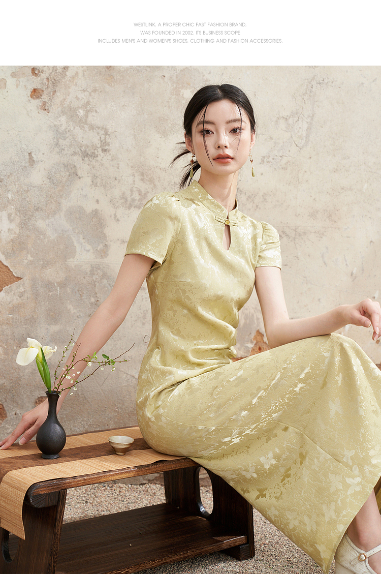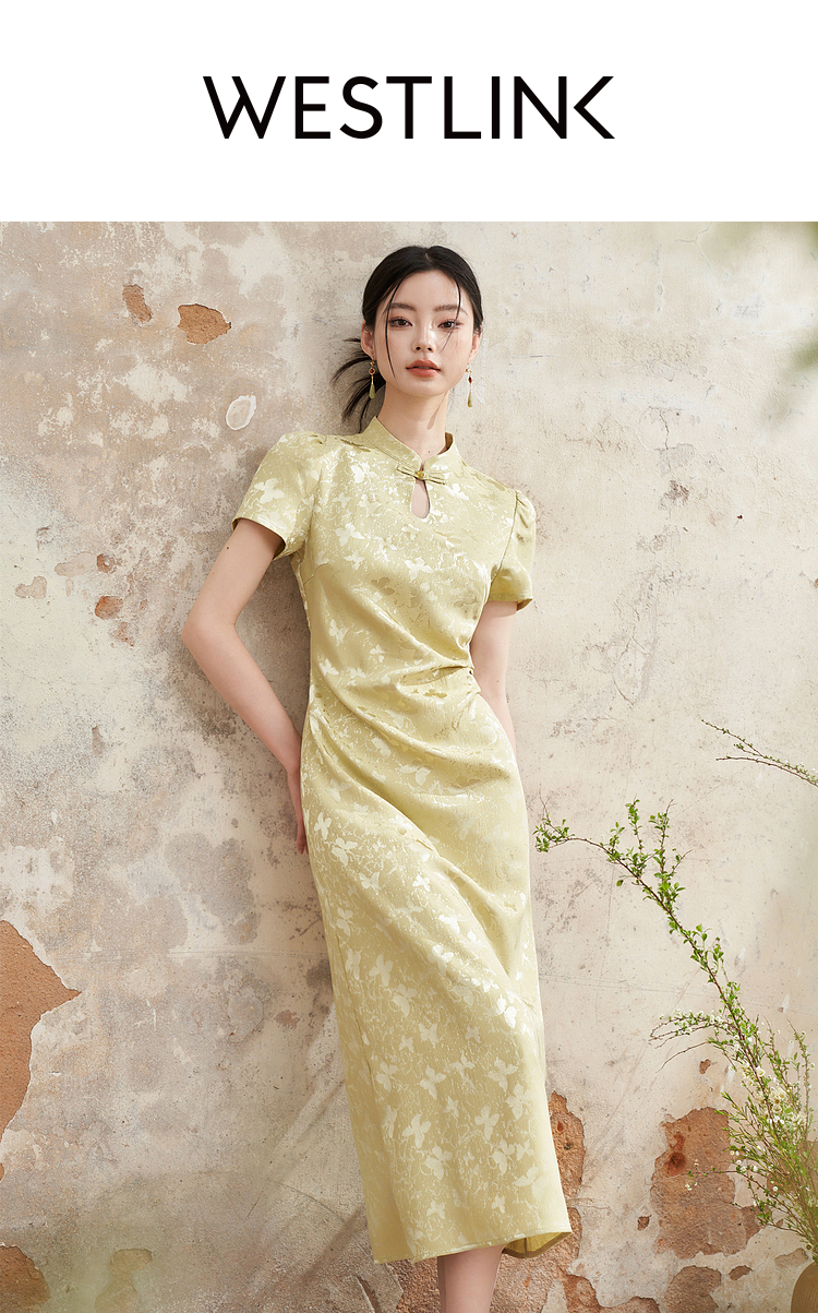 新中式国风旗袍领肌理提花连衣裙女夏季聚褶收腰开叉长裙V0041355