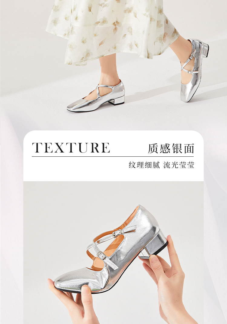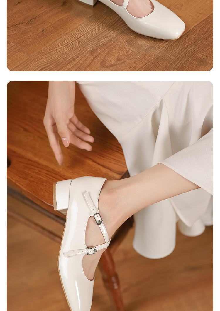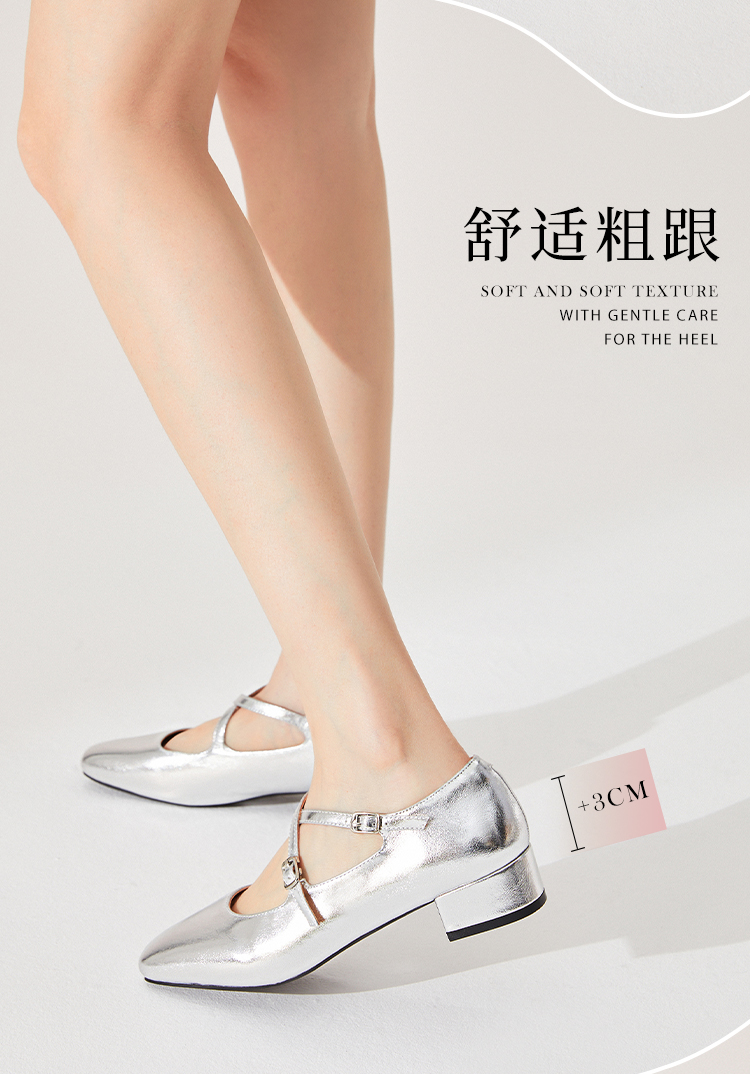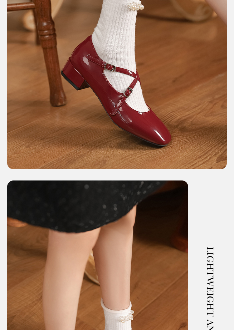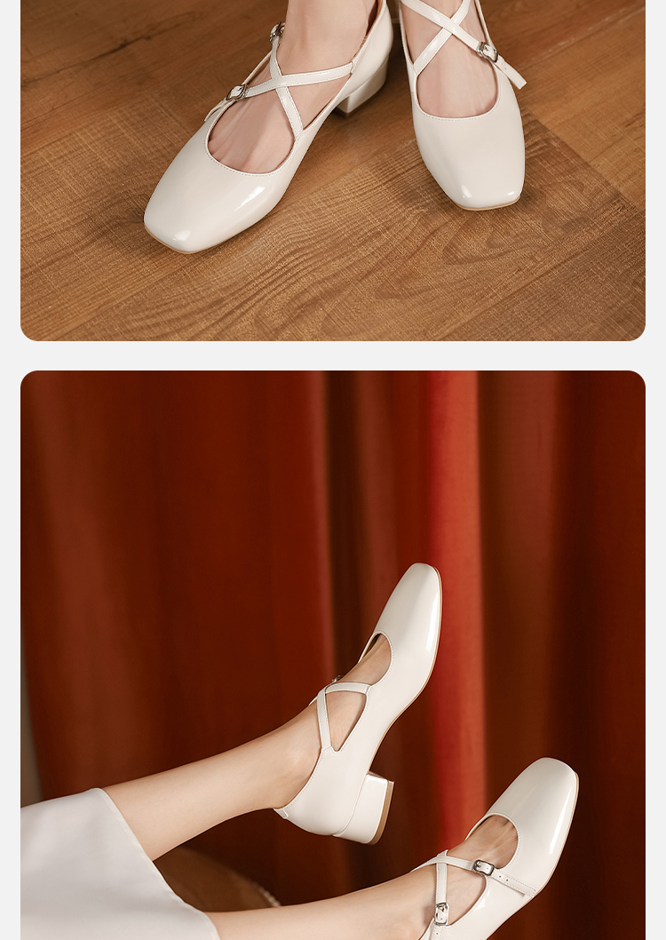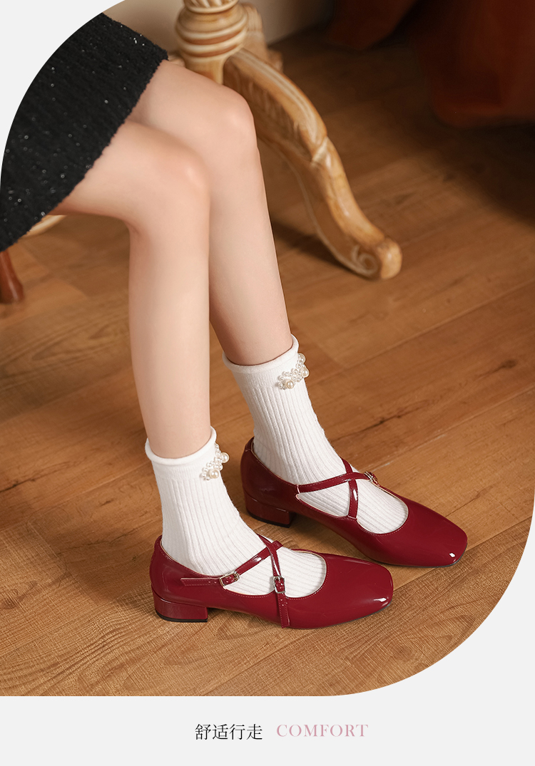 西遇法式粗跟单鞋女新款方头交叉绑带漆皮低跟浅口鞋D1333559