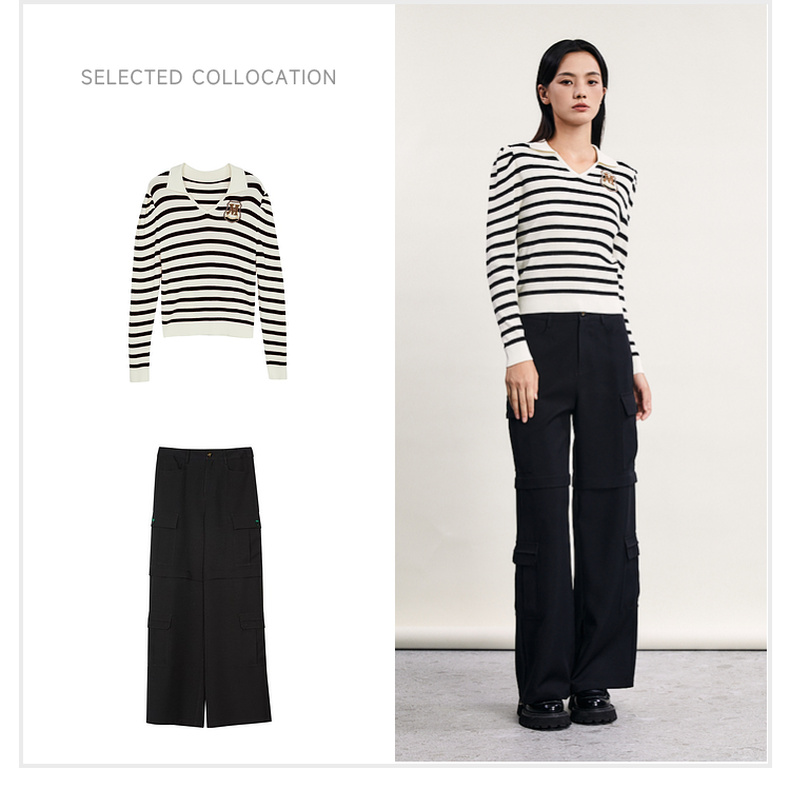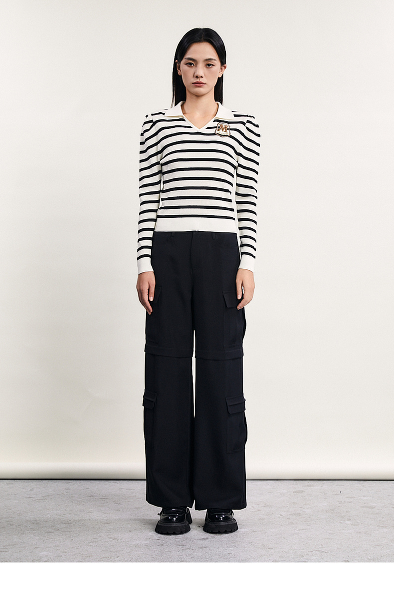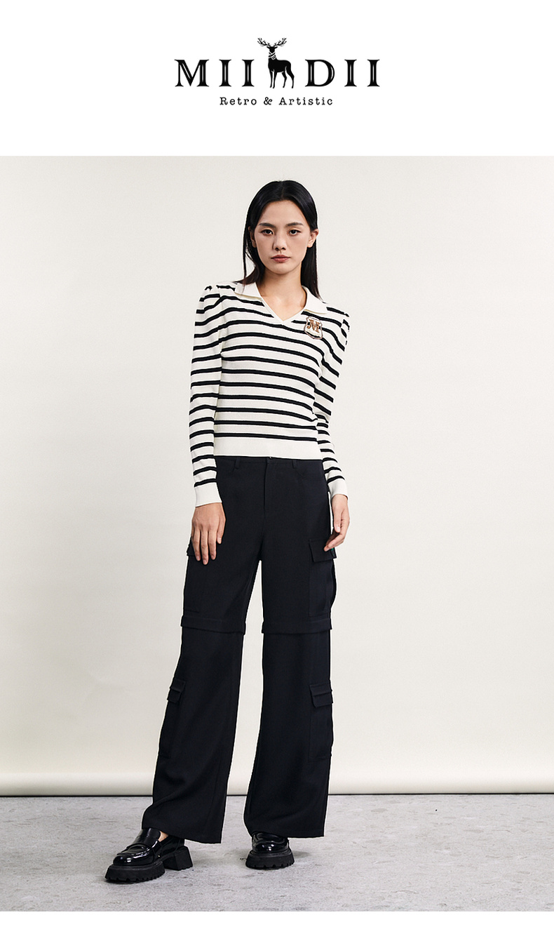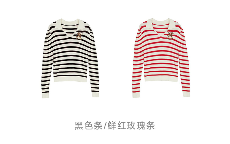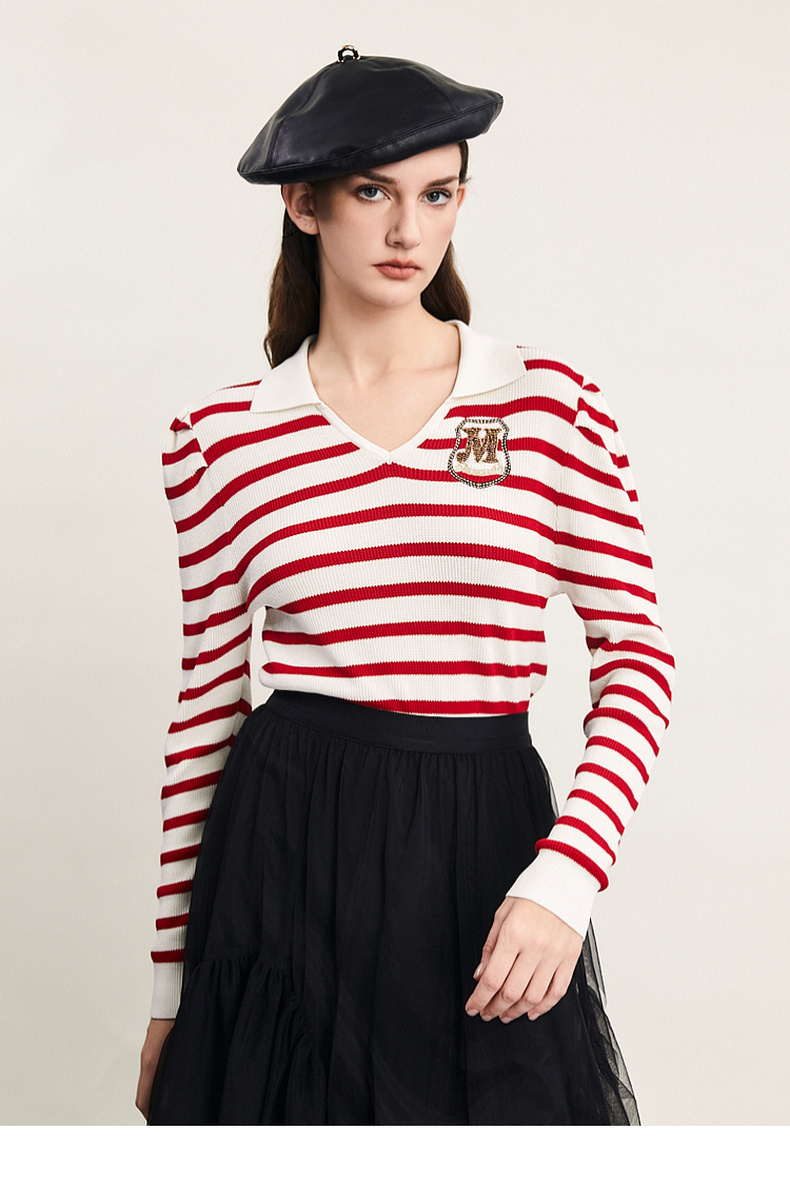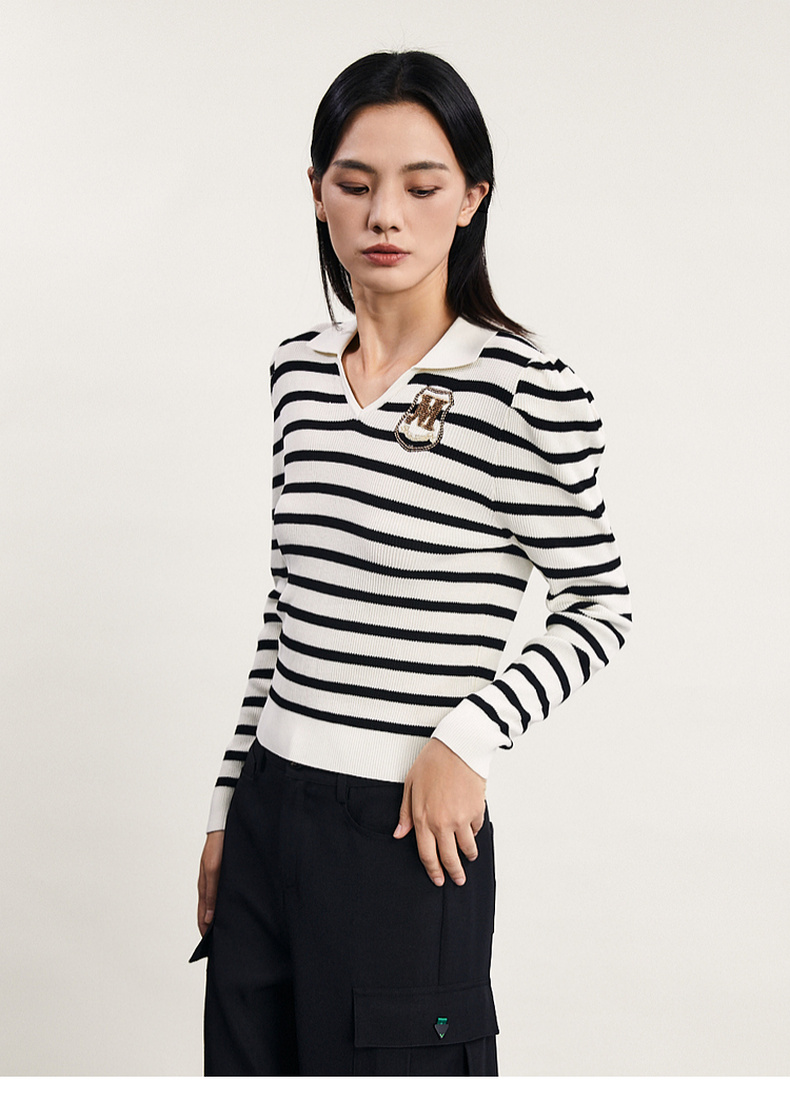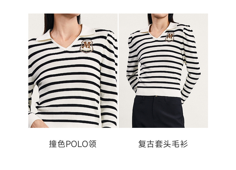 谜底翻领套头针织衫女2024春季新款学院风条纹修身毛衣241MZ0351