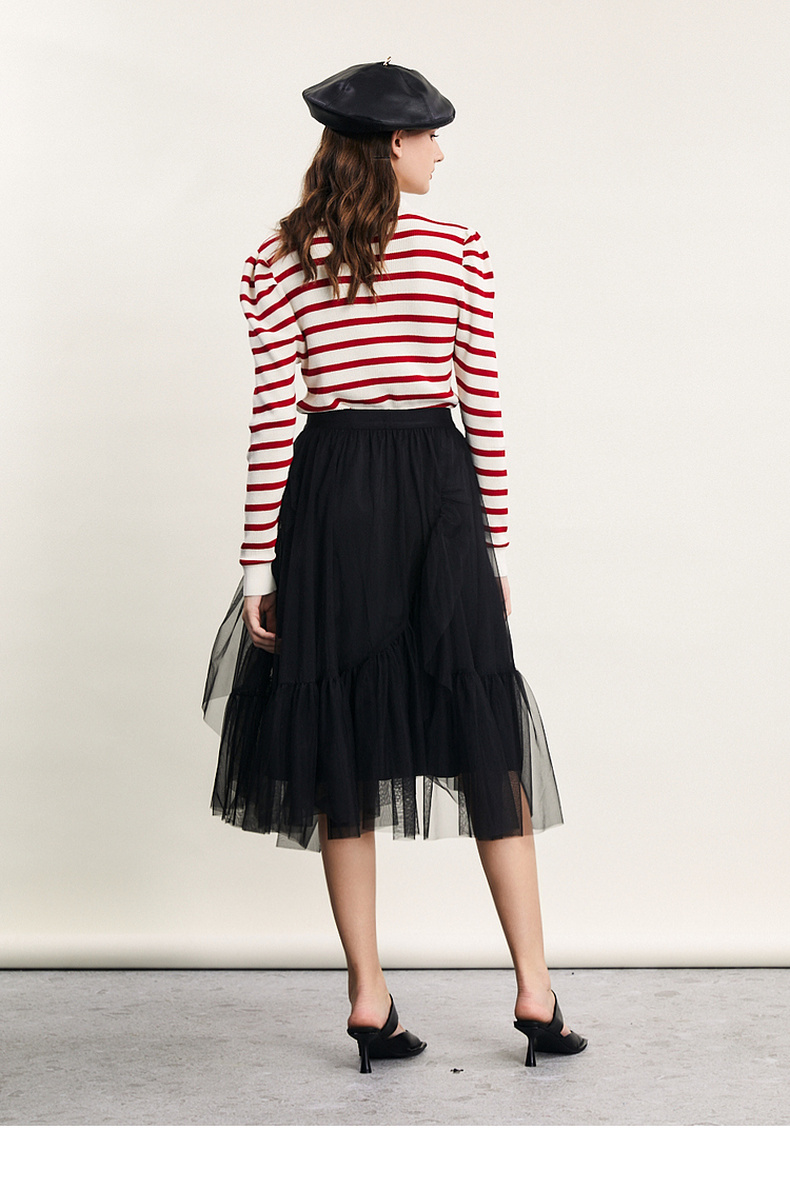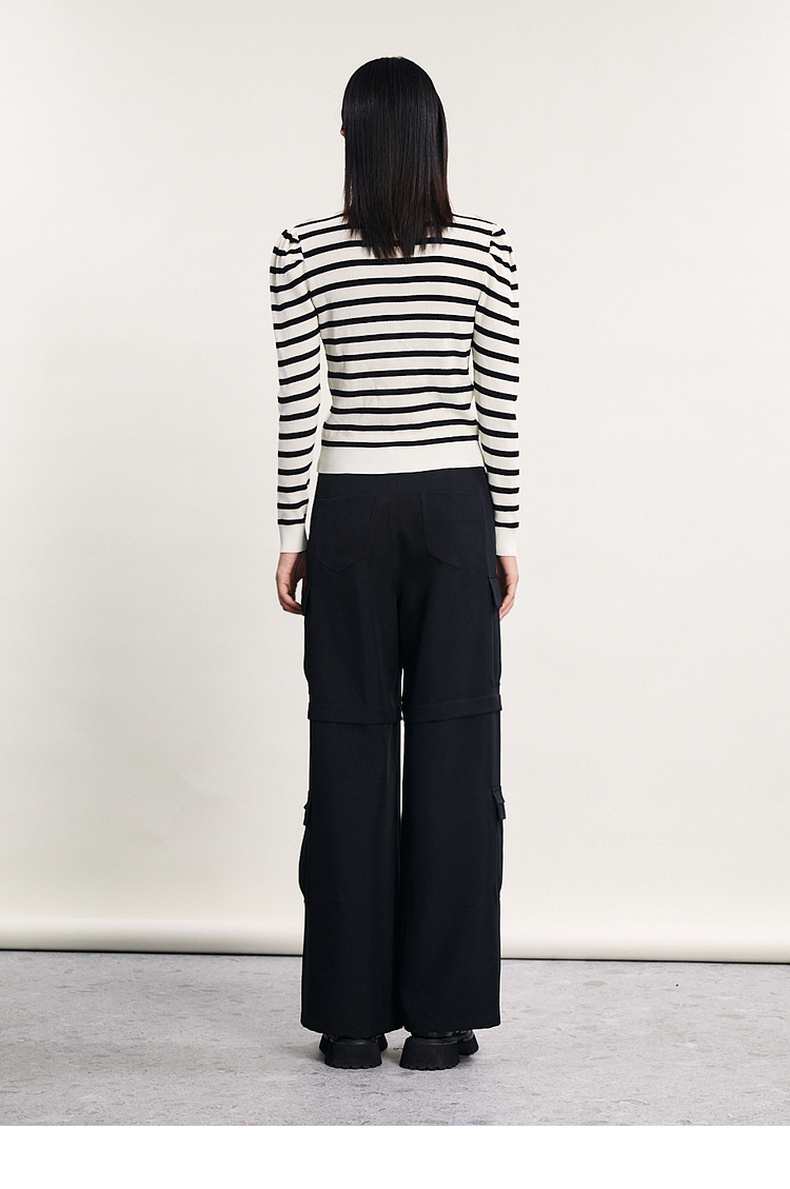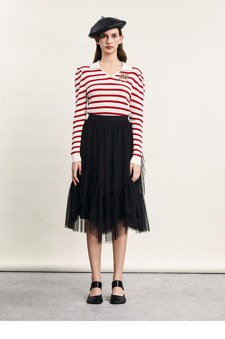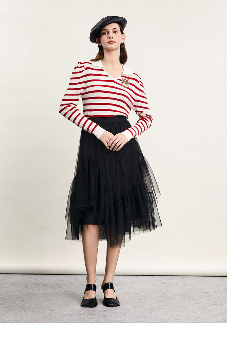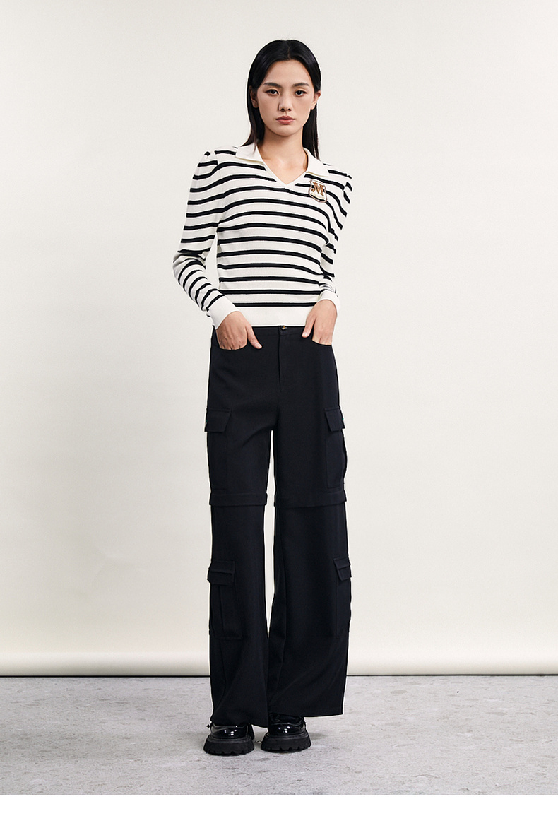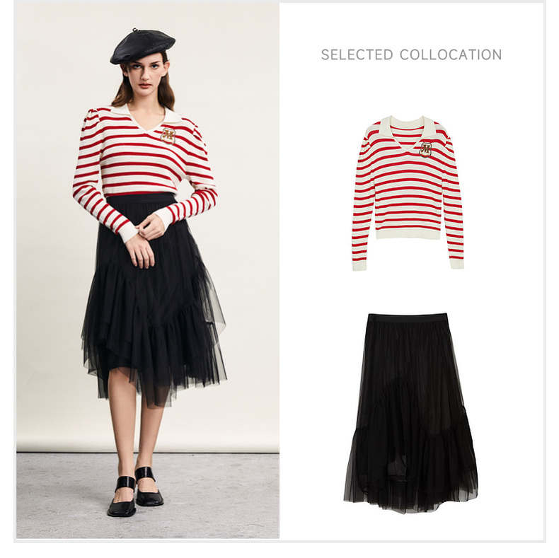 谜底翻领套头针织衫女2024春季新款学院风条纹修身毛衣241MZ0351