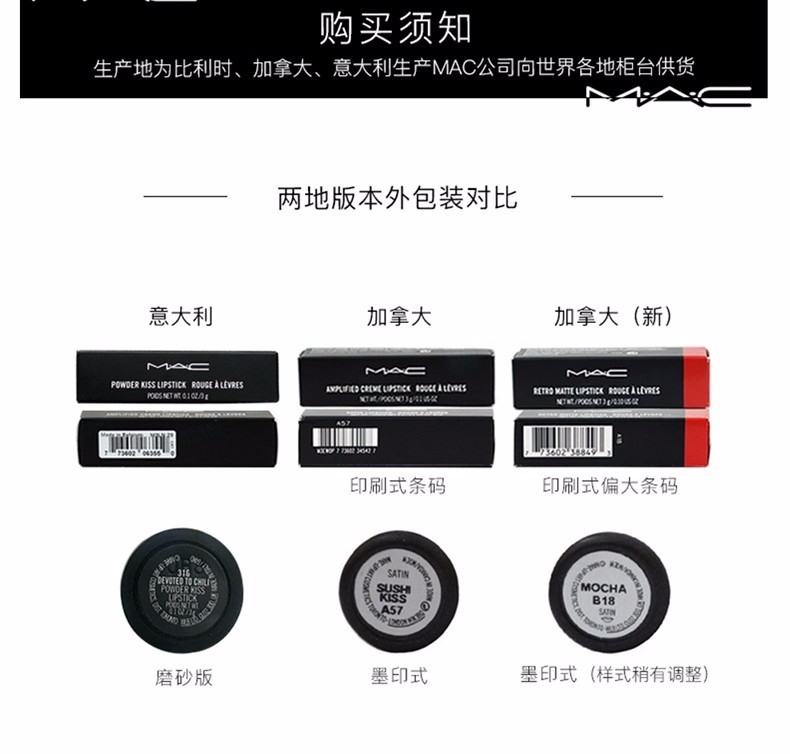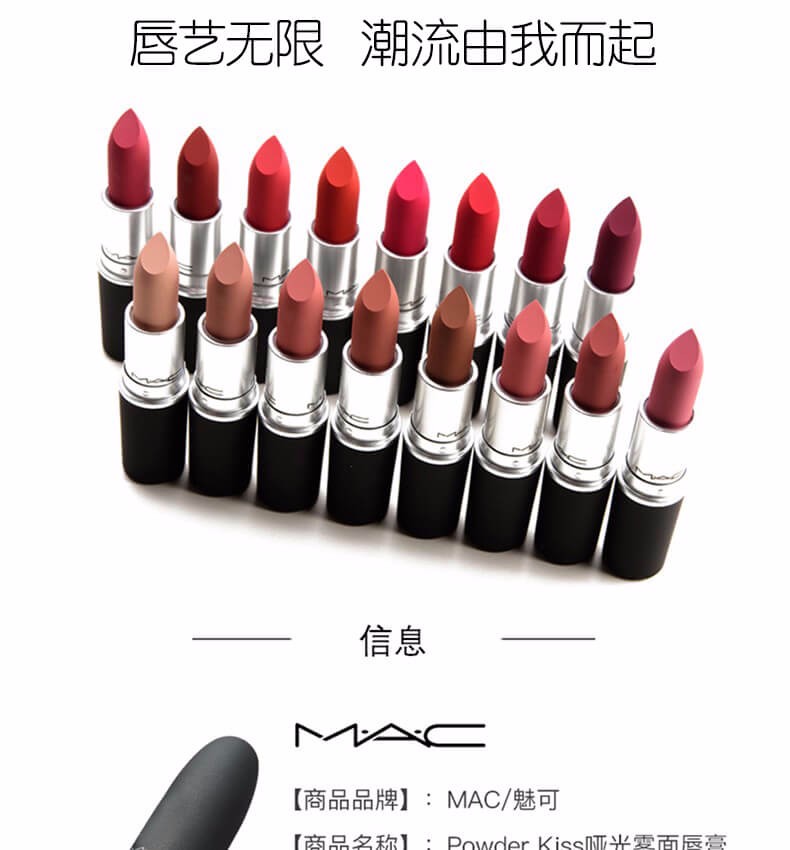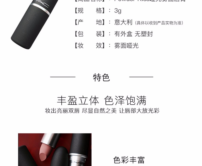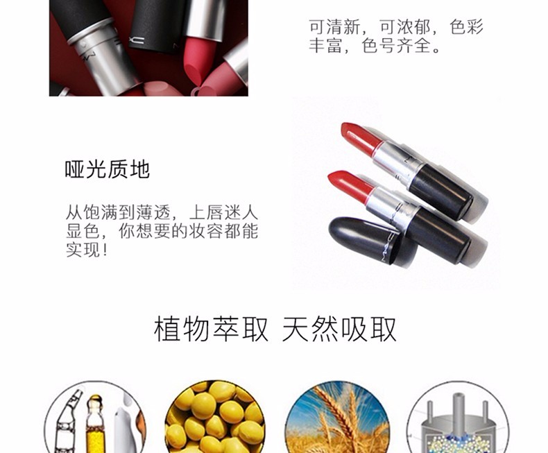 MAC子弹头新款,丰盈立体,色泽饱满,用色丰富,哑光质地。植物萃取成分,富含神经酰胺酸3、大豆籽精华萃取、小麦胚芽萃取,通过JET-MILLED技术制作,涂抹柔滑细腻.