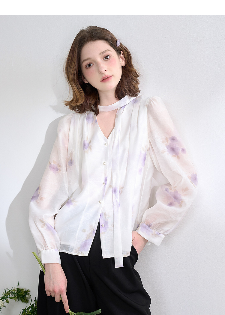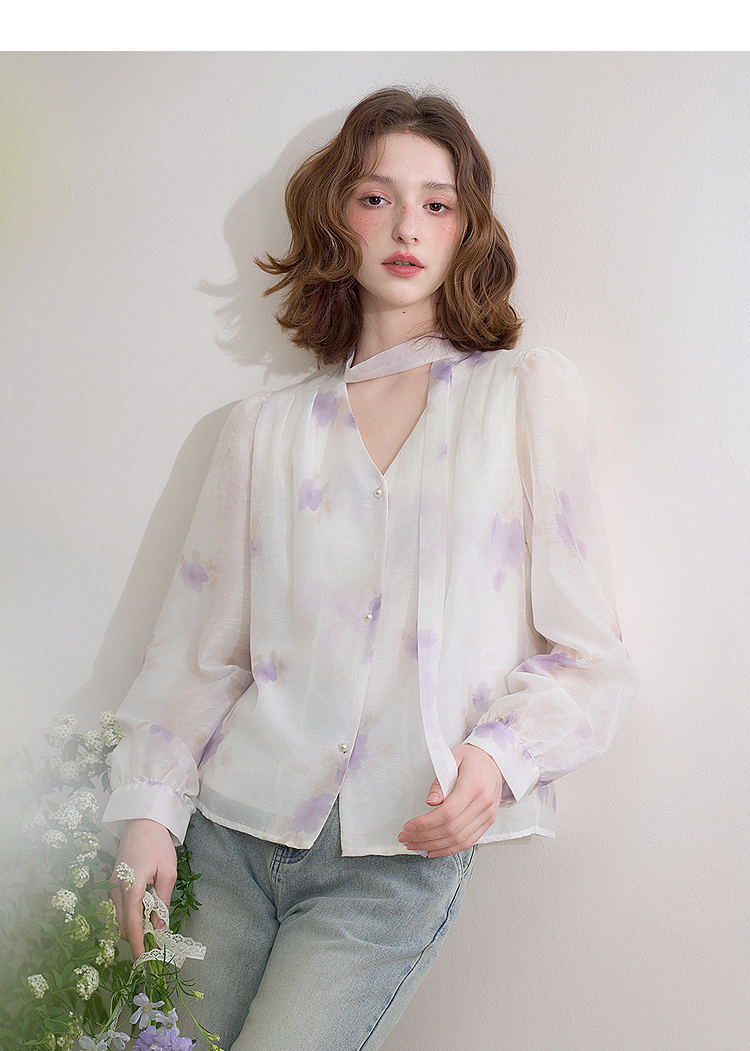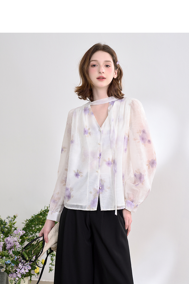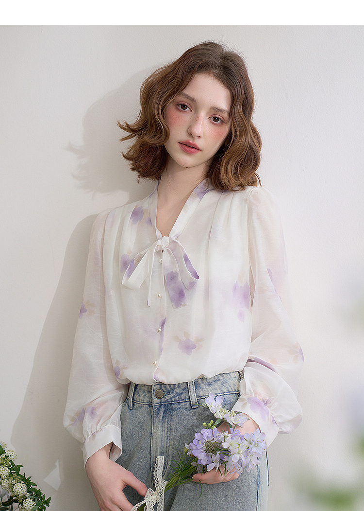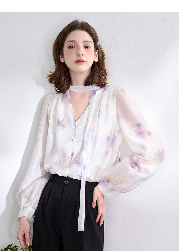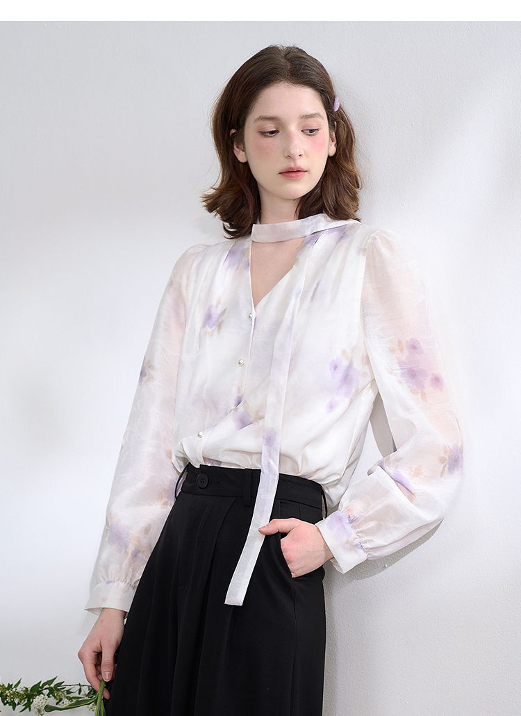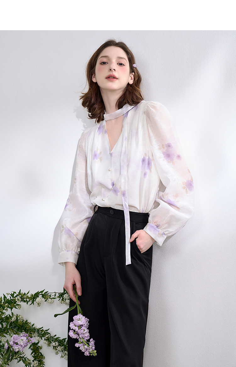 西遇法式v领衬衫女春夏新款宽松灯笼袖系带晕染碎花上衣D0050464