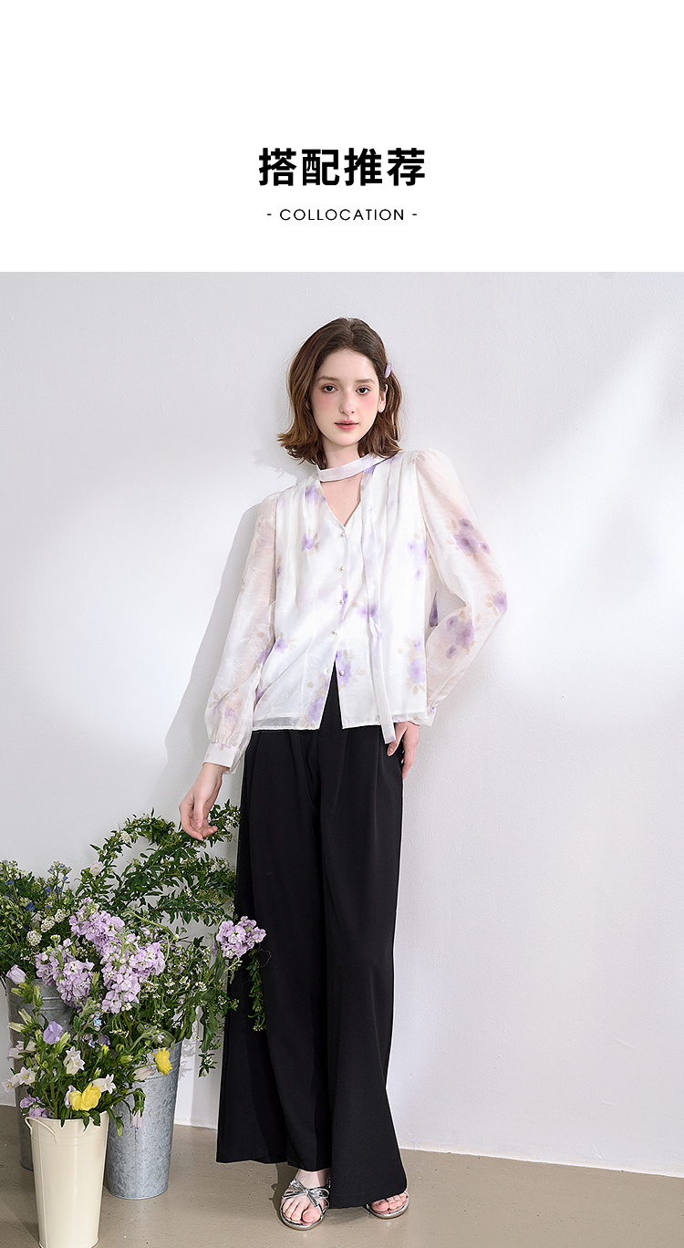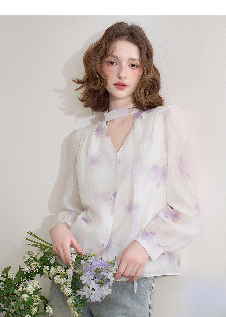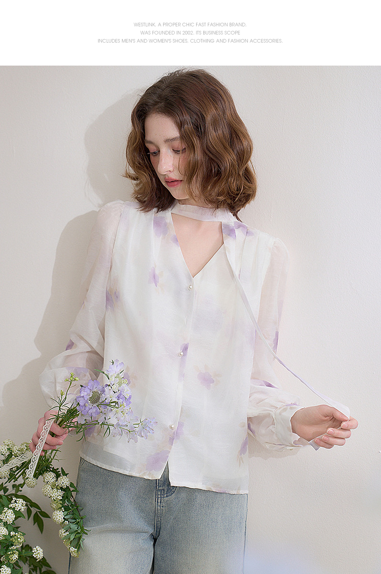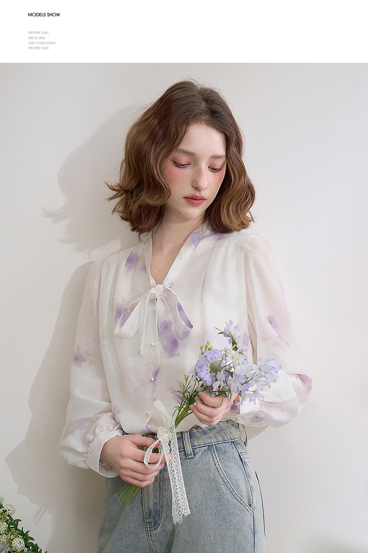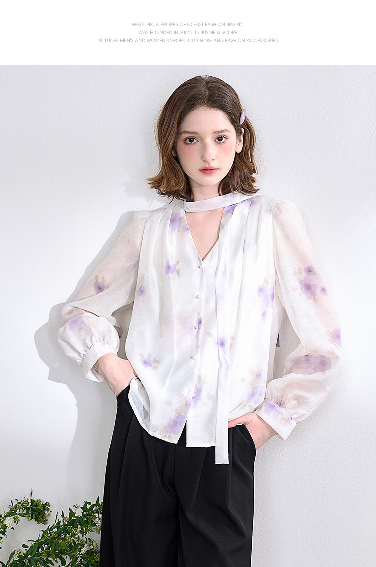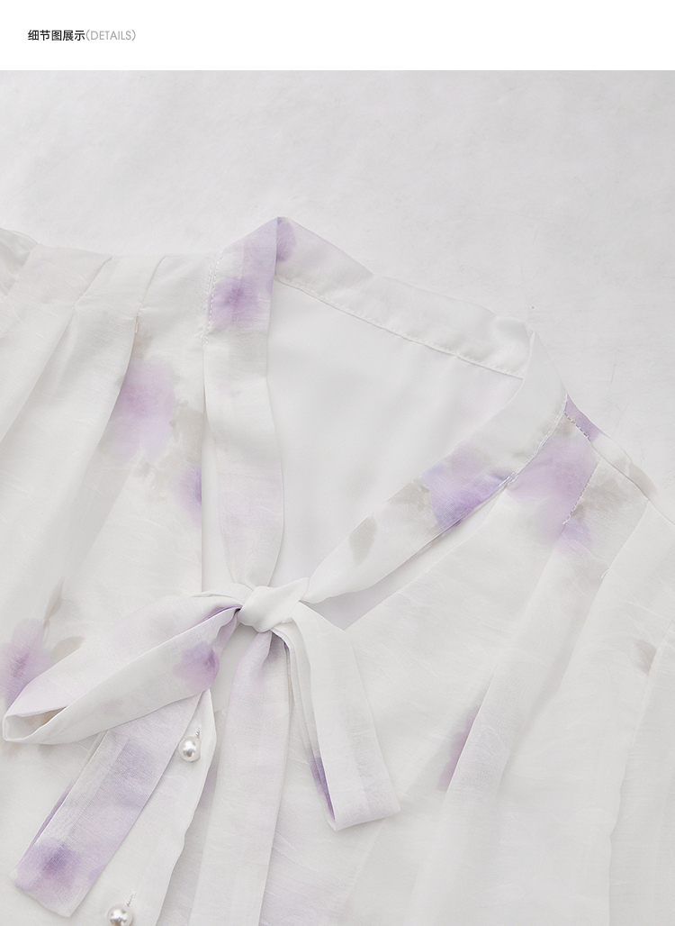 西遇法式v领衬衫女春夏新款宽松灯笼袖系带晕染碎花上衣D0050464
