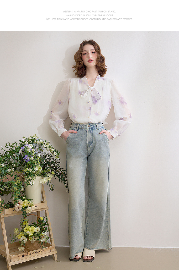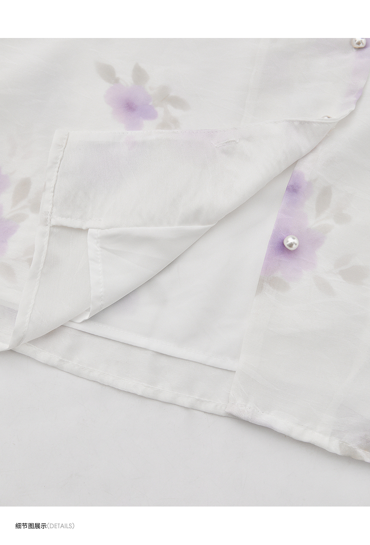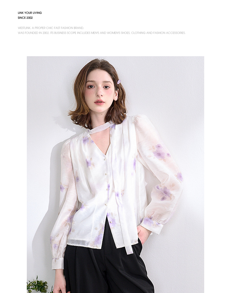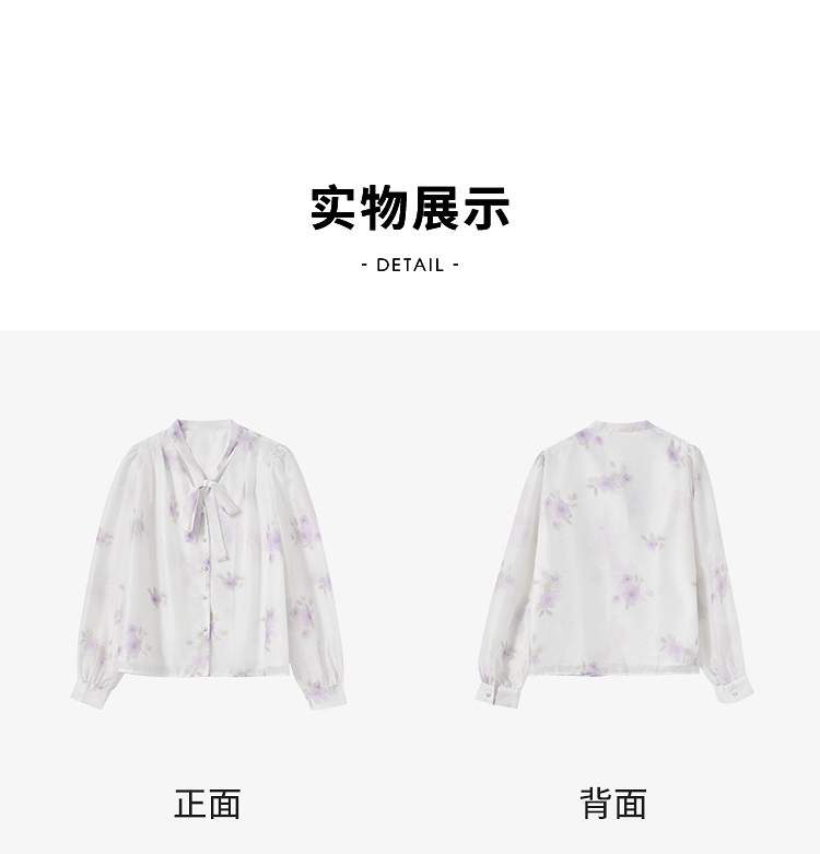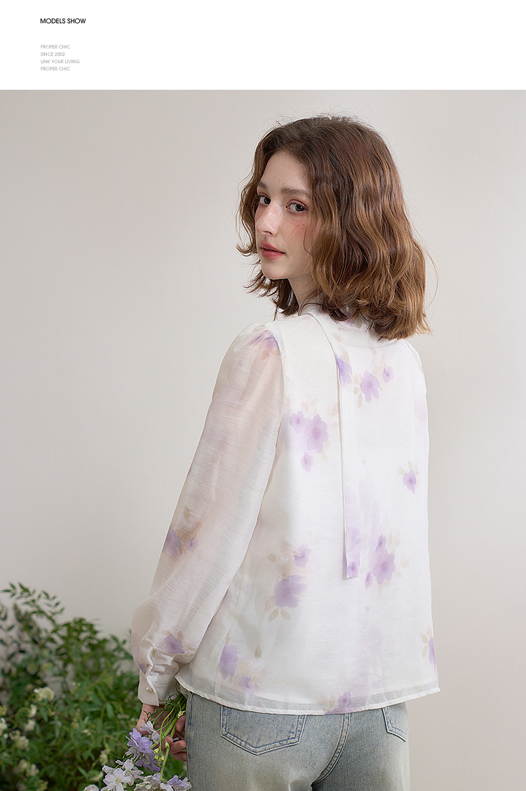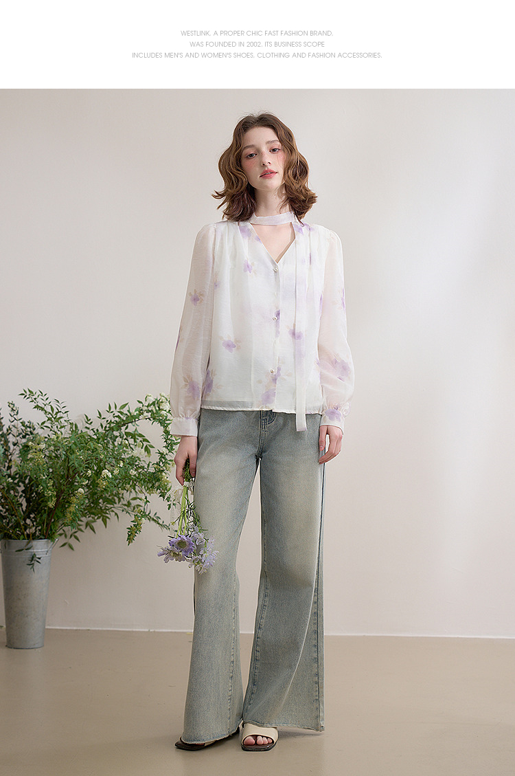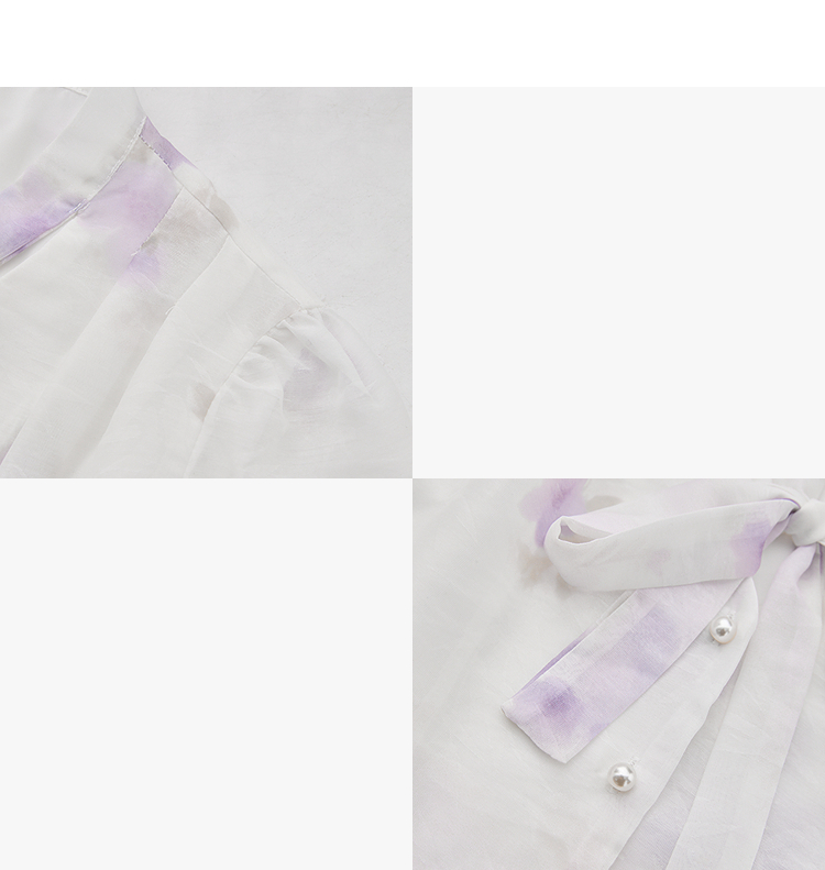 西遇法式v领衬衫女春夏新款宽松灯笼袖系带晕染碎花上衣D0050464