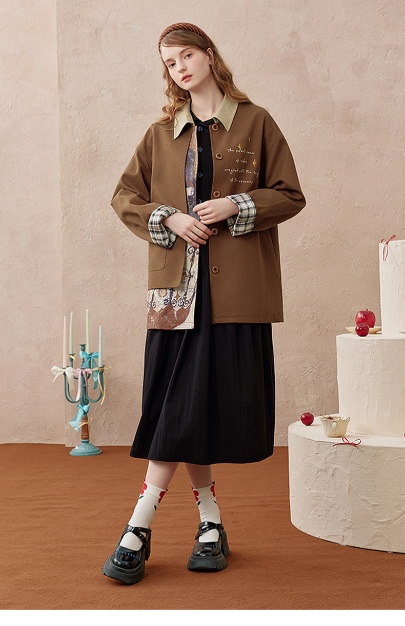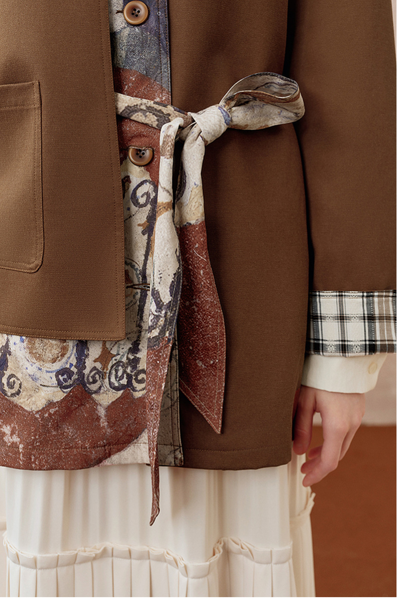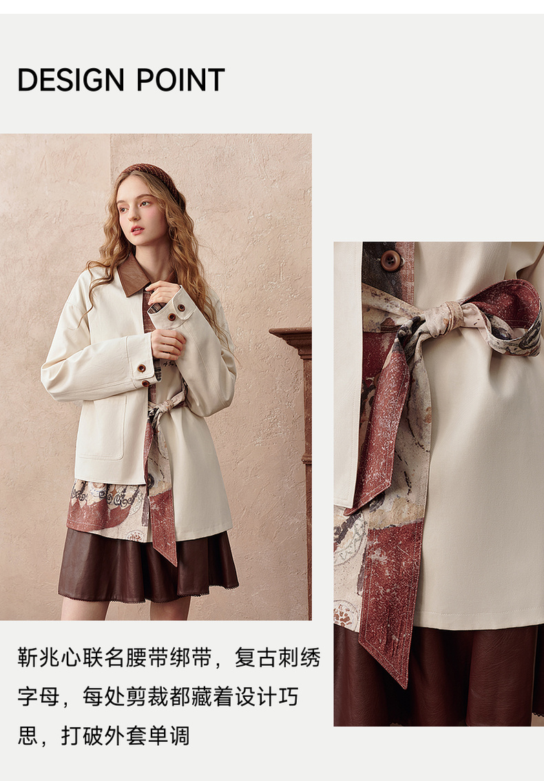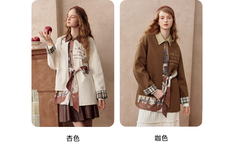 两三事 微醺奇域 2025秋季新款复古印花拼接绑带刺绣外套女宽松