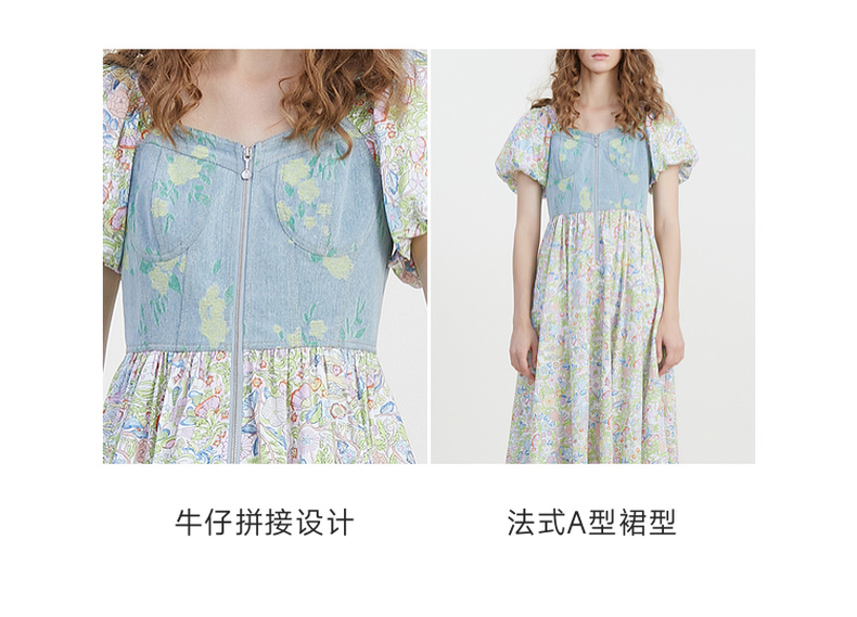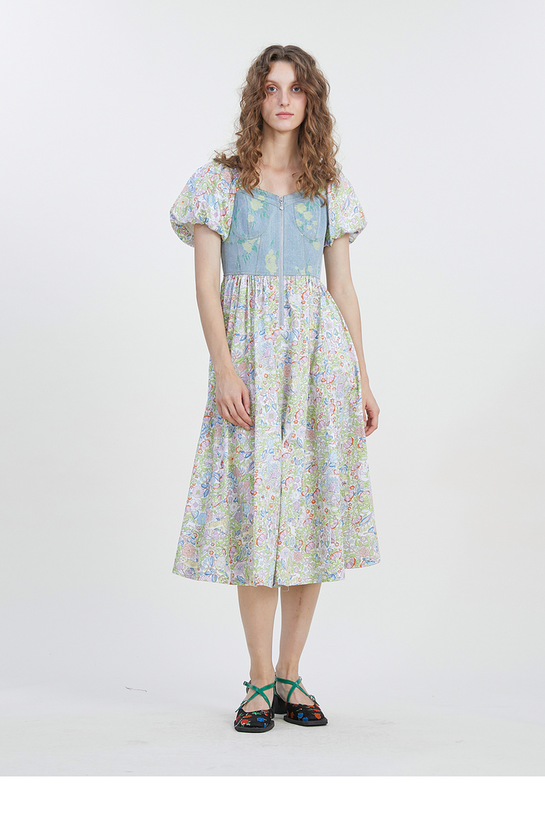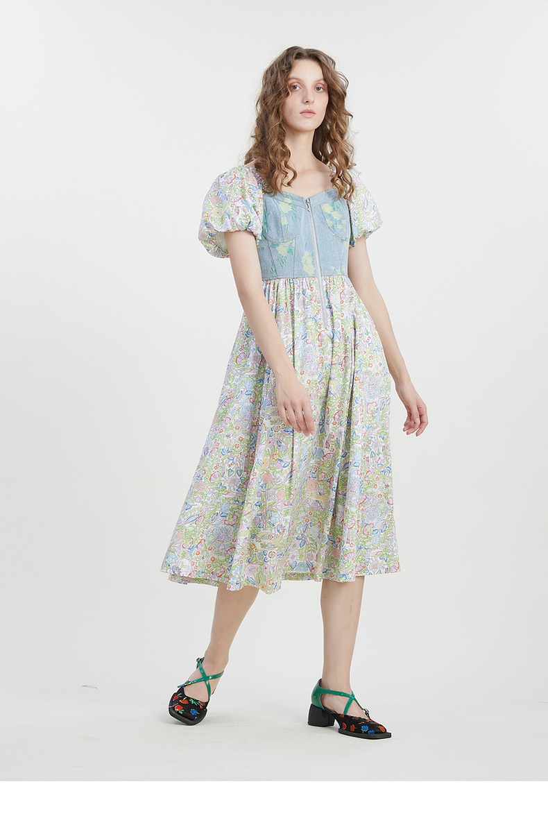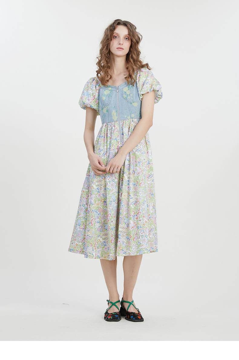 谜底碎花连衣裙短袖2023夏新款文艺拼接修身中长裙短袖232ML0543