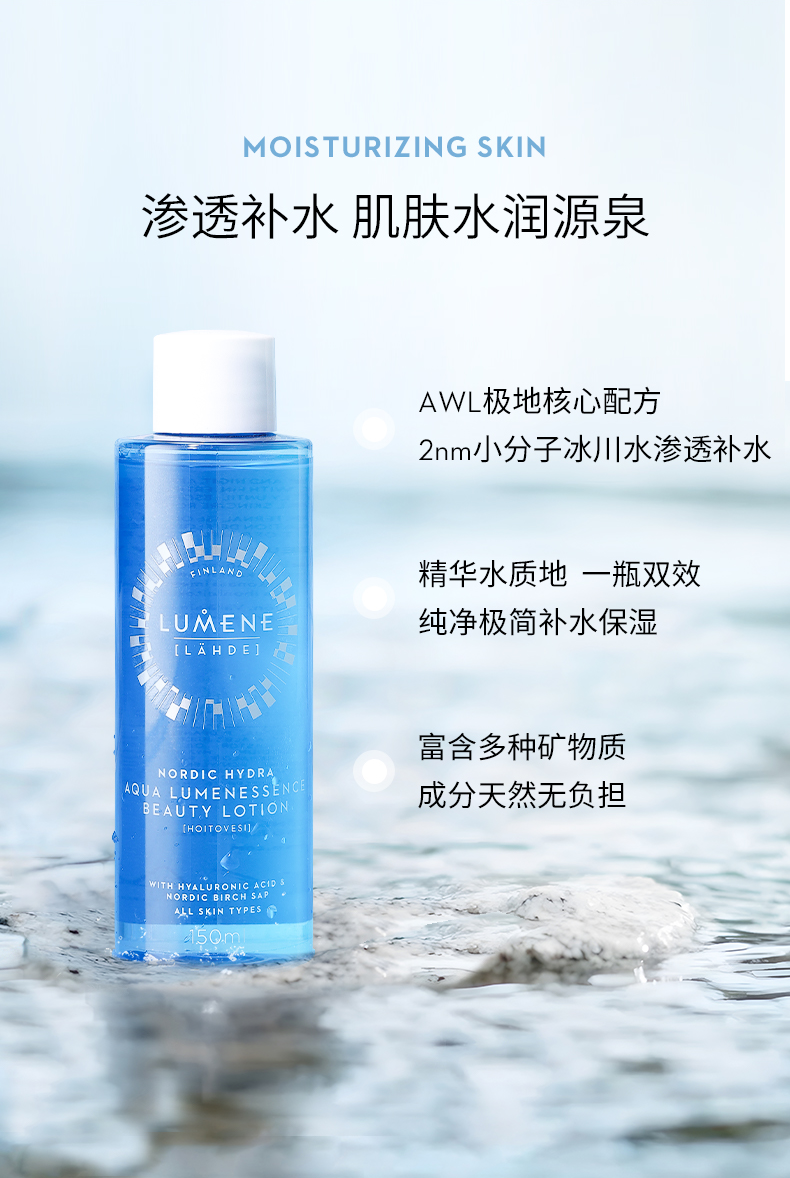 LUMENE的保湿精华水,添加了精华的成分,比普通的化妆水更滋润,一瓶兼补水+精华的效果,帮助皮肤打开补水的通道,促进后续护肤品的吸收。