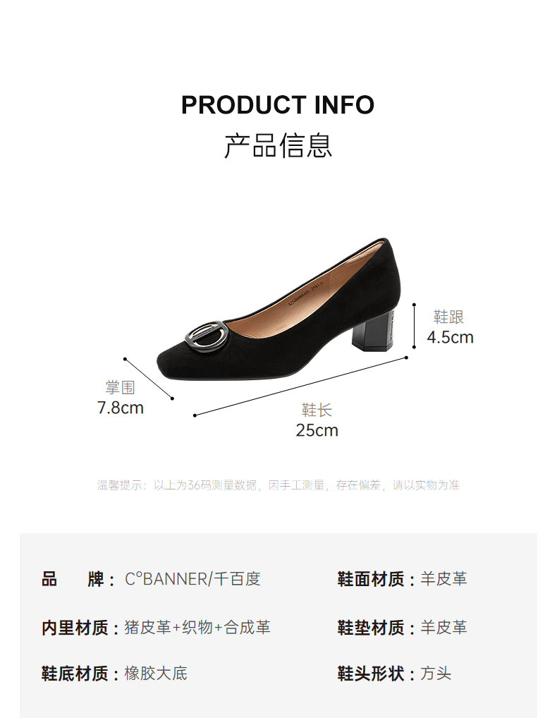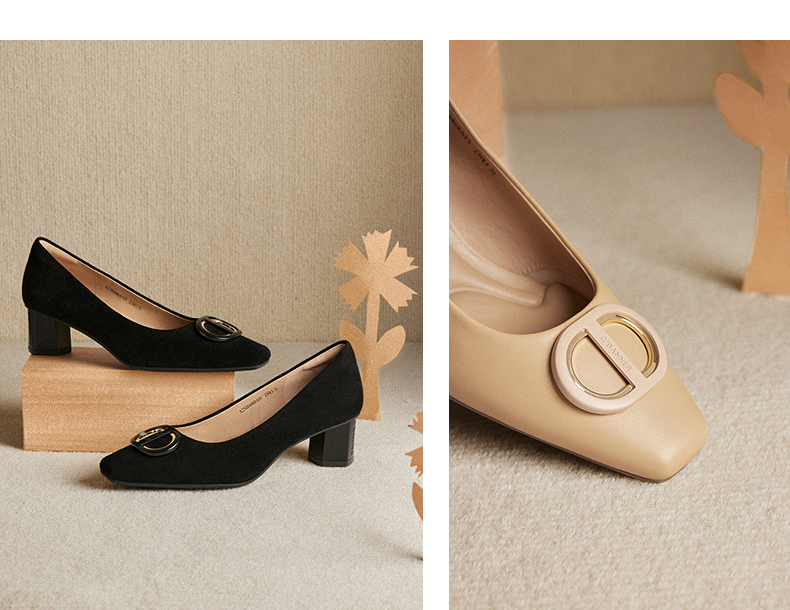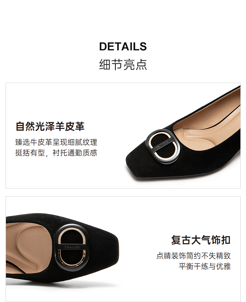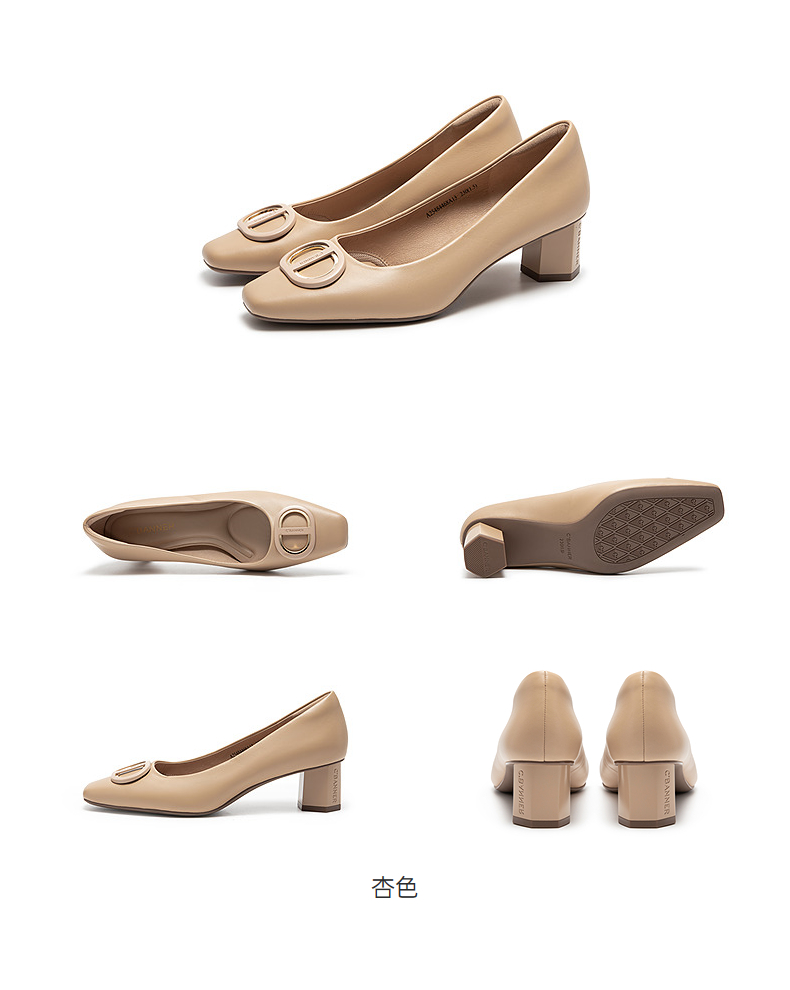 千百度羊皮粗高跟鞋女中跟扣饰通勤气质法式浅口单鞋A25484468