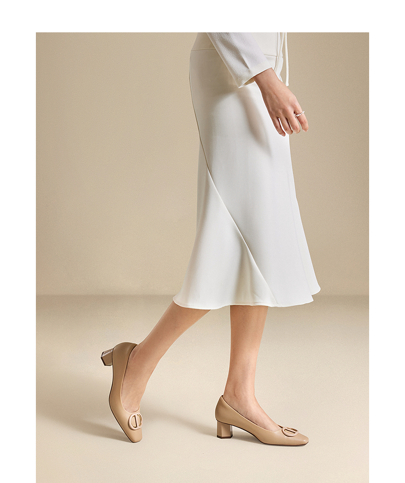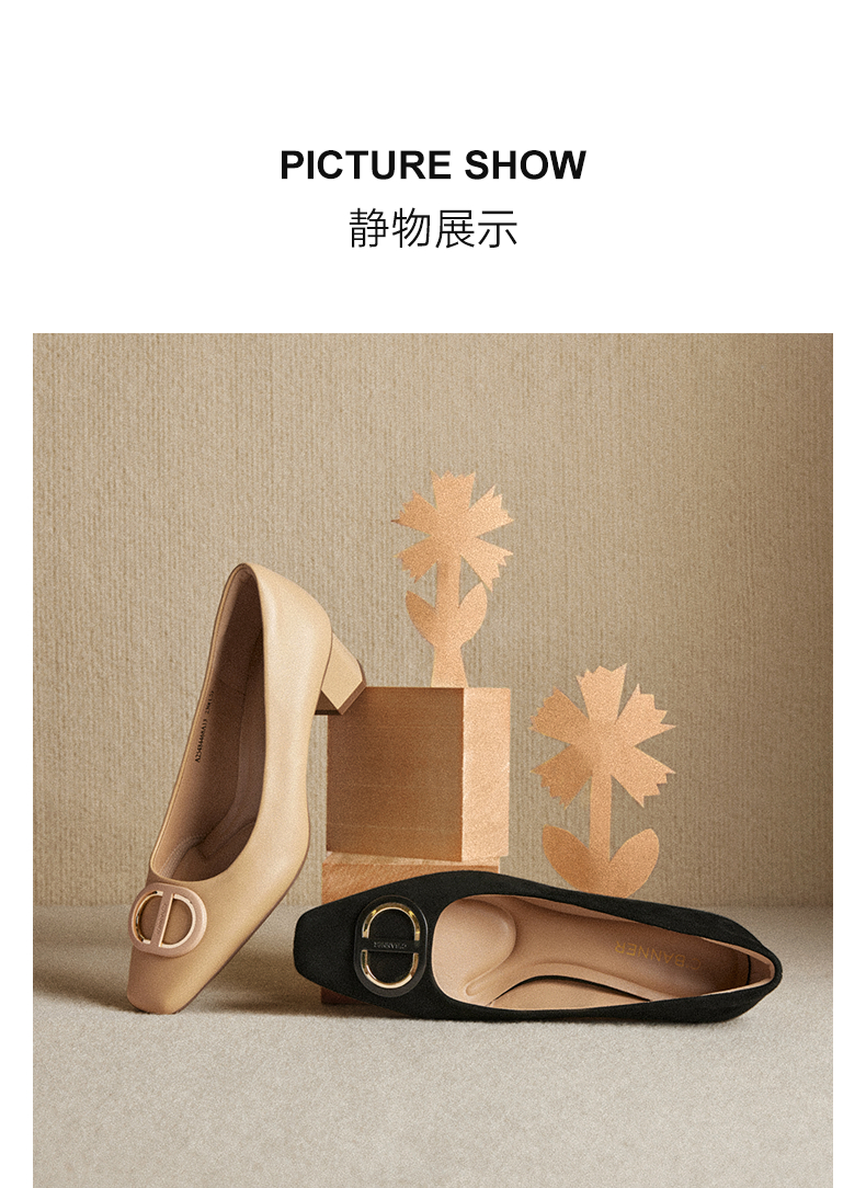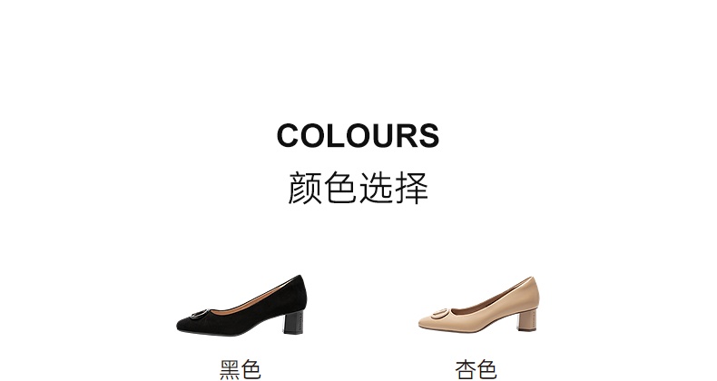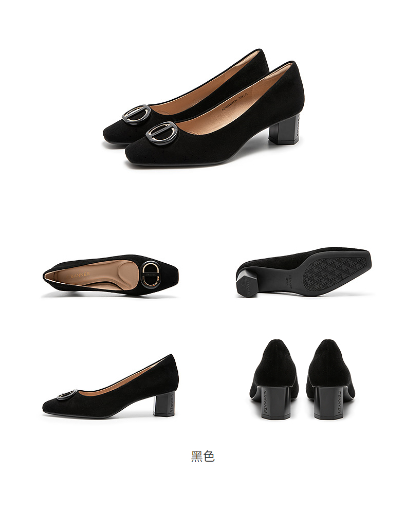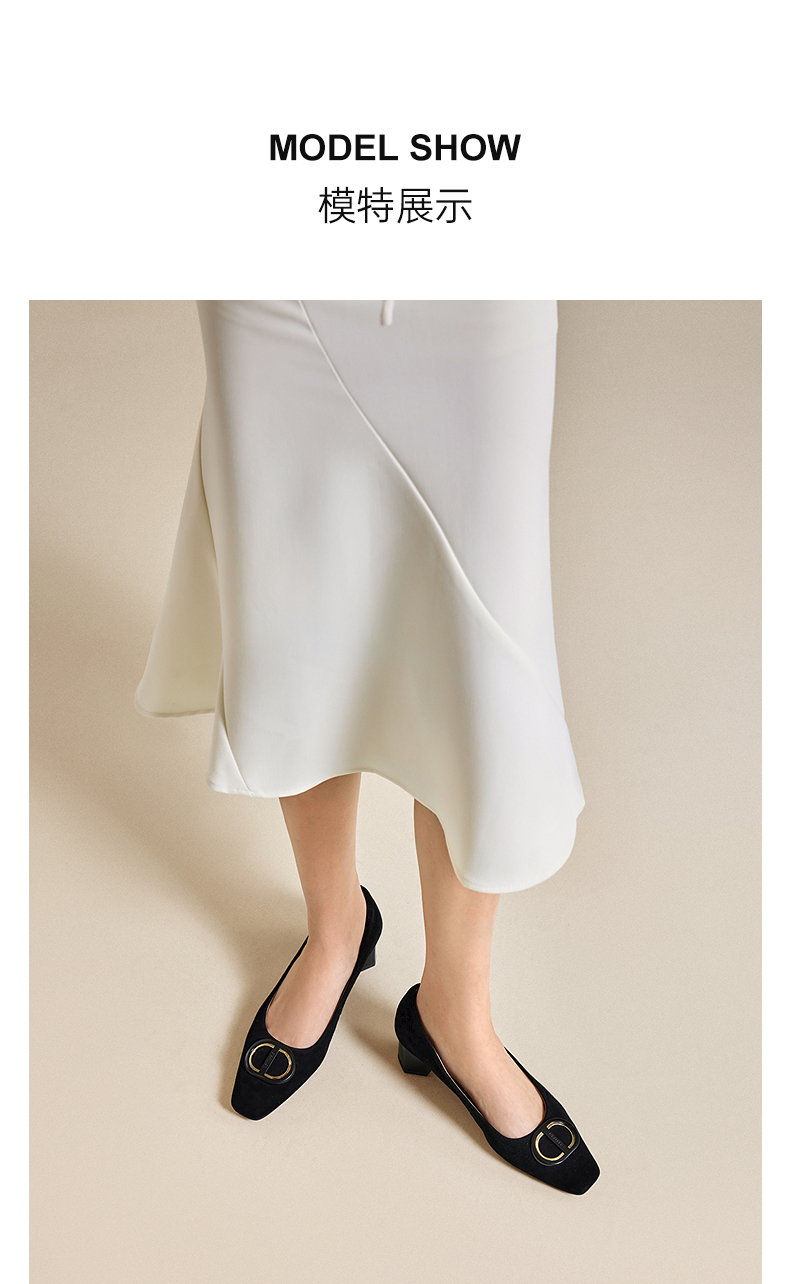 千百度羊皮粗高跟鞋女中跟扣饰通勤气质法式浅口单鞋A25484468
