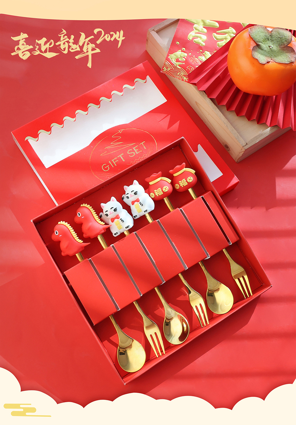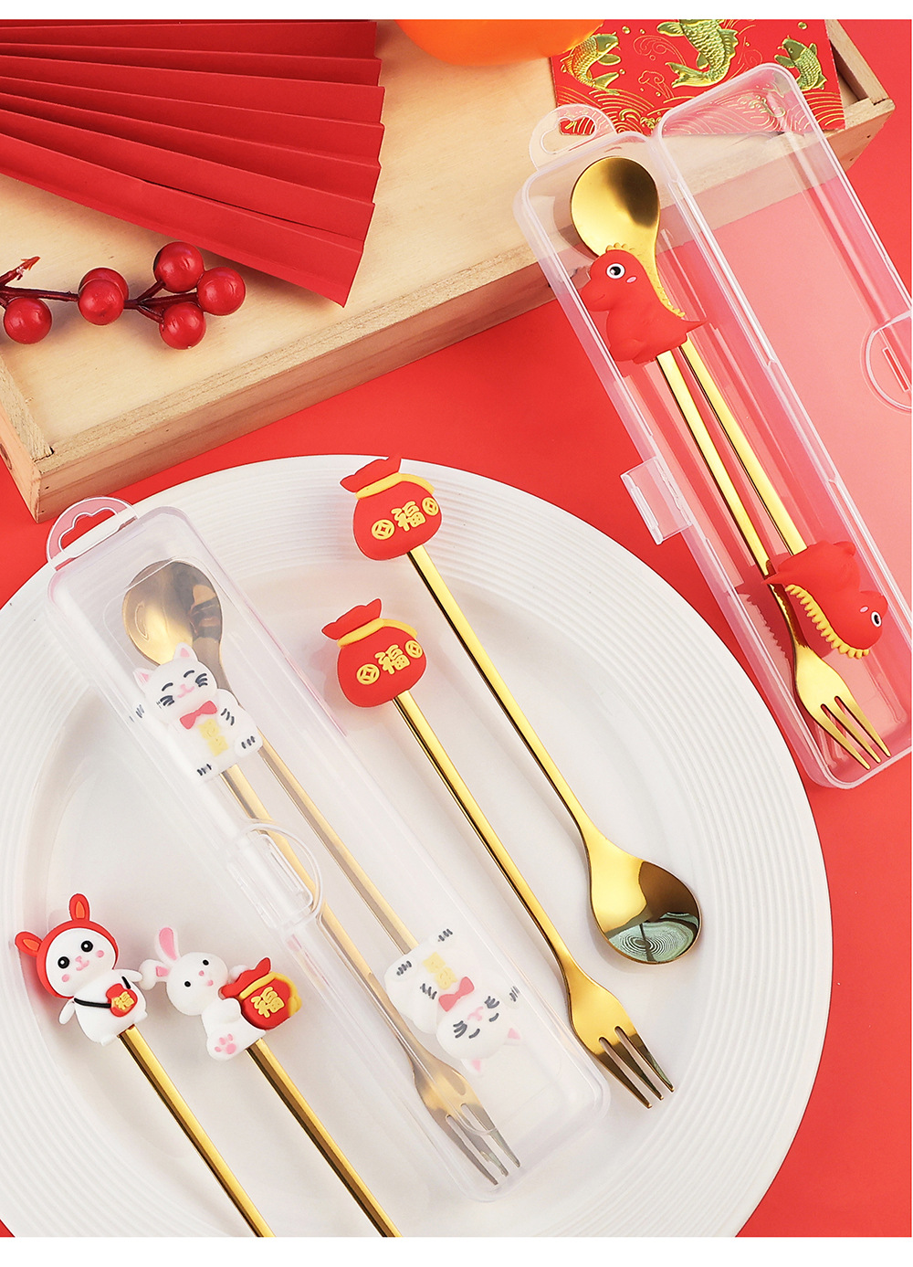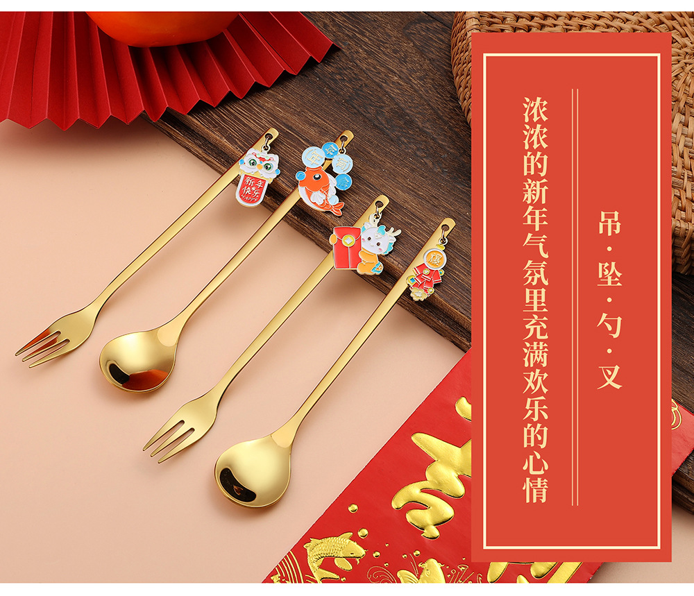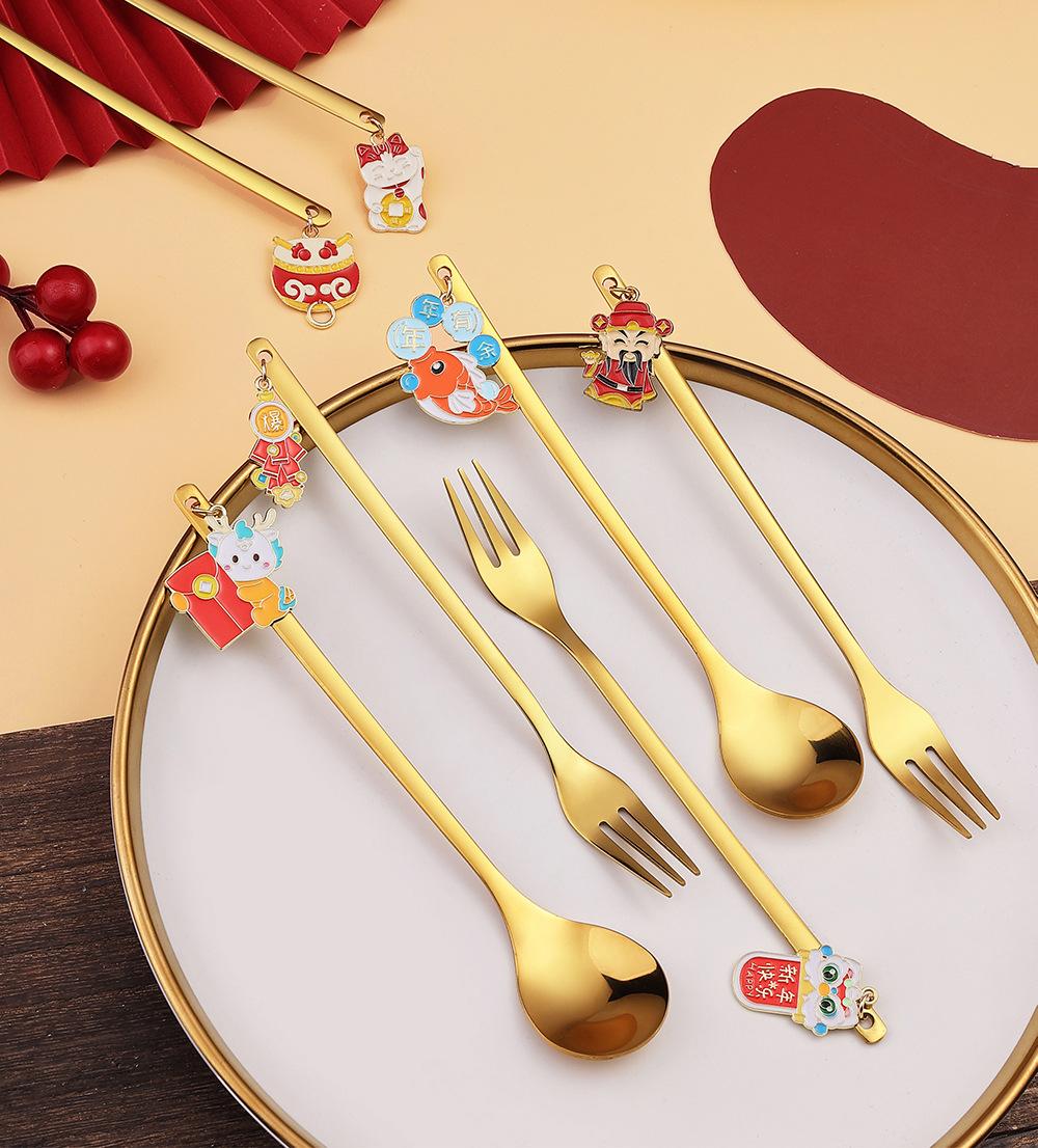 「6件套!新年佳礼」新年小礼物勺子餐具套装 咖啡勺水果叉小勺招财猫礼品公仔厨房用品餐饮用具