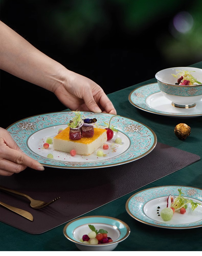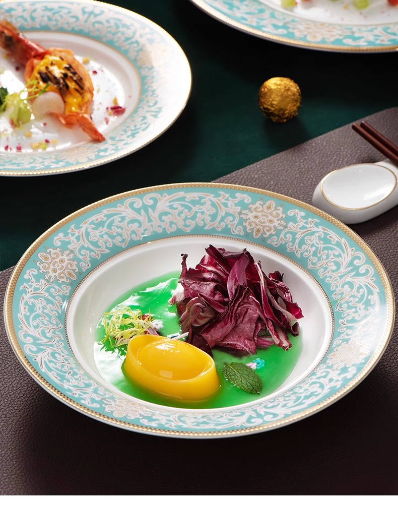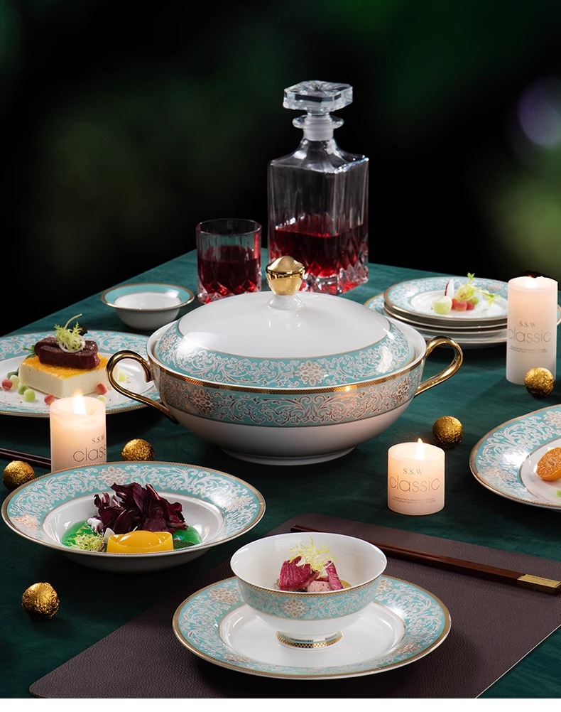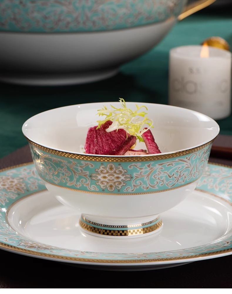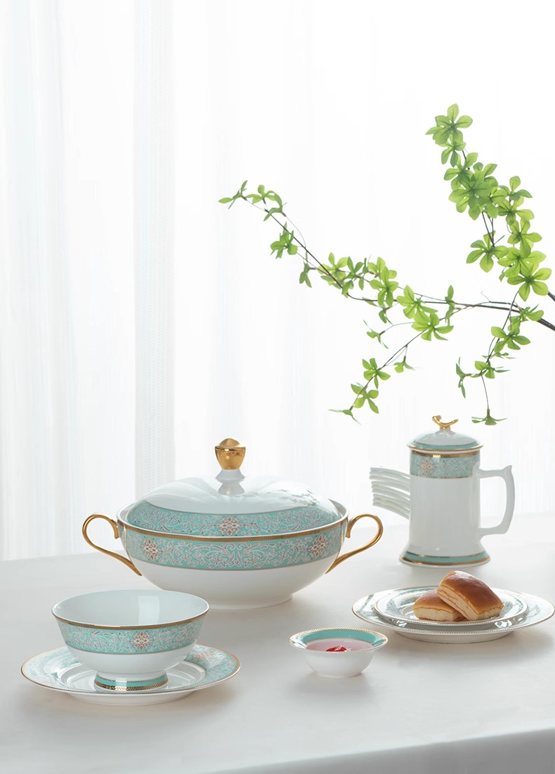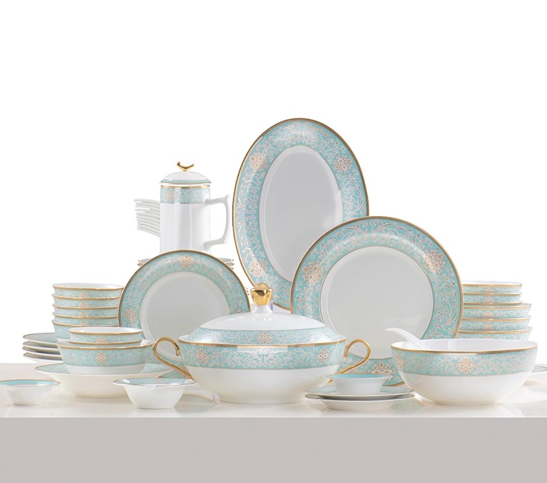 【样品特惠5.5折,无原包装仅1套,无货退款】雷澳娜高档骨瓷餐具碗碟套装家用欧式金边碗盘结婚礼品金域蓝湾10人用52头中餐具【不支持补差,非质量问题不退不换】S