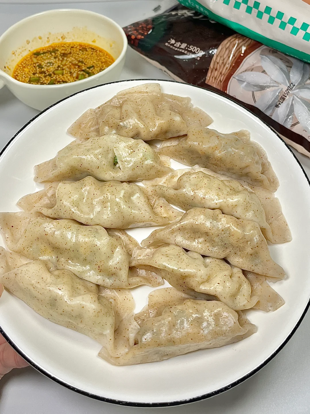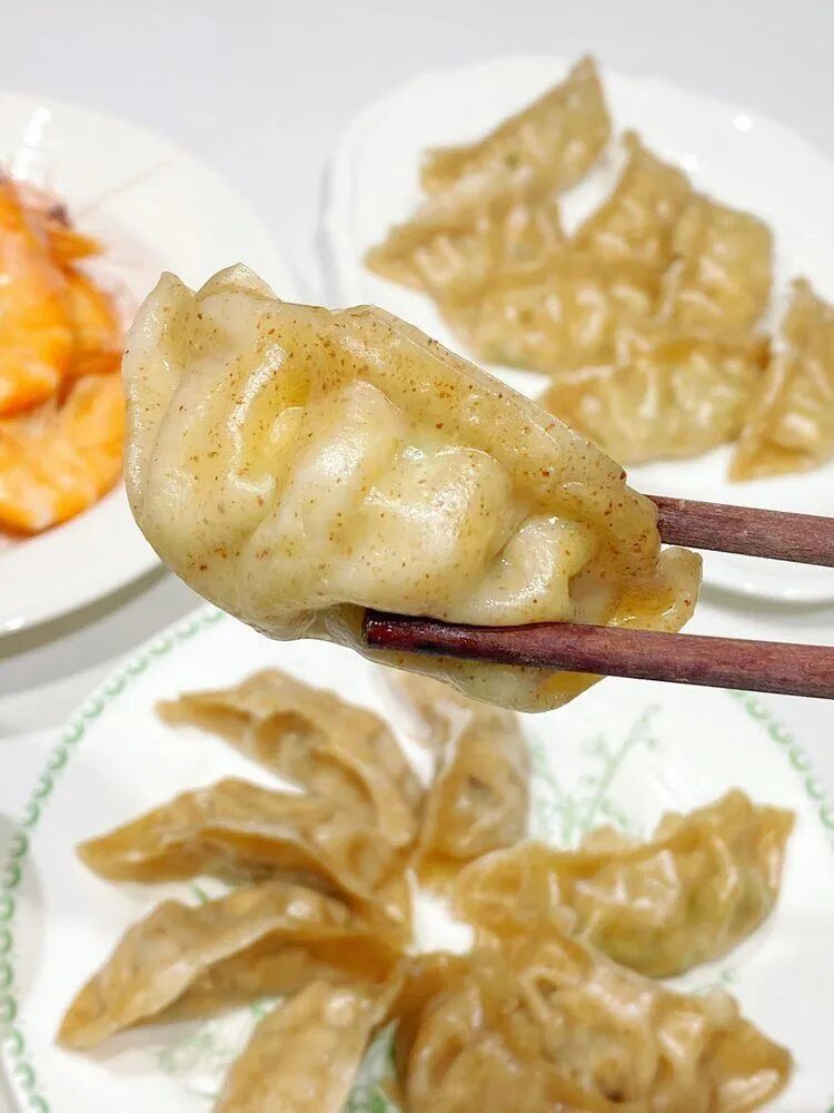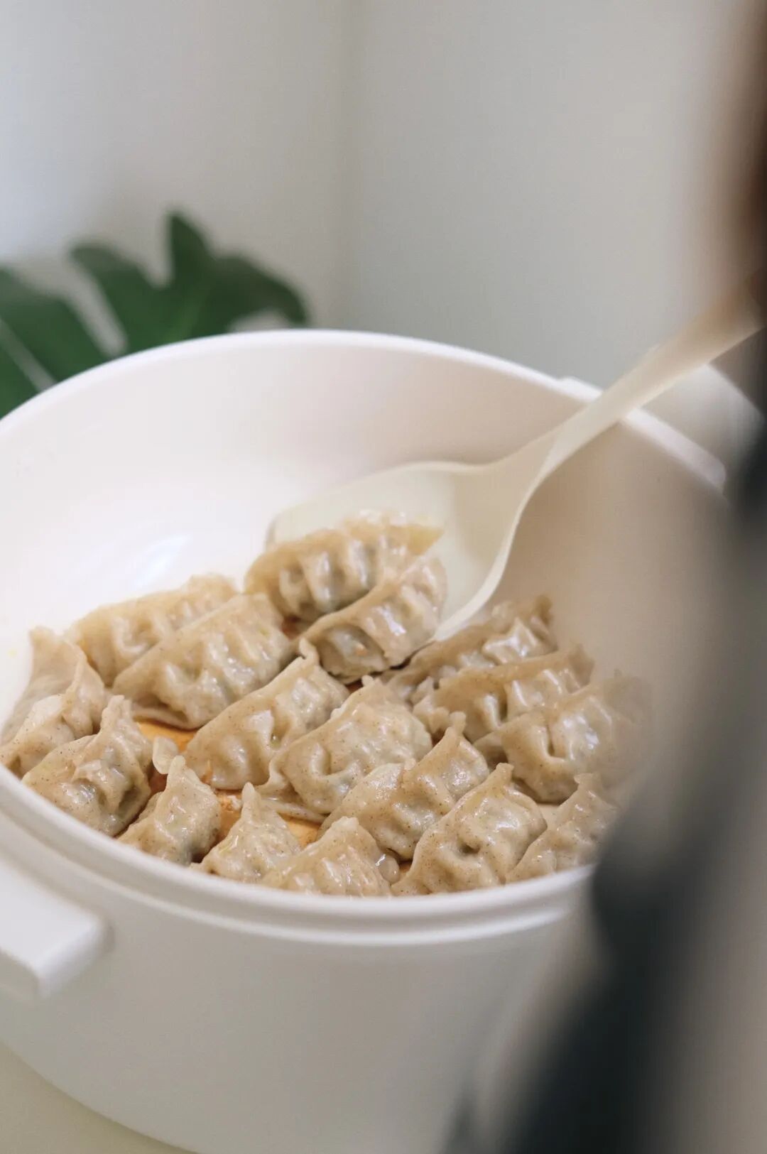 ④煎 → 将平底锅大火预热,锅底刷少许油,无需解冻,将蒸饺放入锅中,中火煎 1-2分钟底部呈浅金黄色。