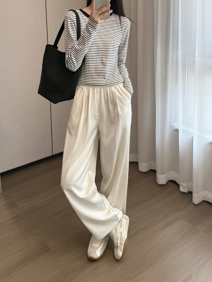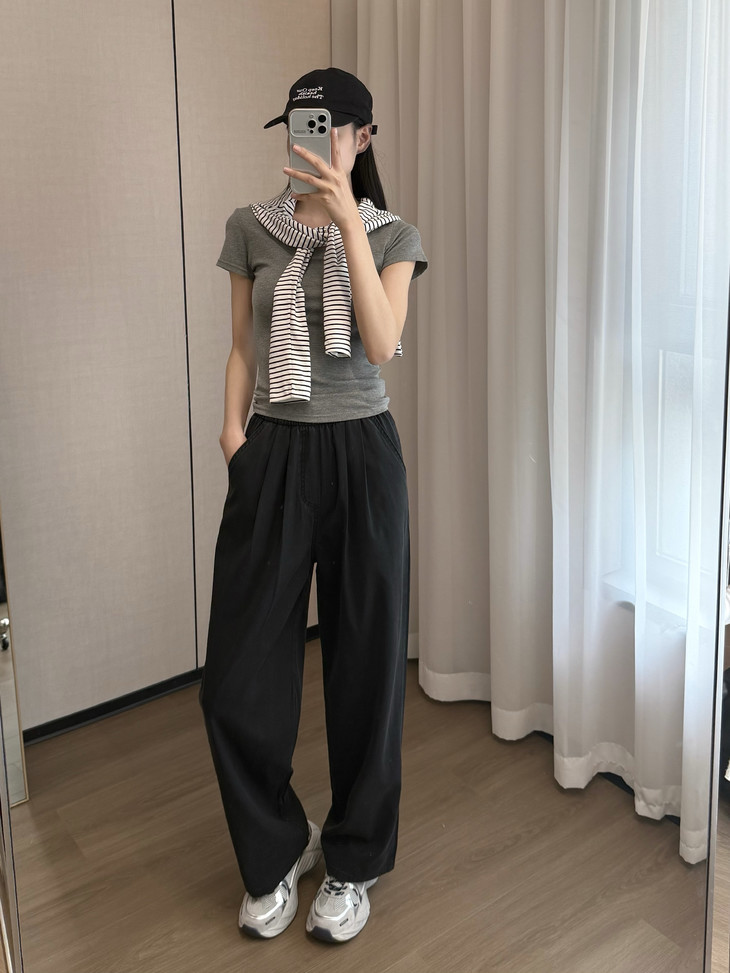 垂感也特别好,随性有型,不需要你费心打理也能保持挺括的裤型,衣服质感随时在线。