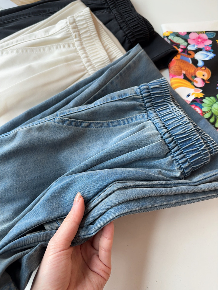 这条裤子还加入了适量聚酯纤维、粘纤和氨纶,拥有普通牛仔裤耐穿耐磨的优点,轻、薄、软,但不脆弱~