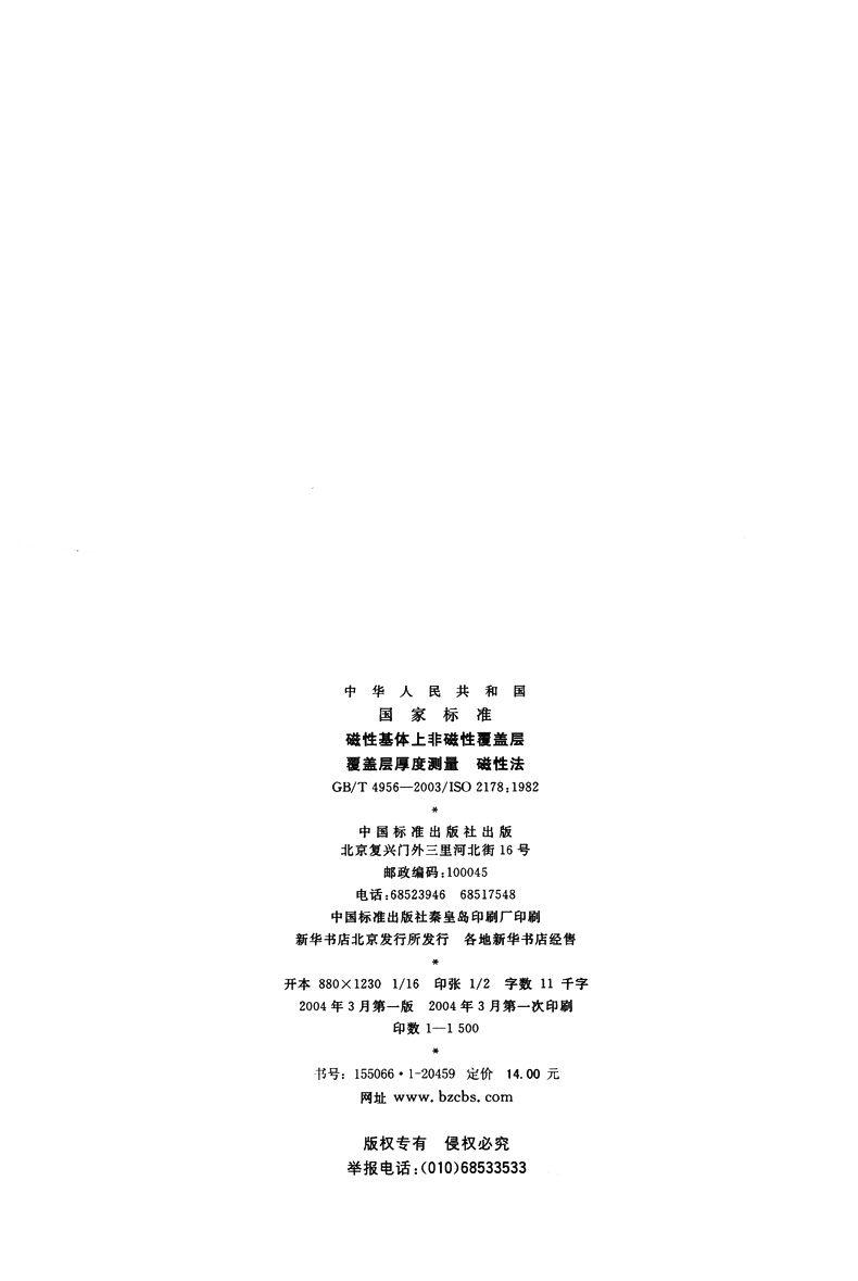 书名: GB/T 4956-2003 磁性基体上非磁性覆盖层 覆盖层厚度测量 磁性法