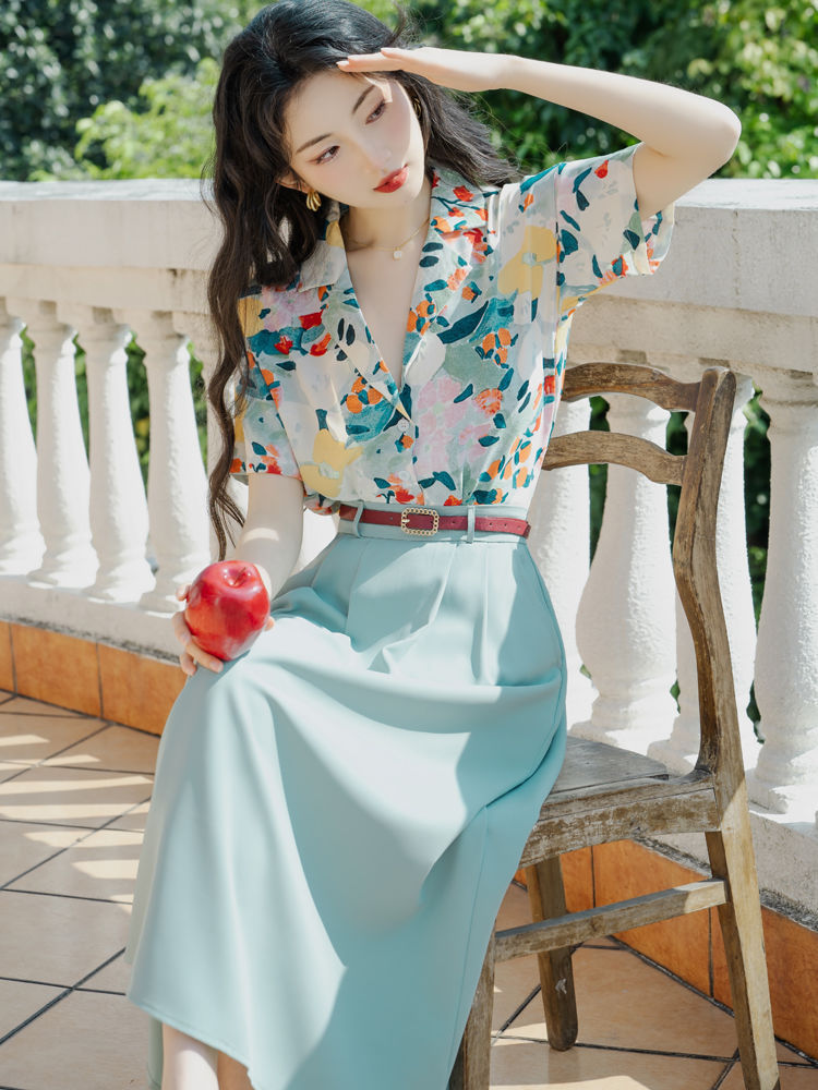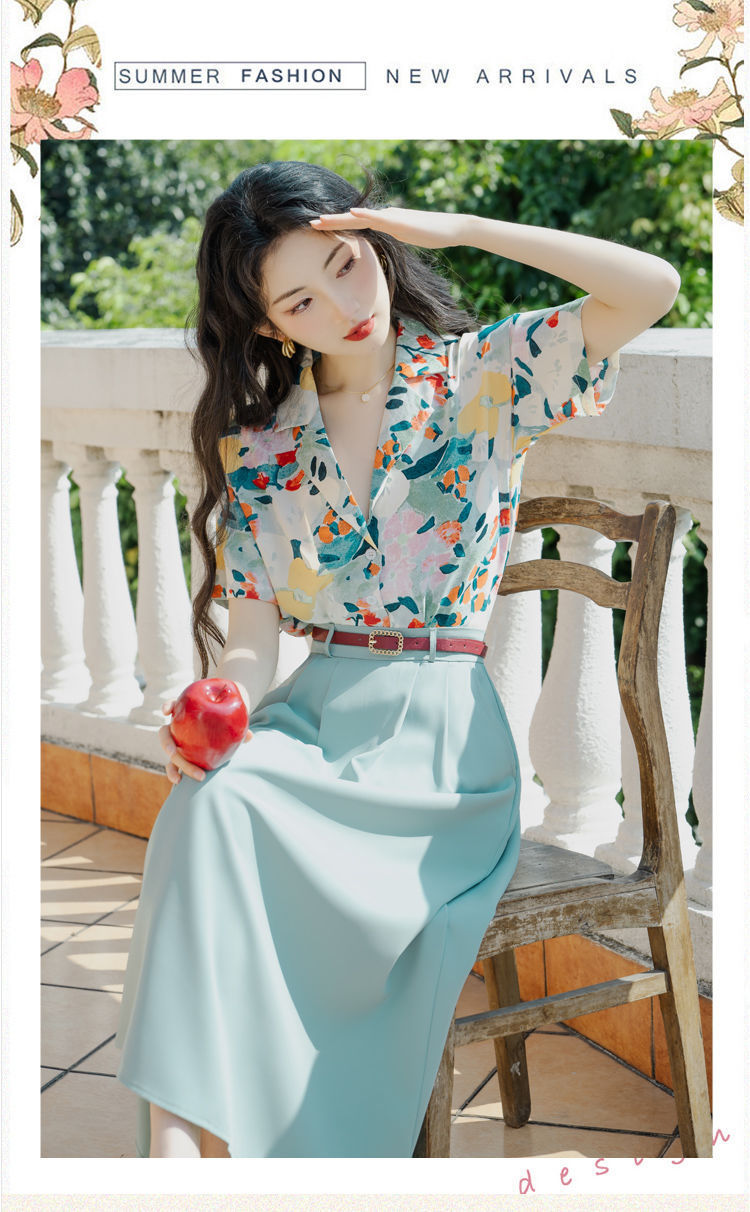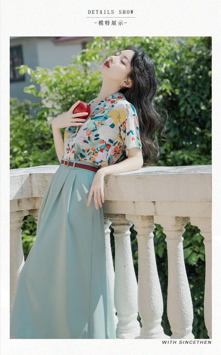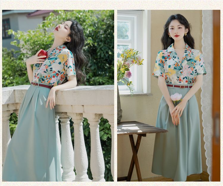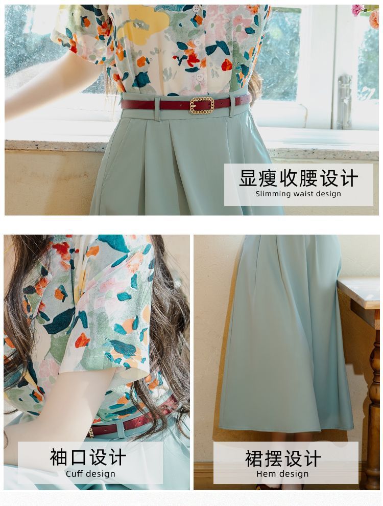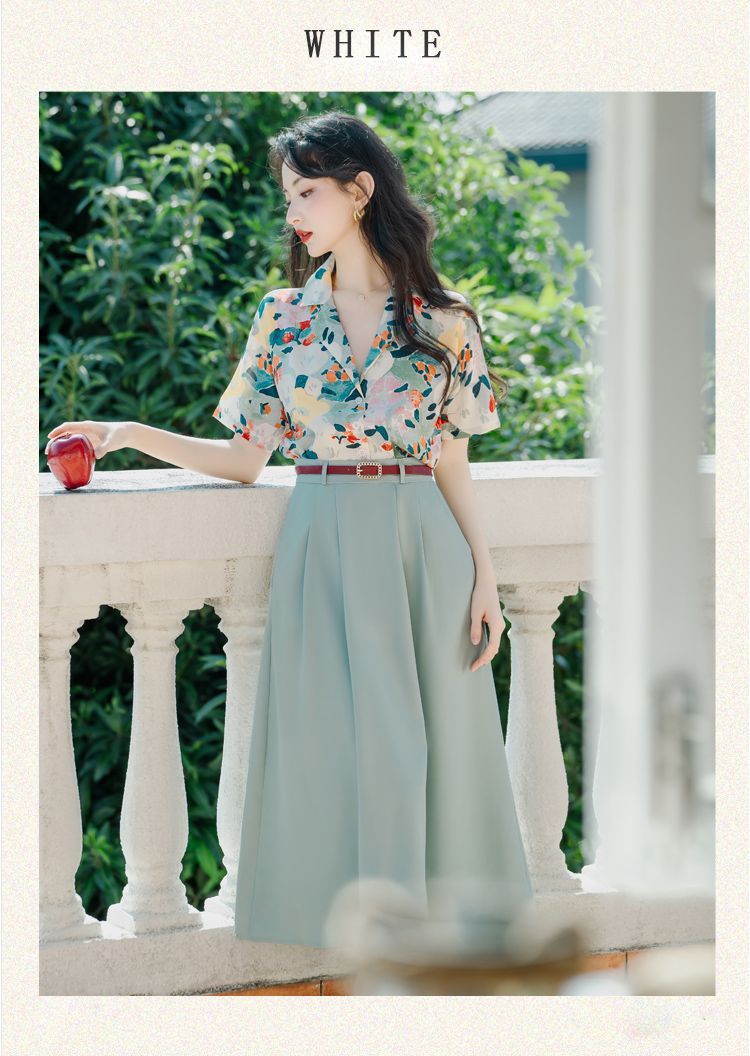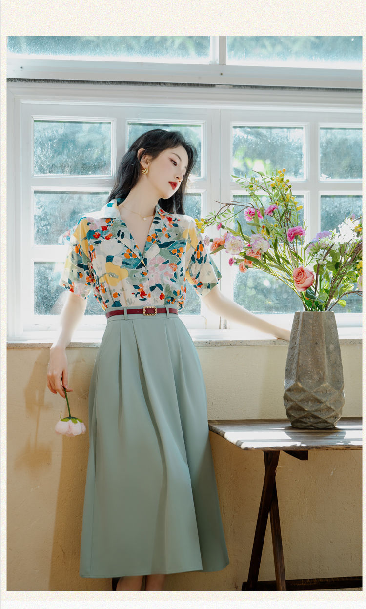「港风套装裙子」2023年夏季新款时尚洋气质西装领衬衣清新绿色裙套装