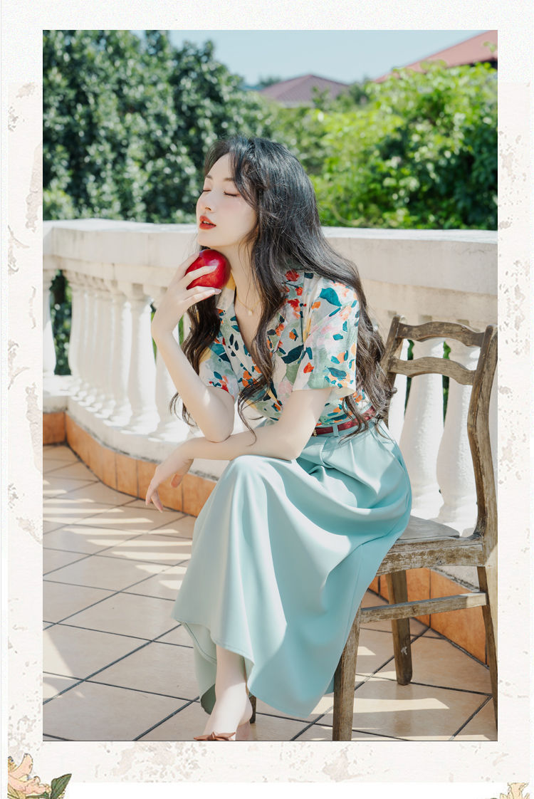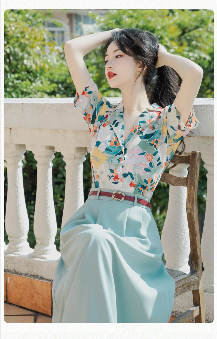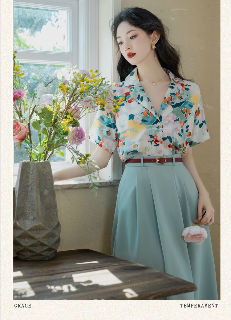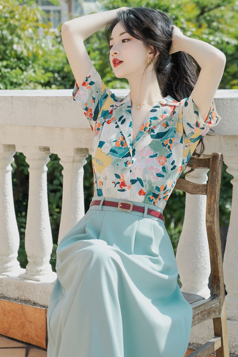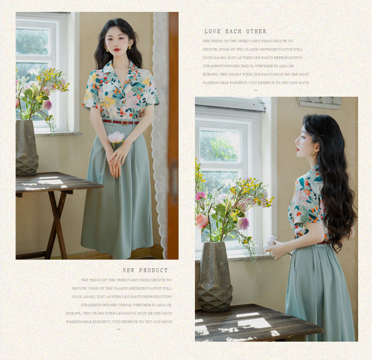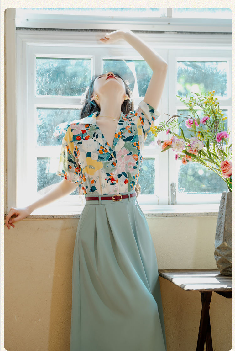 「港风套装裙子」2023年夏季新款时尚洋气质西装领衬衣清新绿色裙套装