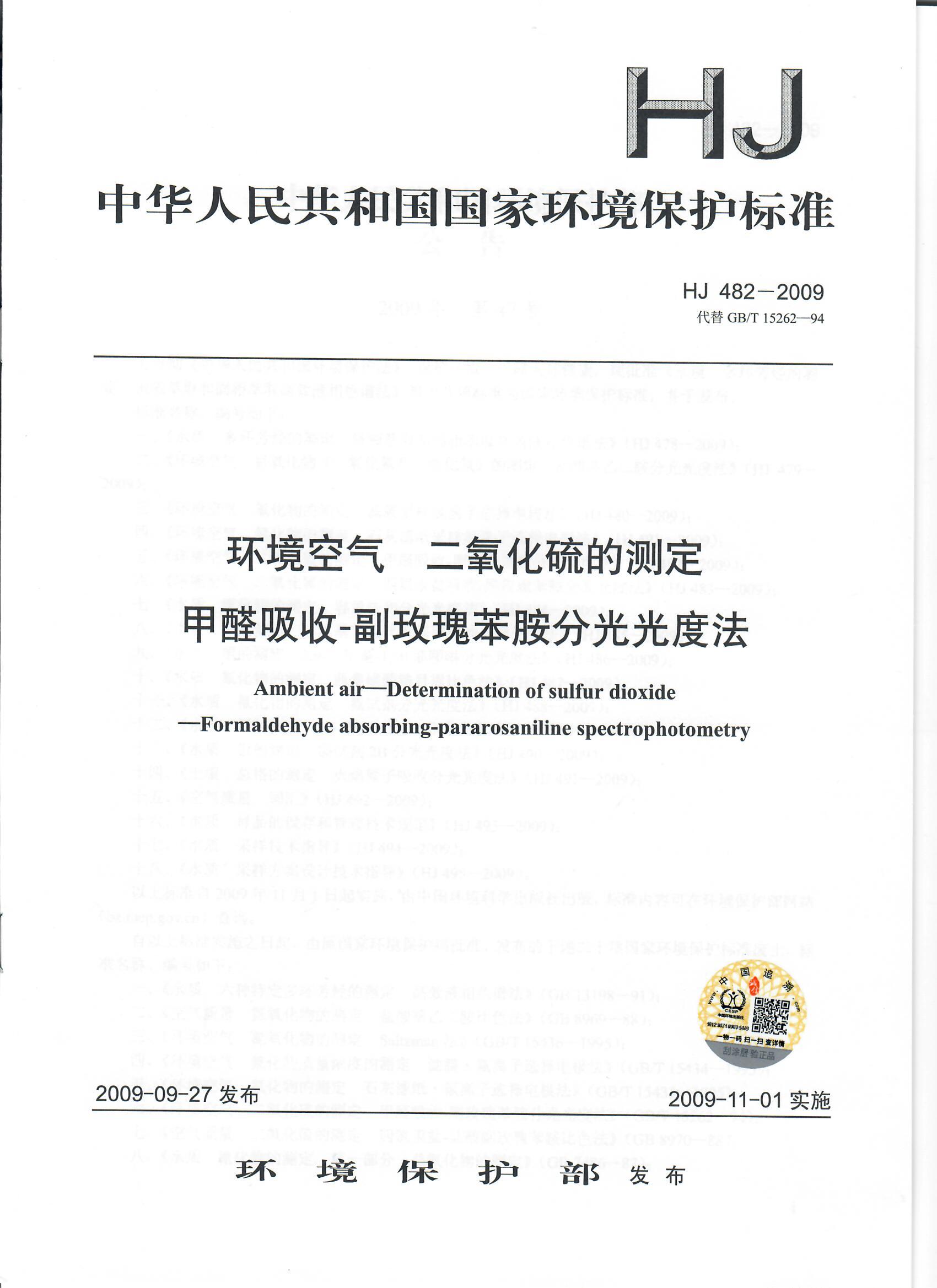 HJ 482—2009环境空气 二氧化硫的测定 甲醛吸收-副玫瑰苯胺分光光度法