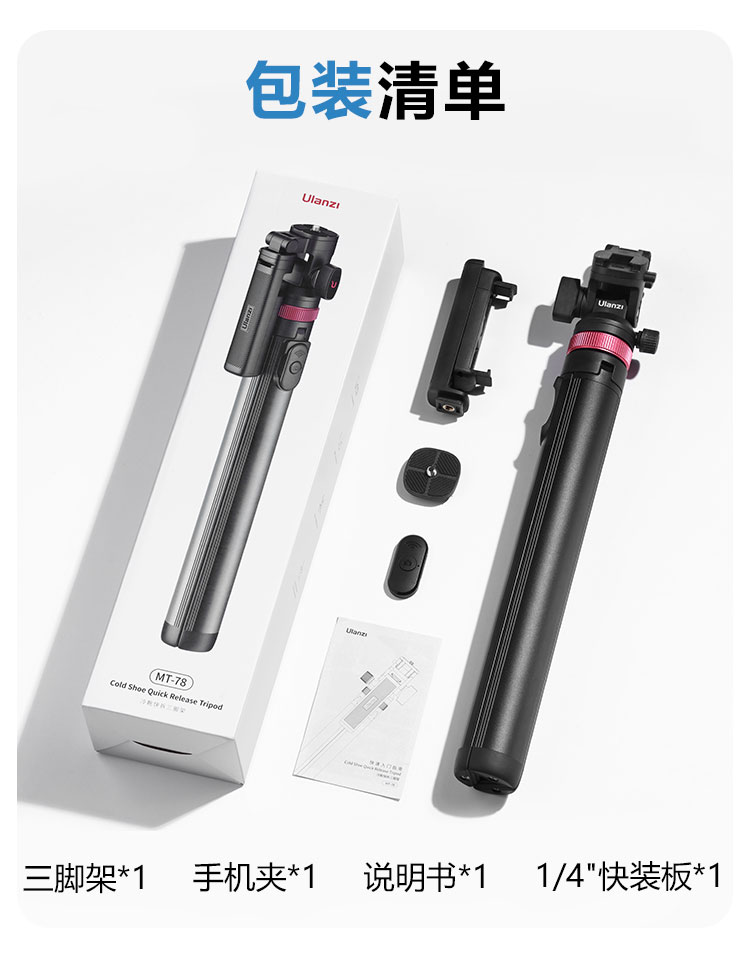 Ulanzi优篮子MT78手机蓝牙三脚架自拍杆冷靴拓展手机直播Vlog摄影支架旅行旅拍自拍支架适用于苹果华为自拍杆