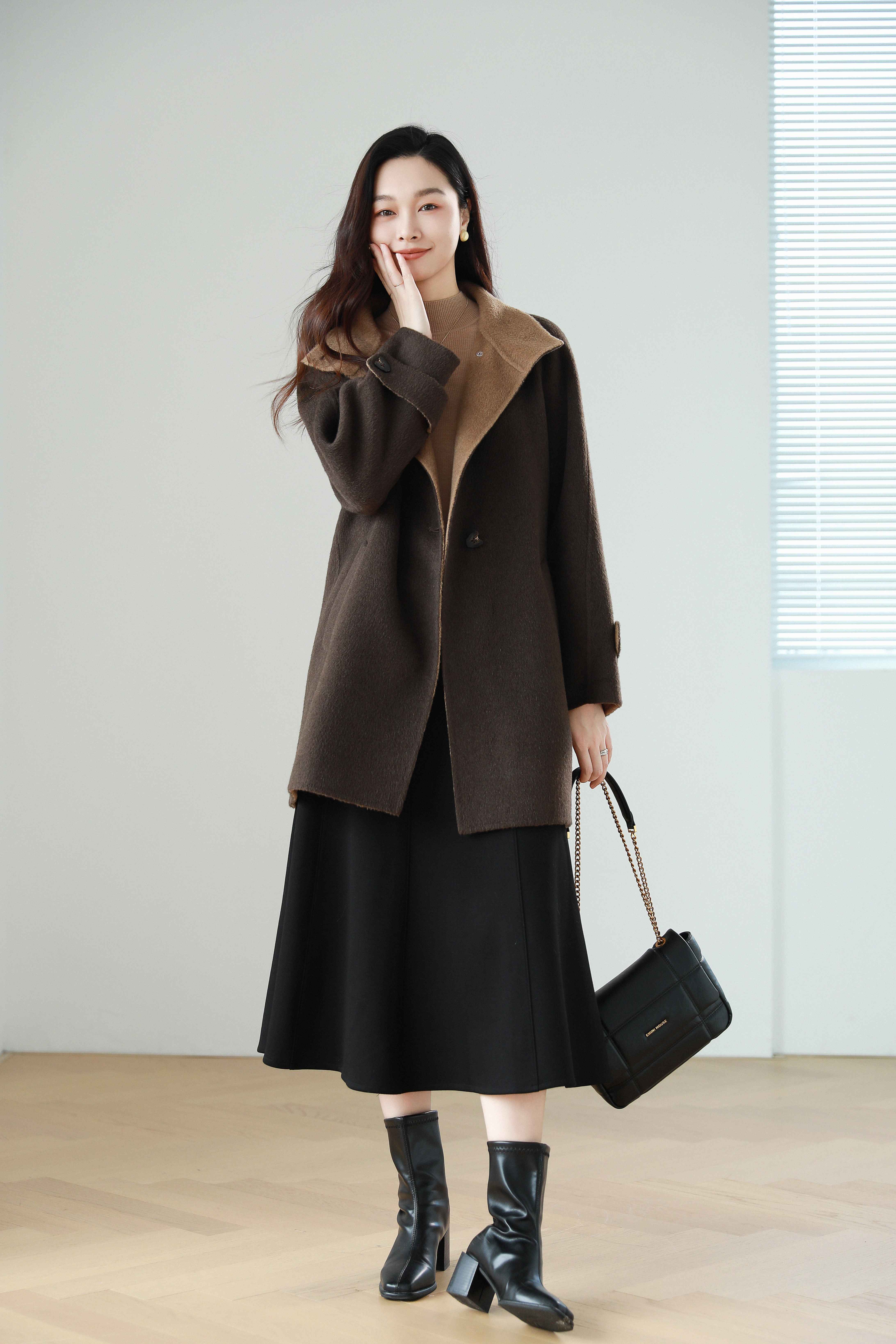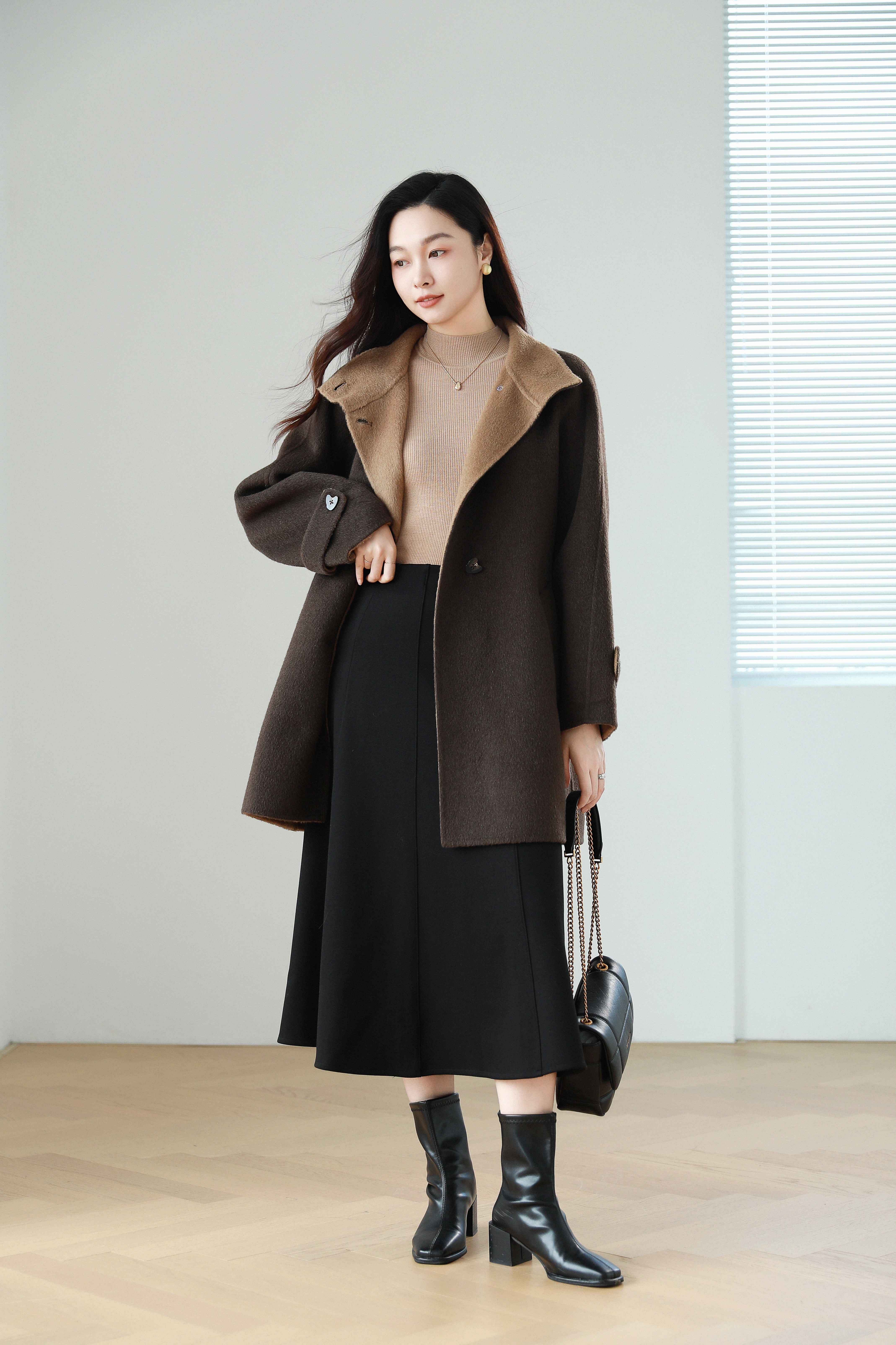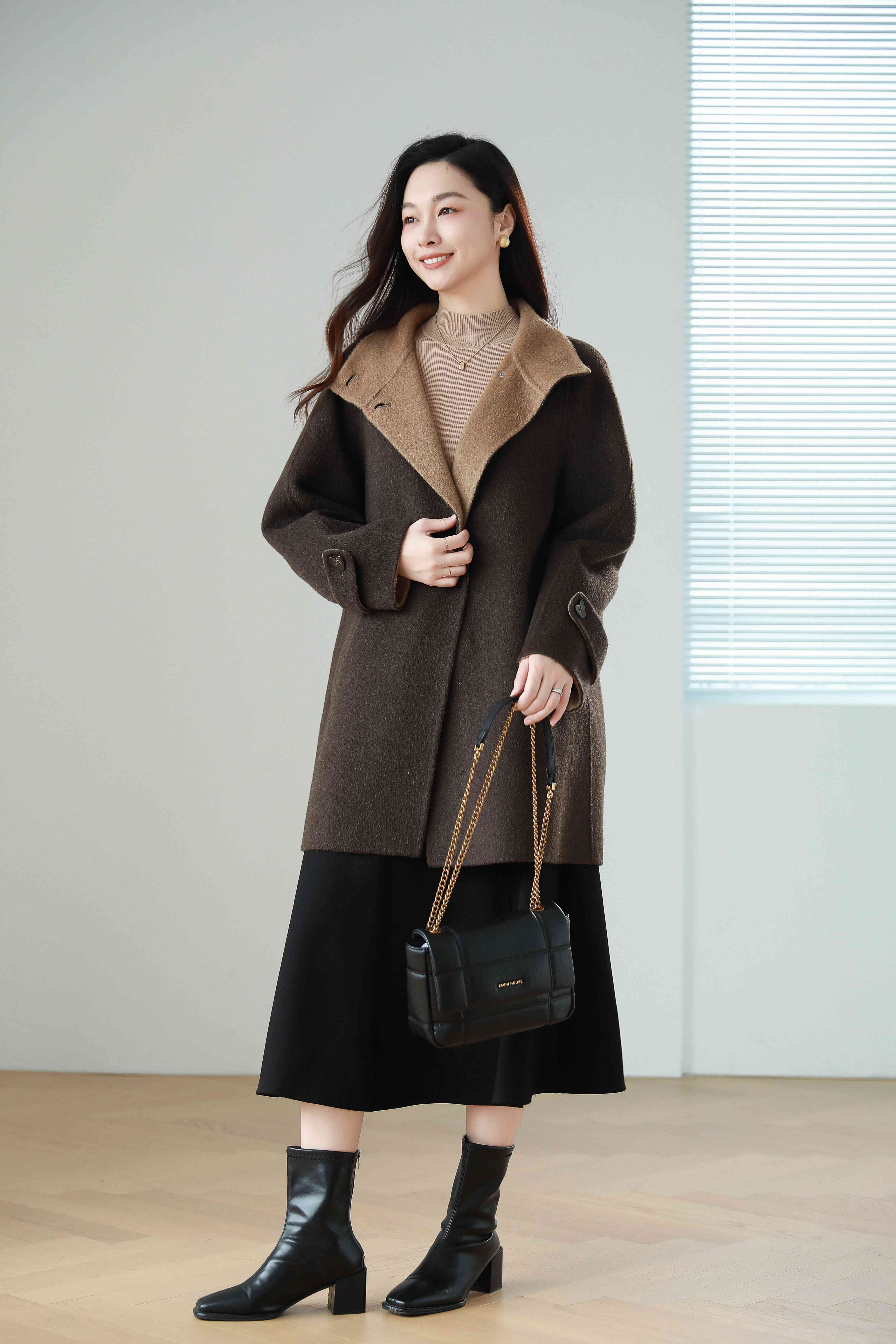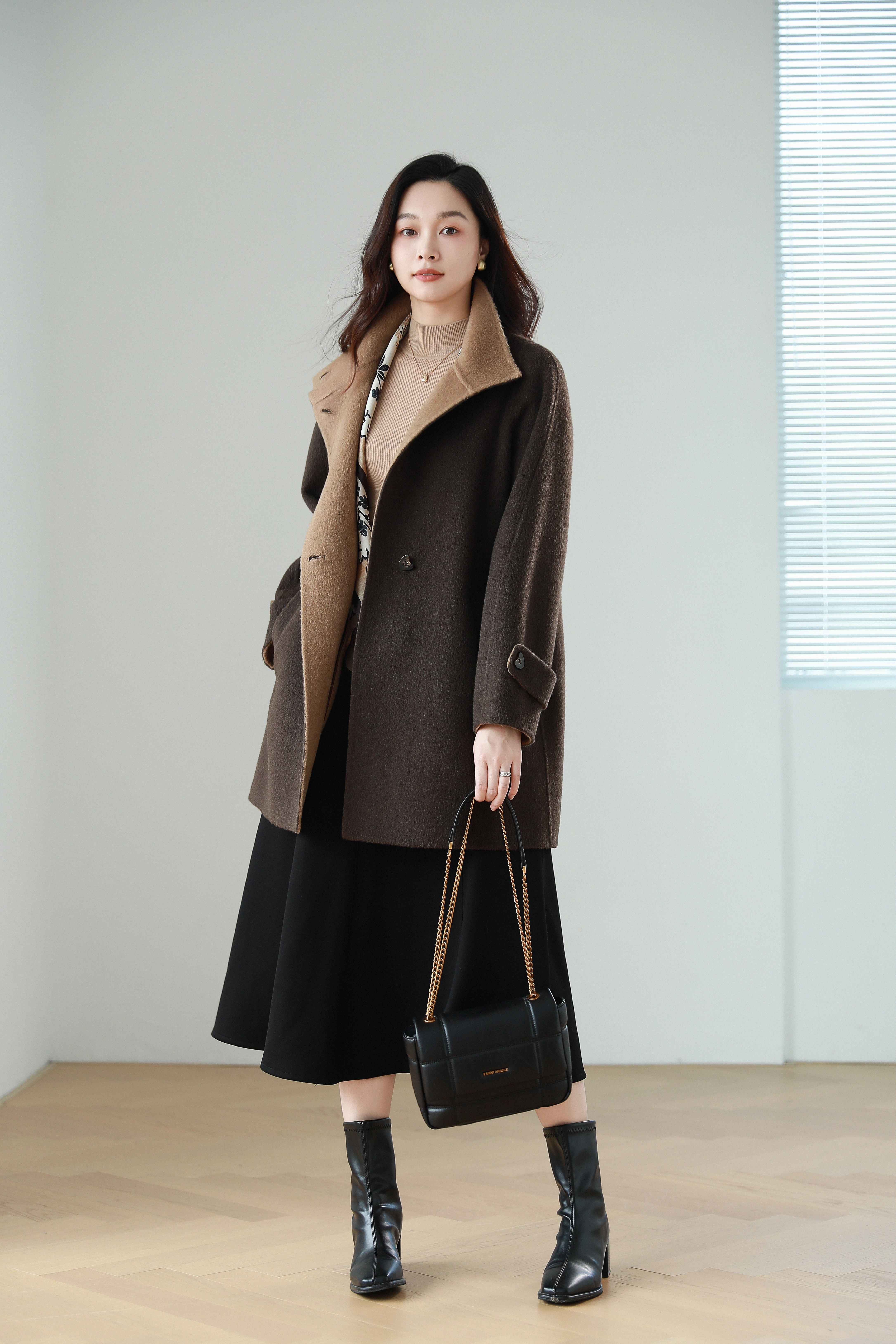 火桐hooton 爱在日落黄昏 骆驼绒烟囱领拼色大衣9856