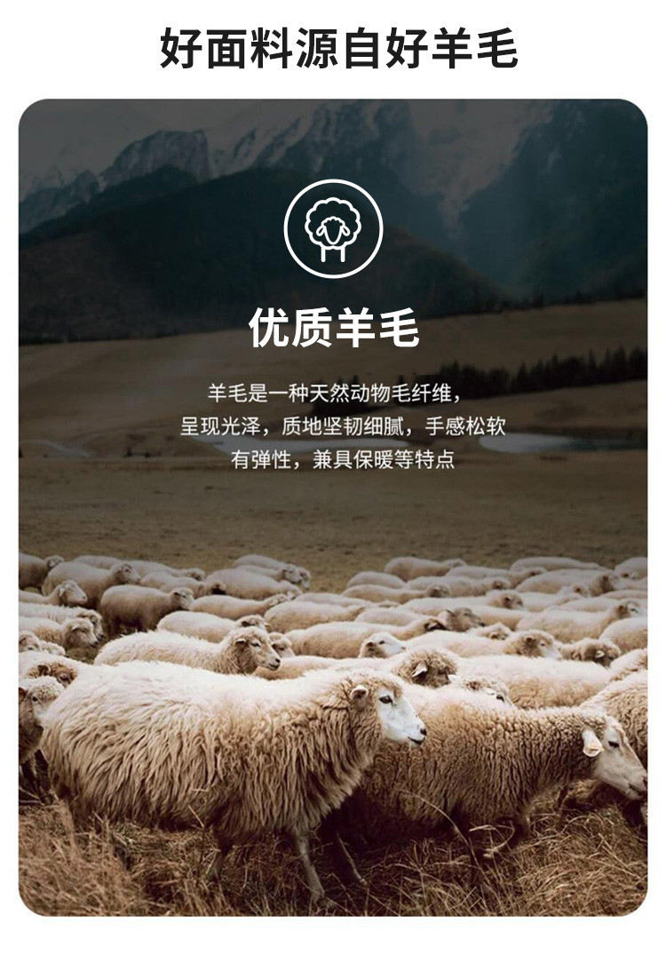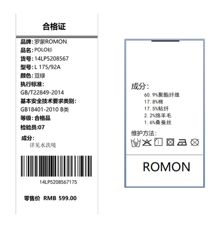 面料:60.9%聚酯纤维 17.8%棉 17.5%粘纤 2.2%绵羊毛 1.6%桑蚕丝