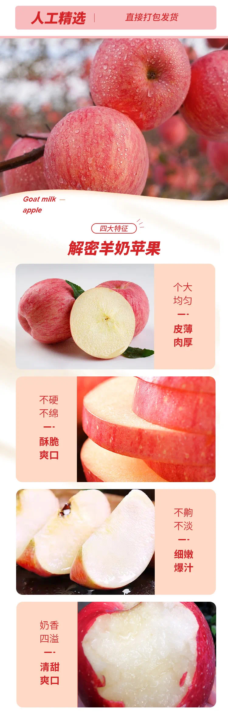 【产品规格】羊奶苹果:4.8-5斤大果(约6-9枚左右),4.8-5斤中果(约9-12枚左右),8.5斤大果(约15-18枚左右),8.5斤中果(约19-24枚左右)。