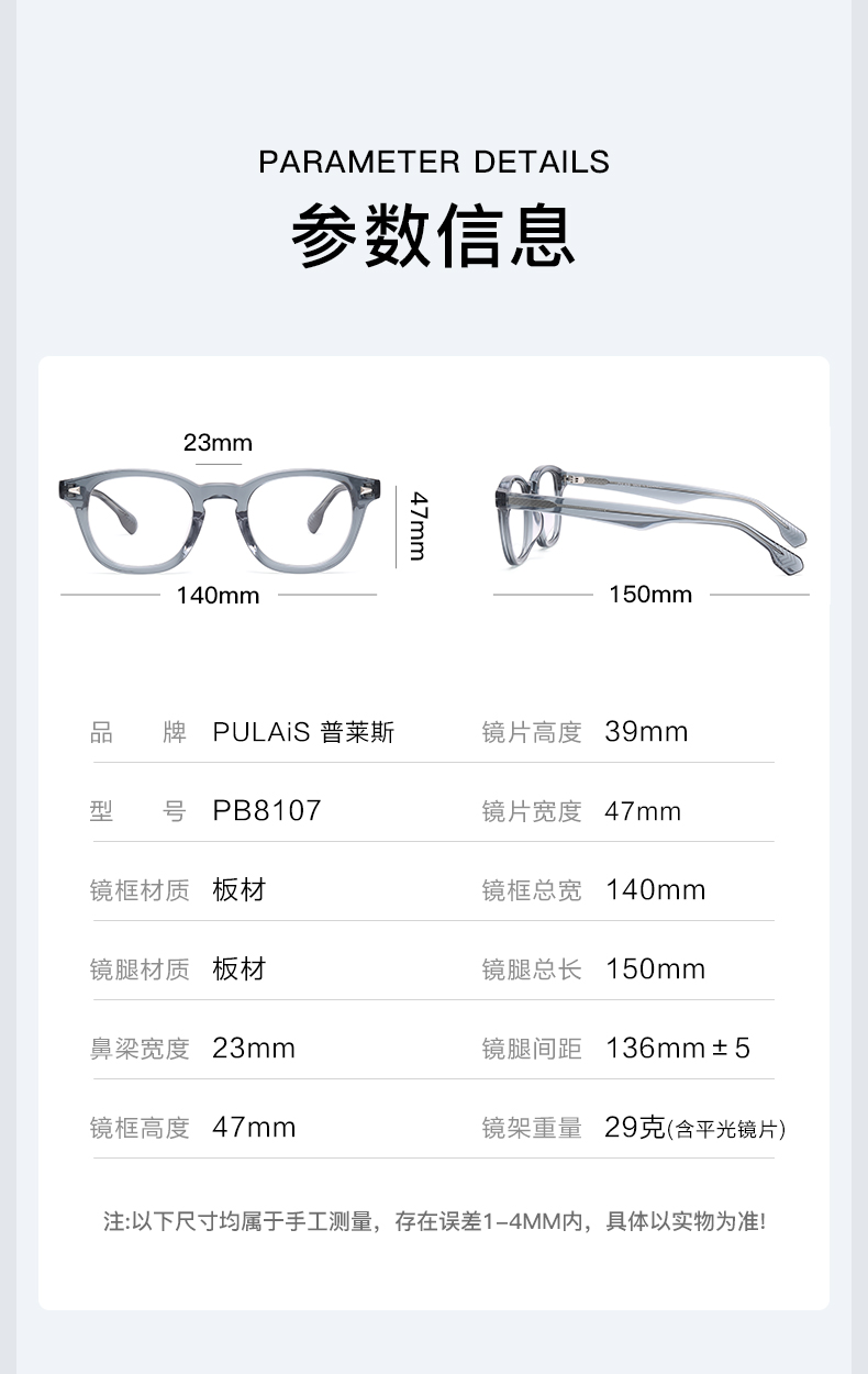 普莱斯光学镜架PB8107 休闲气质素颜框 男女同款 板材材质 三色可选