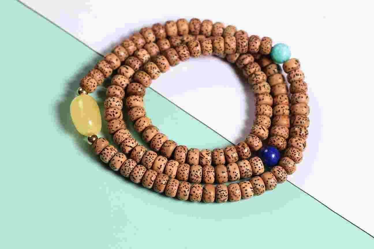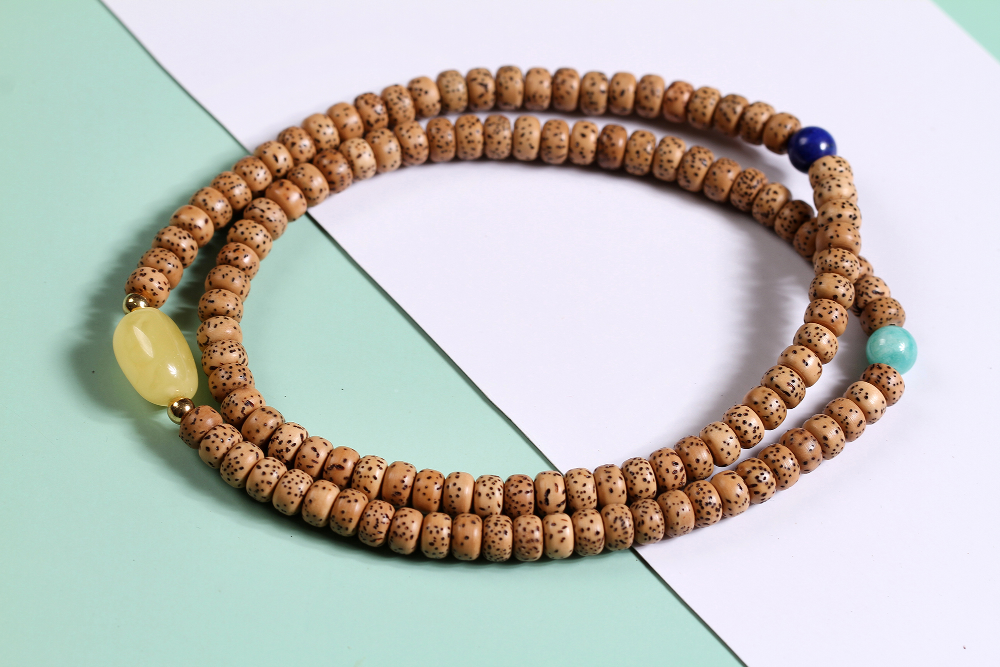 搭配:高品质陈籽菩提为主,搭配蜜蜡/天河石/青金石/铜珠