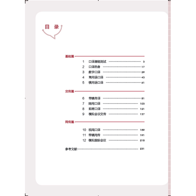 在基础篇中,首先通过潜能测试,让学习者初步了解自身的口译水平,然后通过热身环节,传授基本的口译训练方法,让学习者在业余时间也能够有的放矢地进行口译训练。接下来,通过数字、常用语和惯用语的口译训练,为以后进入交传篇和同传篇奠定基础。交传篇囊括了交替传译活动中经常出现的带稿传译、陪同口译、即席口译以及会议口译等几大类型。同传篇包括视阅口译、带稿同传两大类型。
