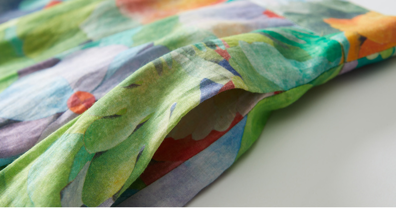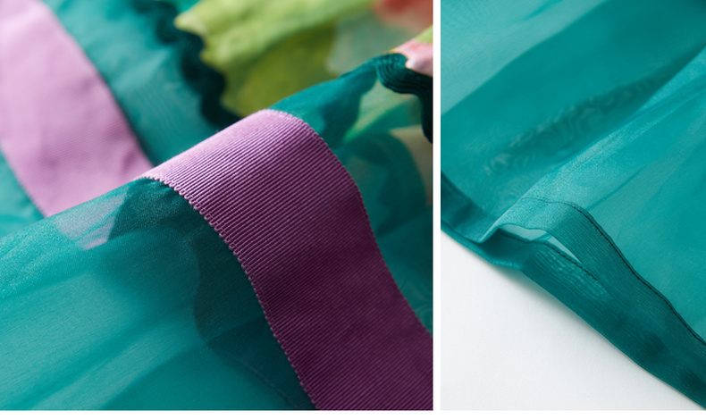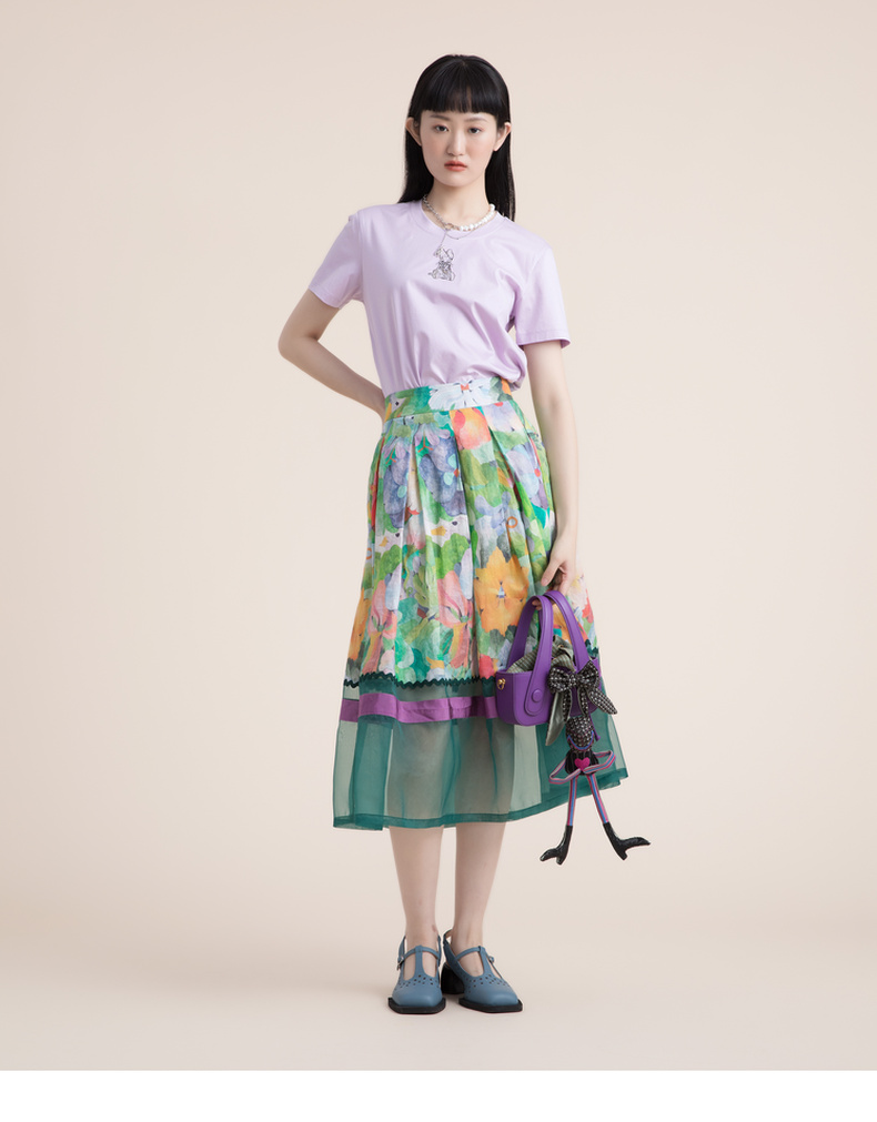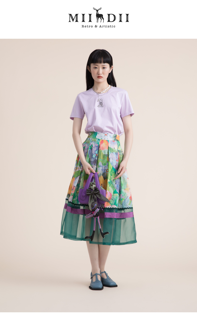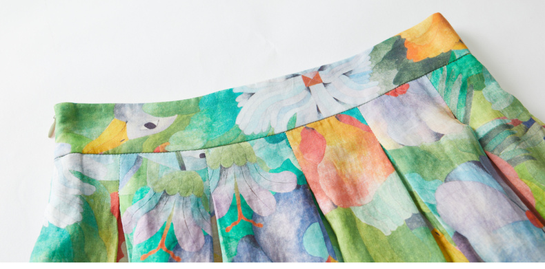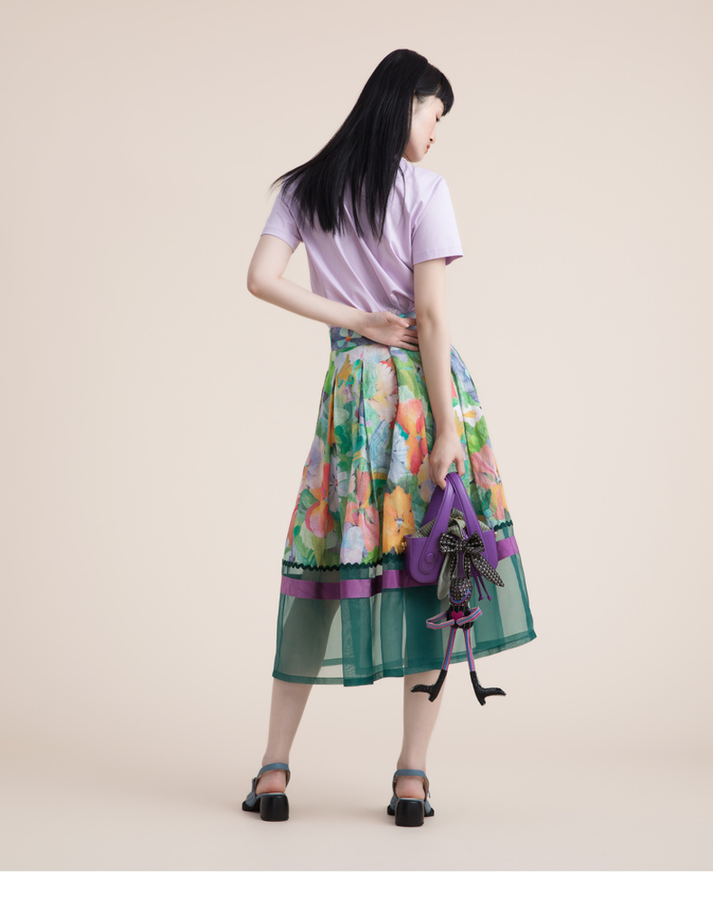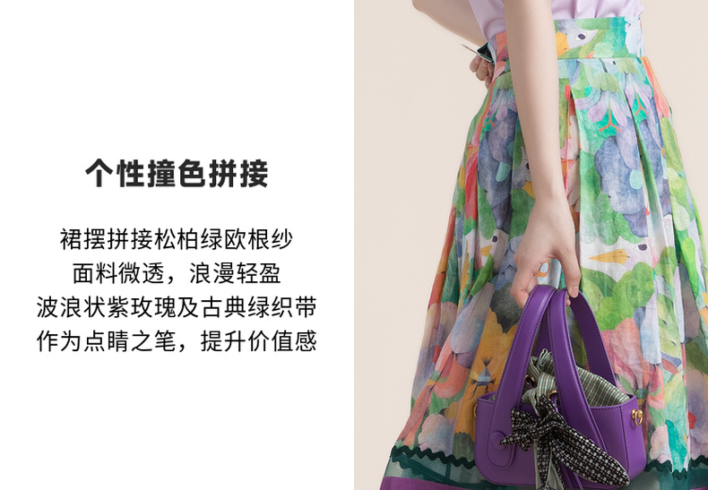 谜底苎麻花色半身裙2022夏季复古优雅拼接欧根纱百褶裙222MB0690