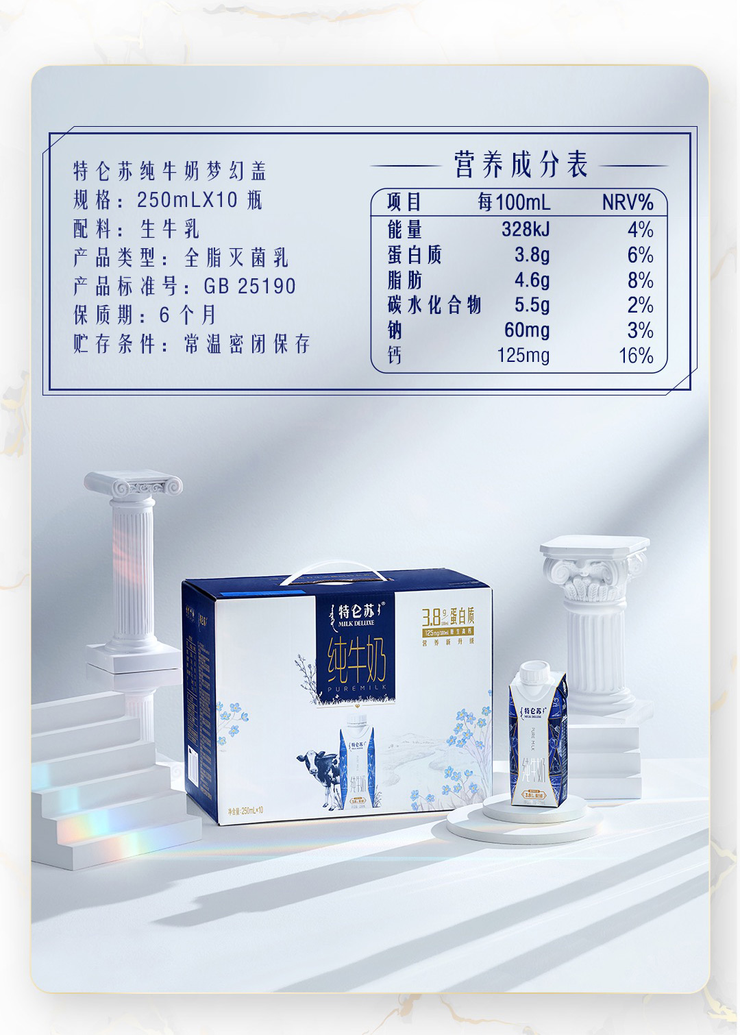 【自营】特仑苏纯牛奶全脂灭菌乳利乐梦幻盖250ml×10瓶(3.8g乳蛋白)