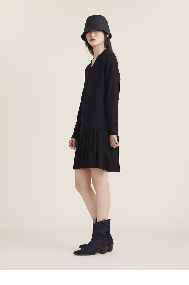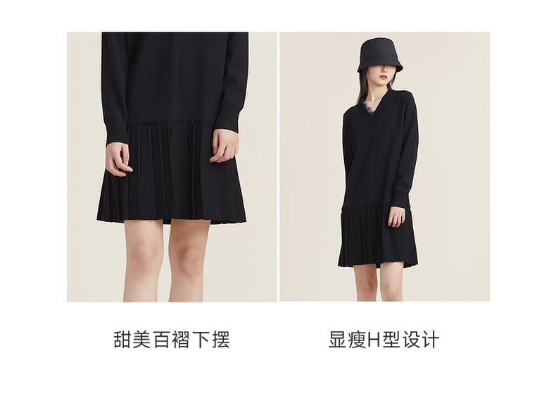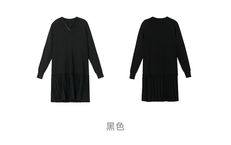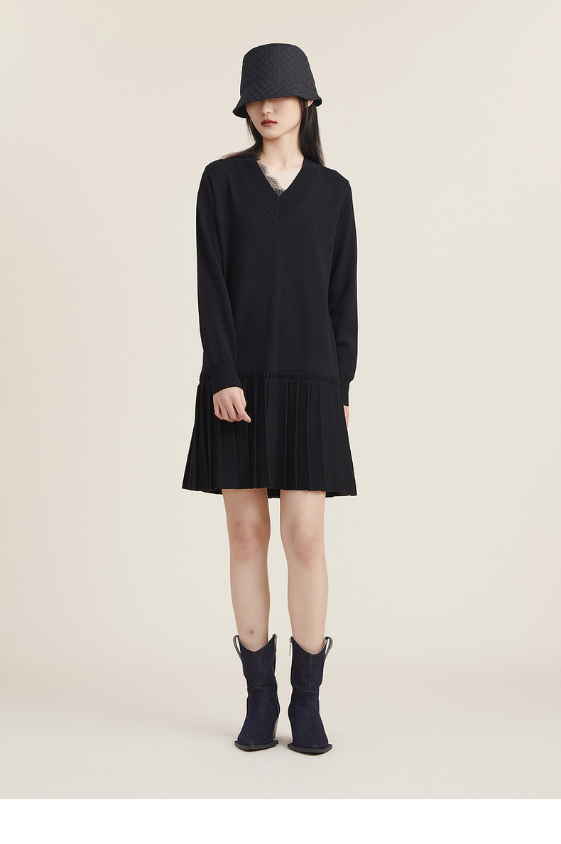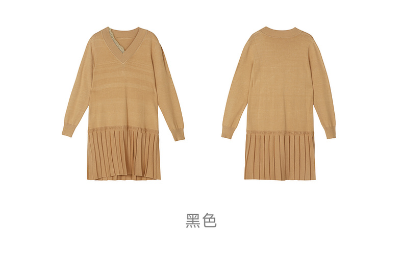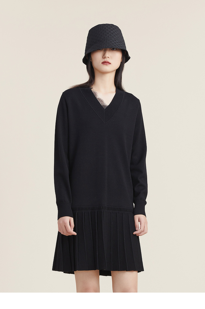 谜底2022秋新款套头V领蕾丝拼接中长款宽松针织连衣裙女223MZ1310
