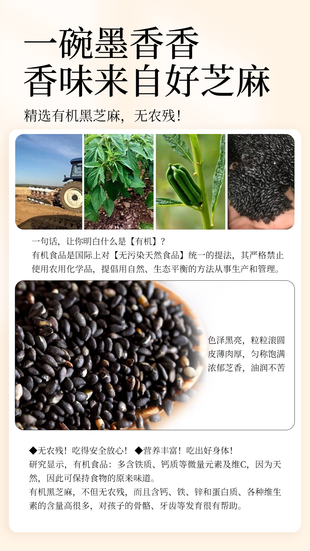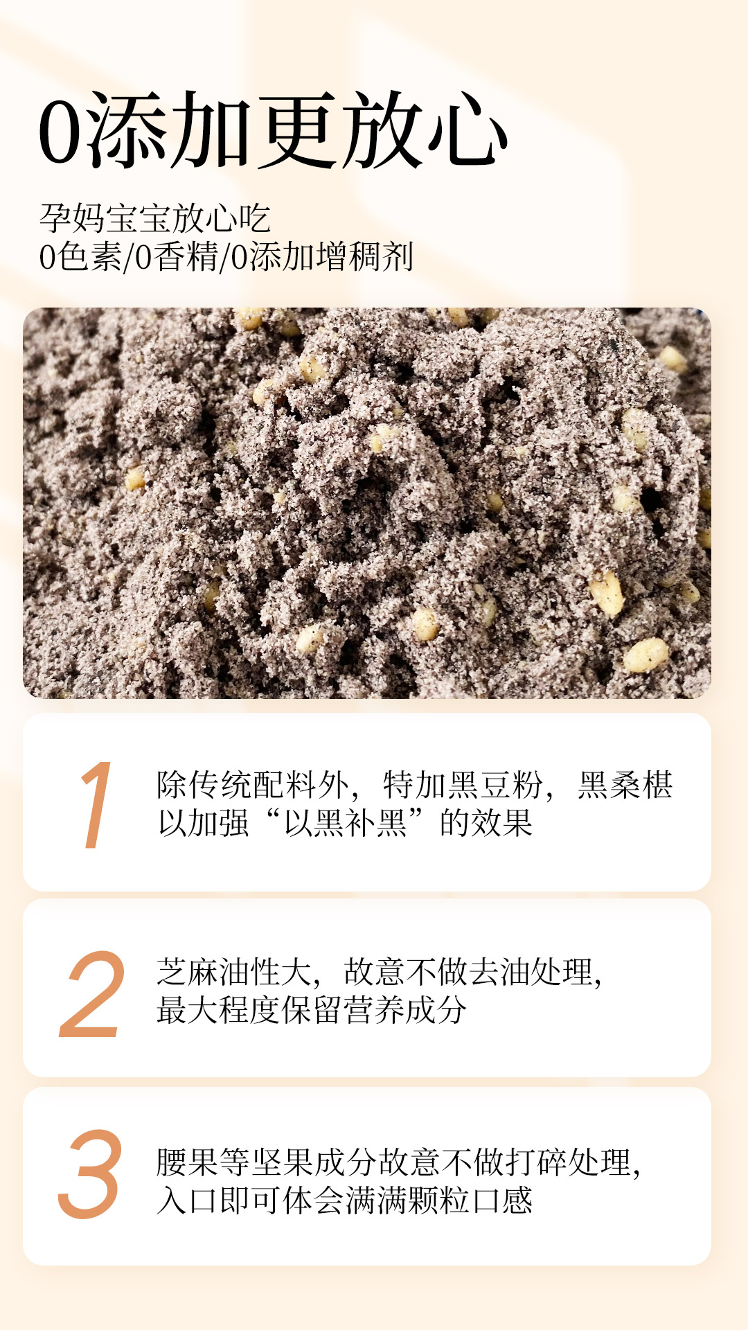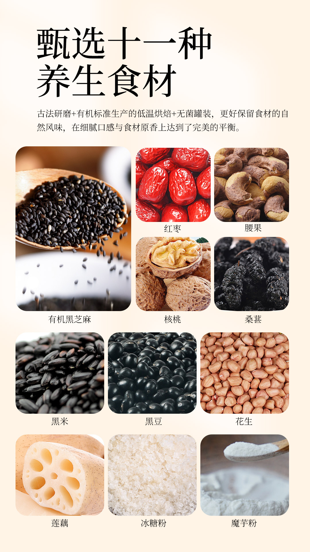 【配料表】有机黑芝麻、黑米粉、黑豆粉、花生、冰糖粉、莲藕粉、魔芋粉、红枣粉、腰果碎、核桃粉、桑葚果粉