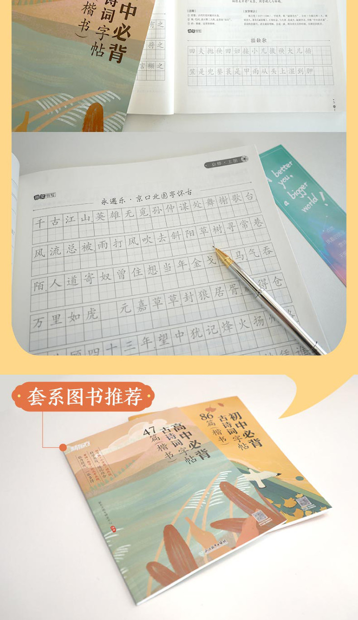 书中主要分为诗词诵读和书写练字两大部分,是古诗词册子和字帖的结合。其中,诵读篇目包含*新版高中语文教材古诗词篇目38篇,以及拓展的重点背诵篇目9 篇,按照课本册数顺序排列,方便读者查阅、背诵和练字。重难点字词配注释,便于读者理解。