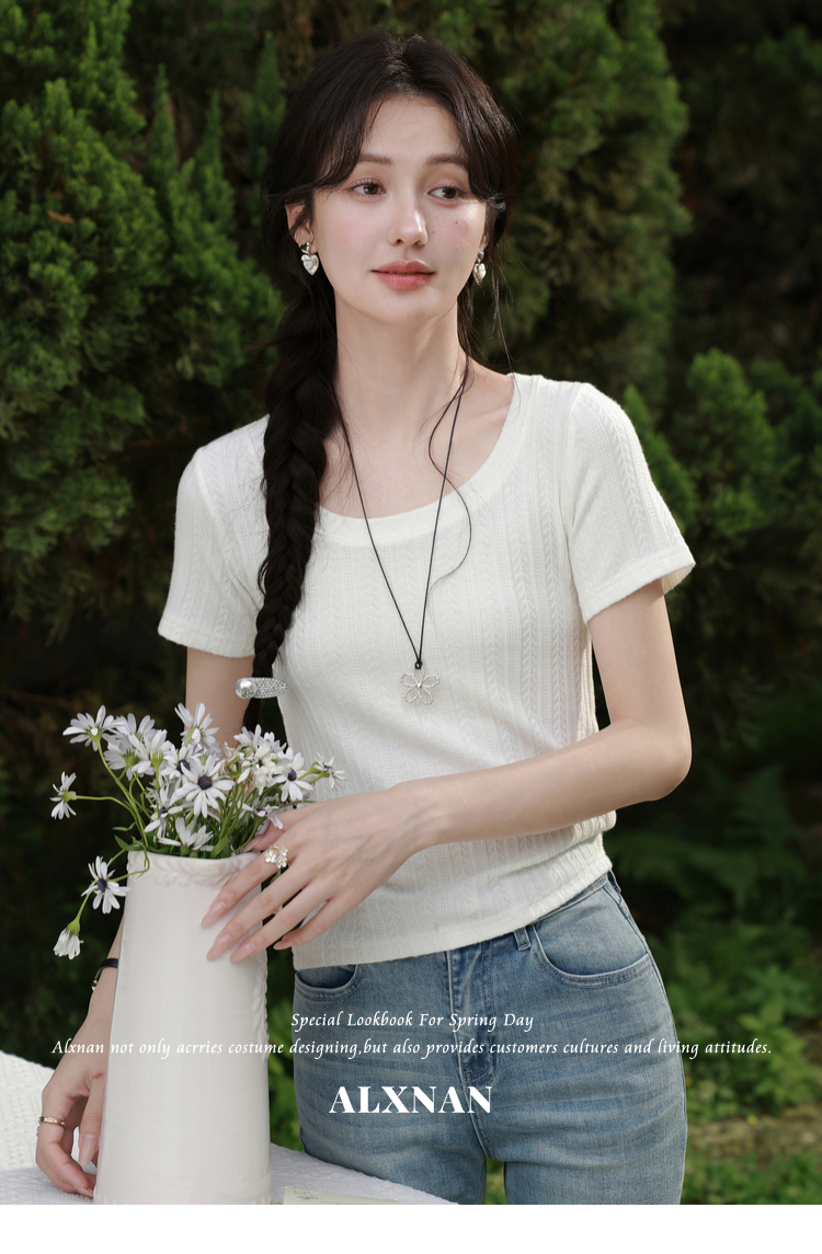 鹿向南「锦衣织夏」简约百搭U领白色T恤女夏新款正肩修身短袖上衣