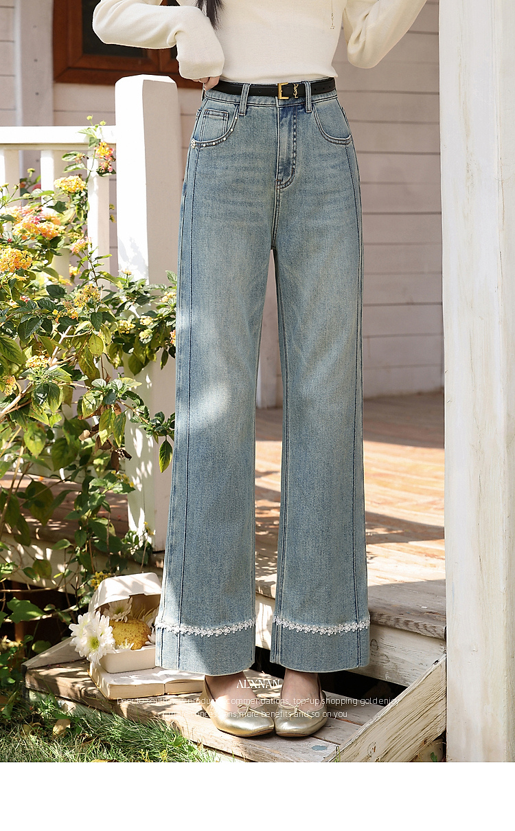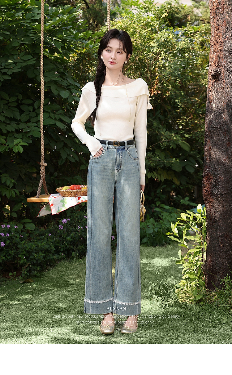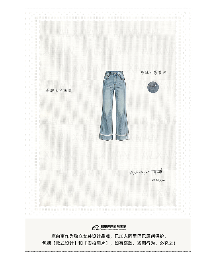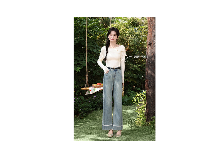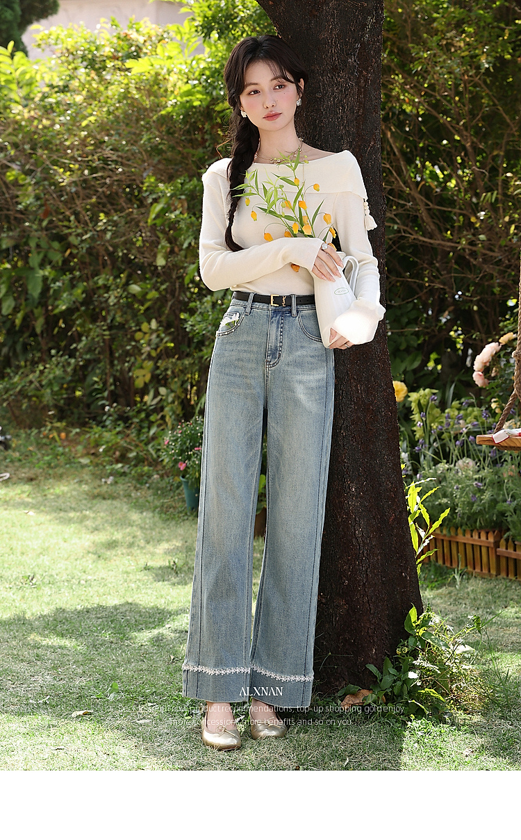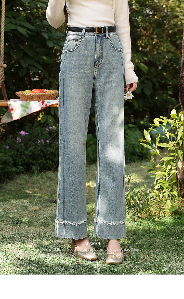 鹿向南「溪畔花曳」蓝色直筒牛仔裤春季新款时尚宽松阔腿长裤子女