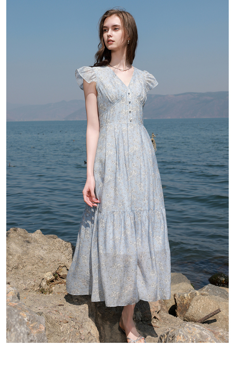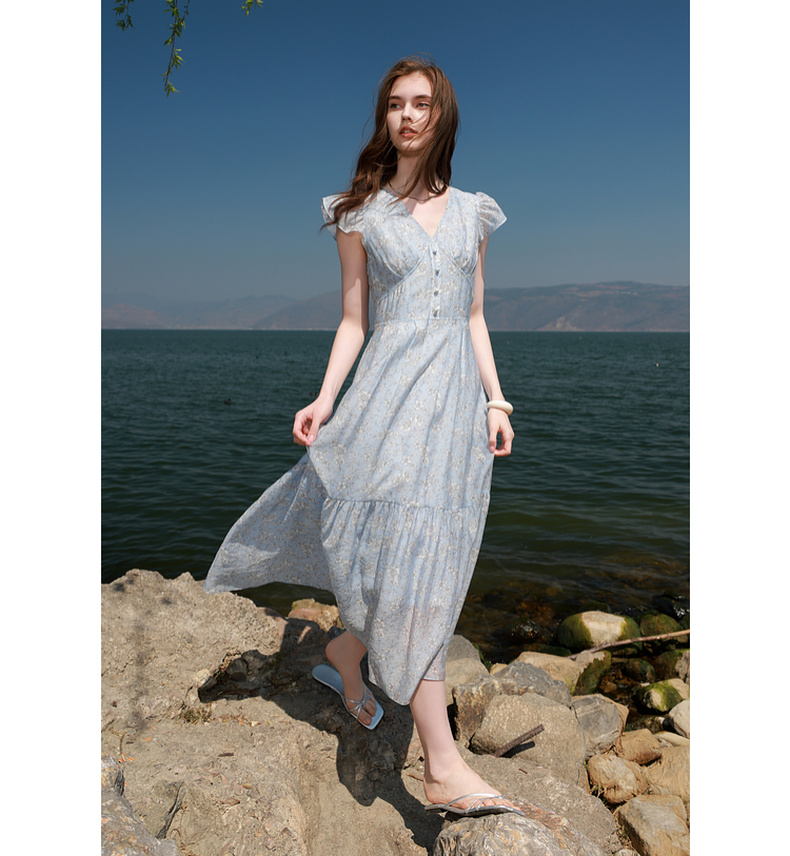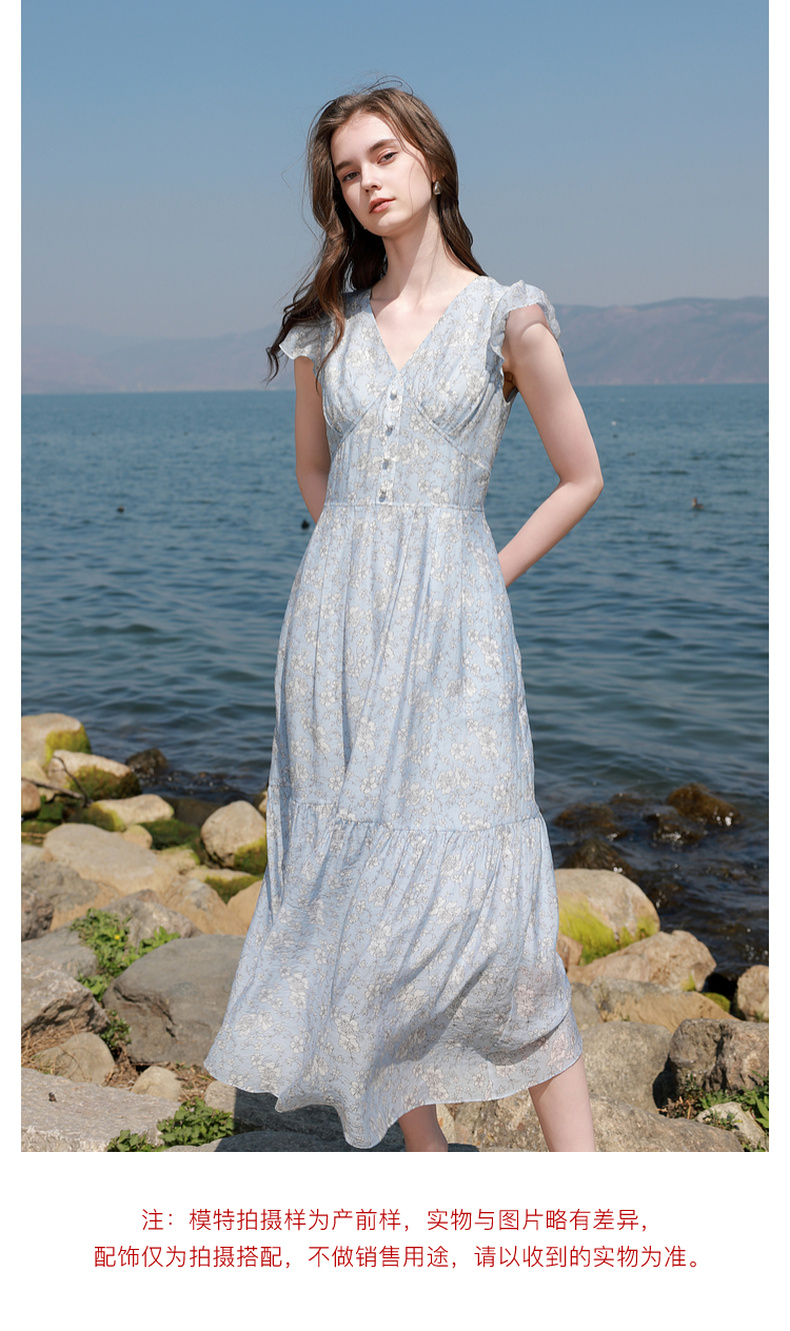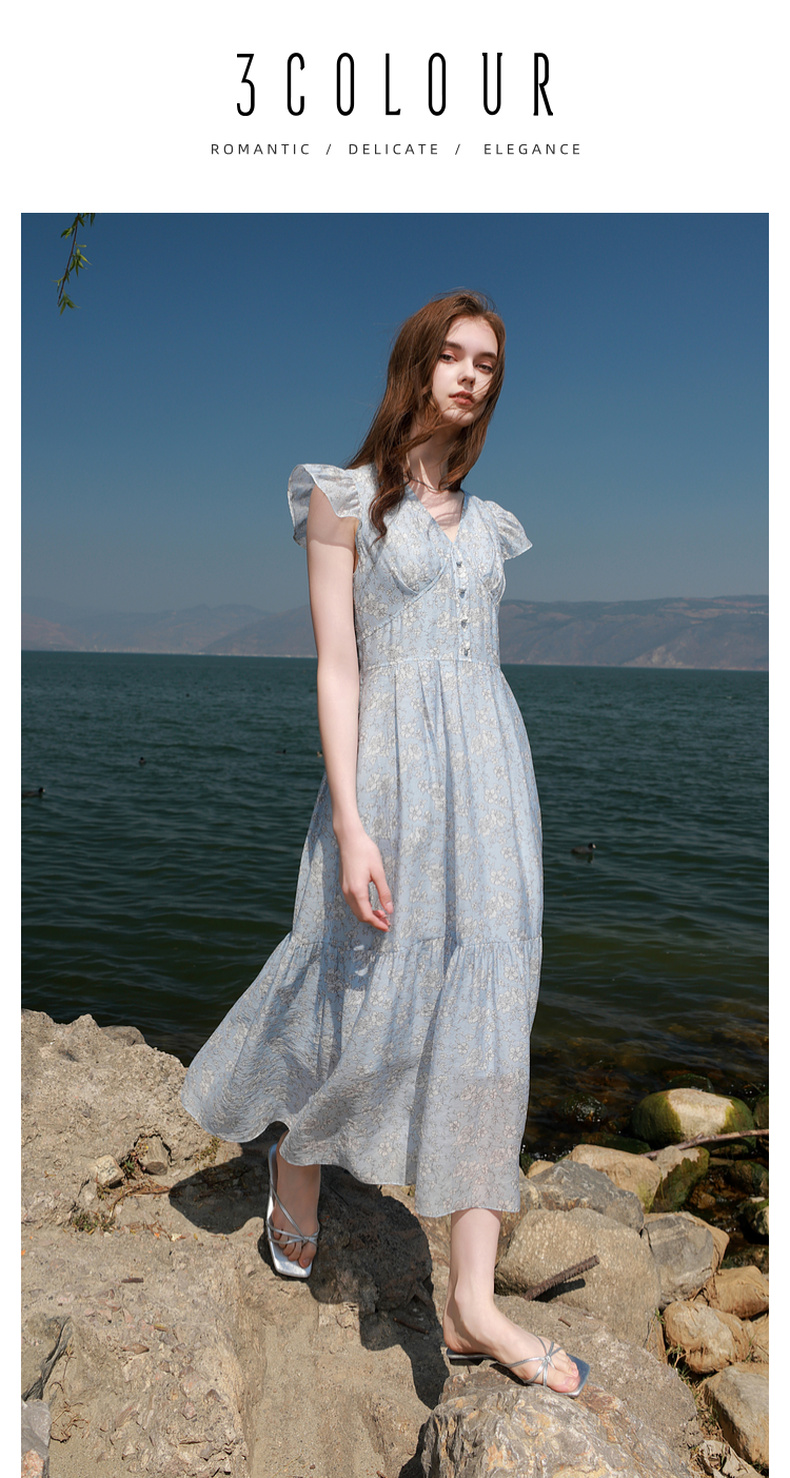 三彩2025夏季新款碎花连衣裙法式V领飞飞袖收腰A字裙长裙M