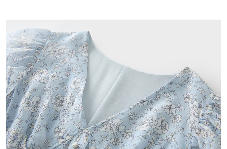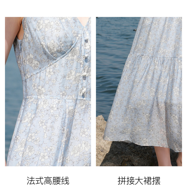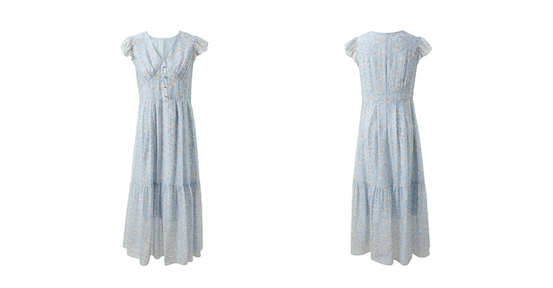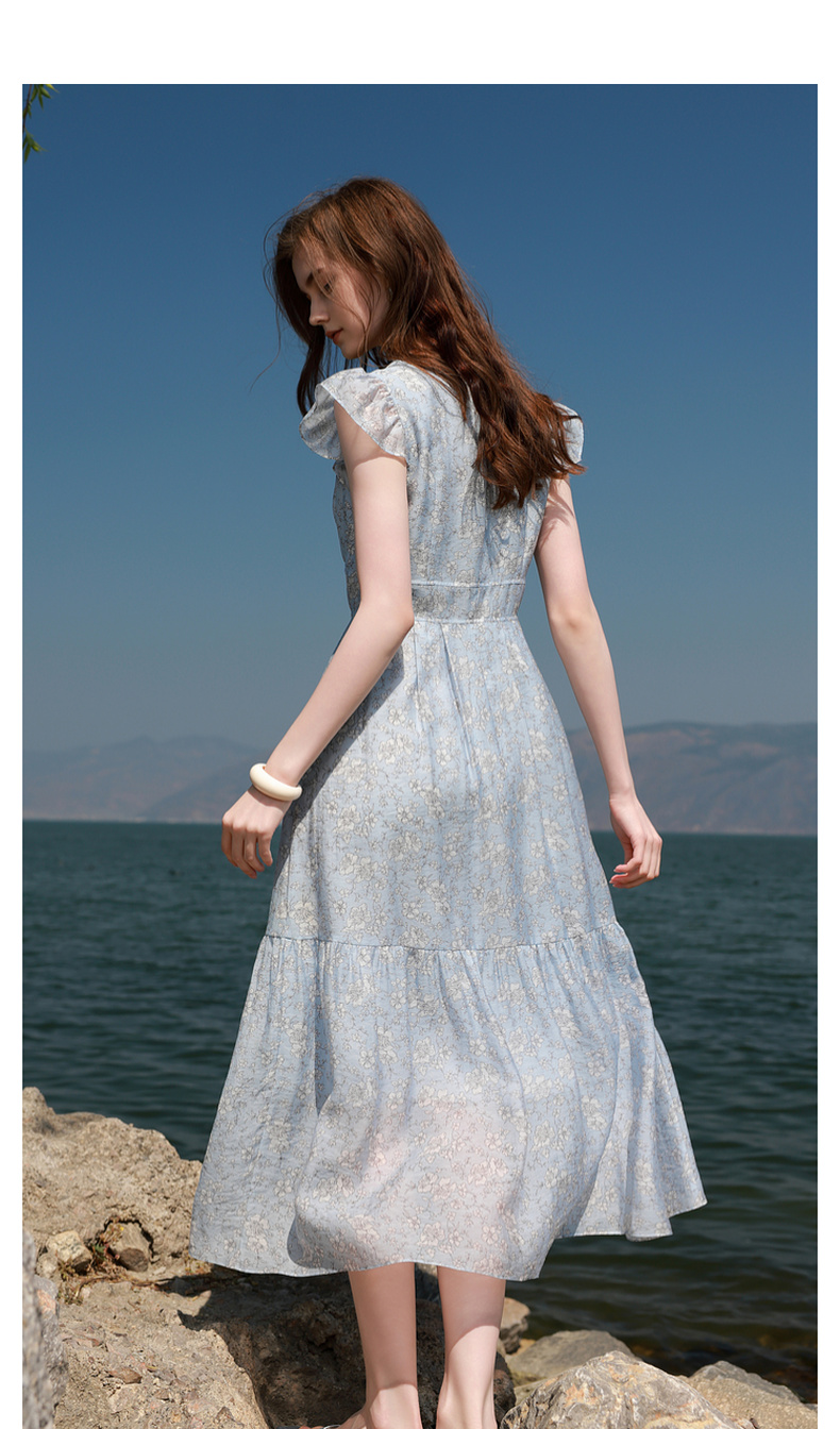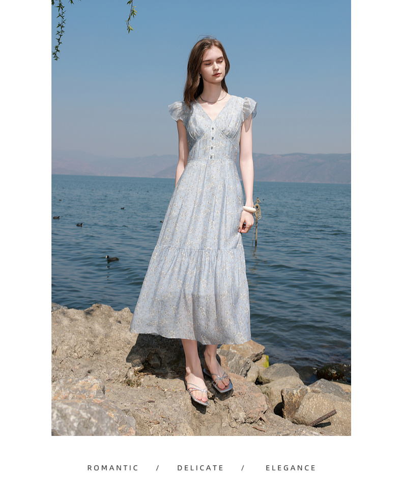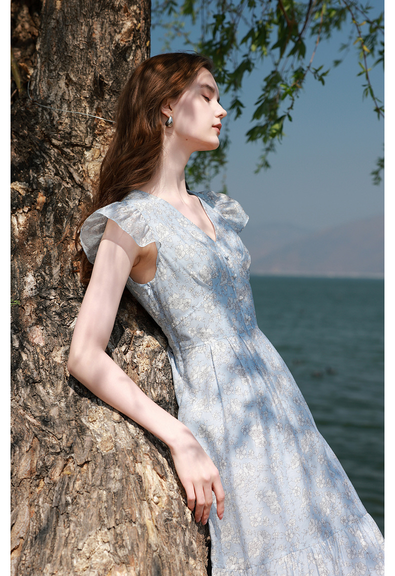 三彩2025夏季新款碎花连衣裙法式V领飞飞袖收腰A字裙长裙M