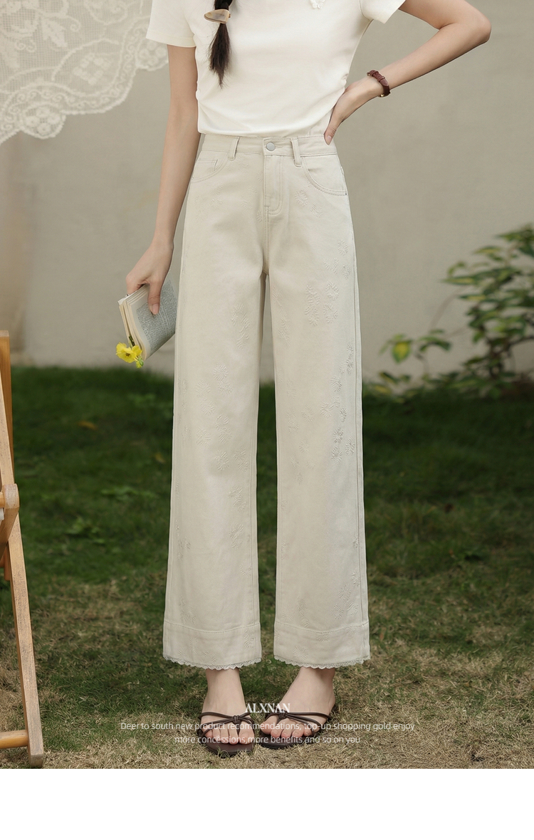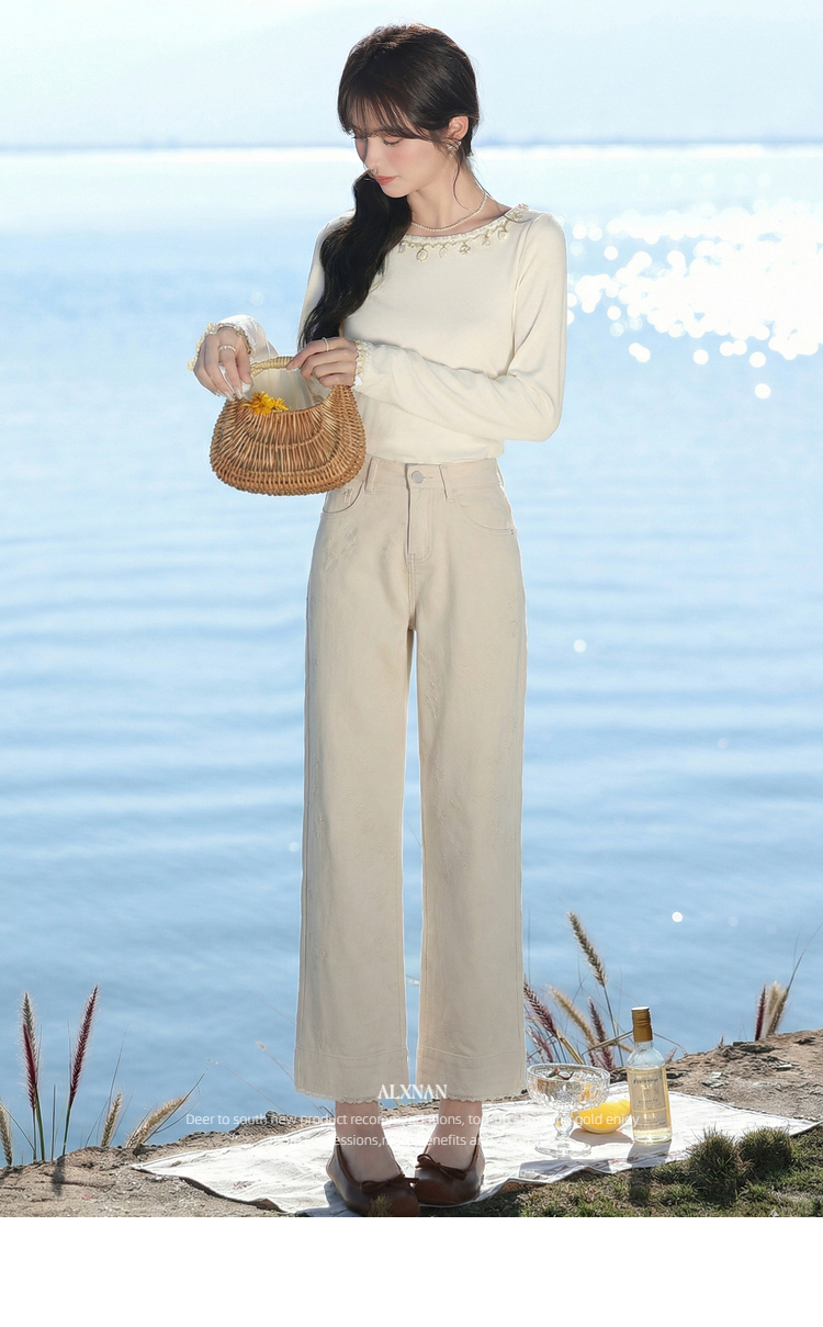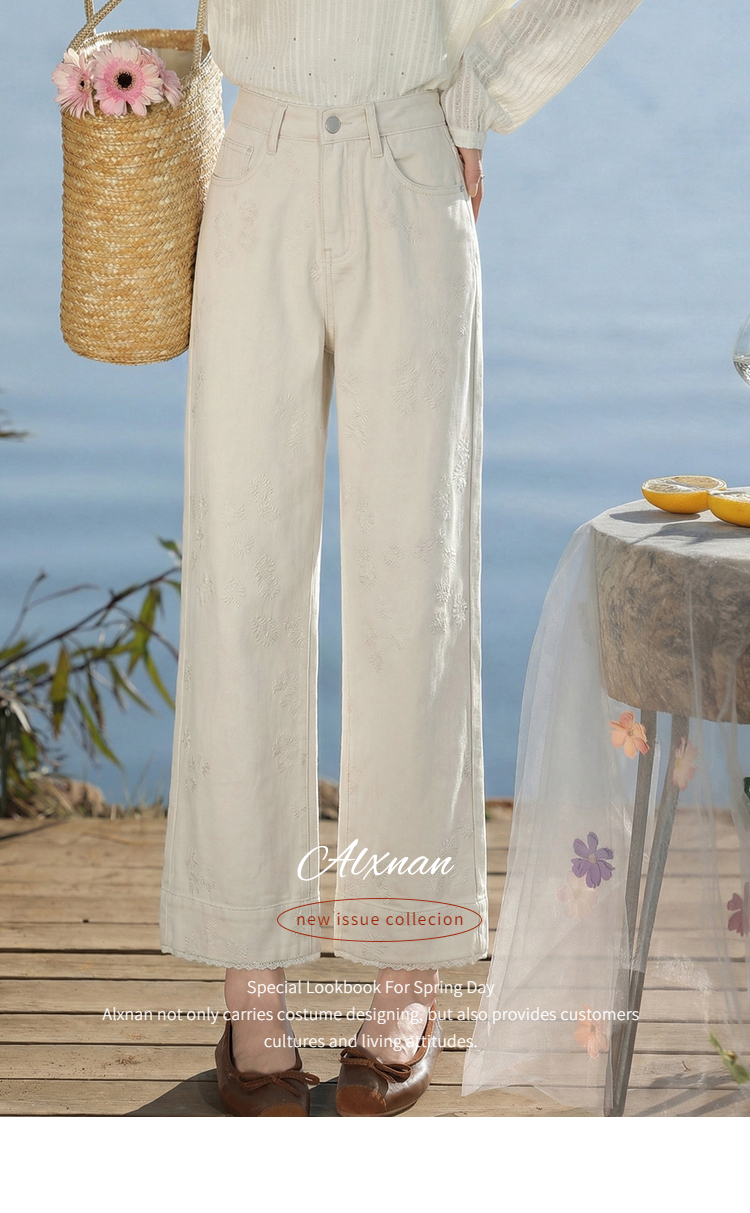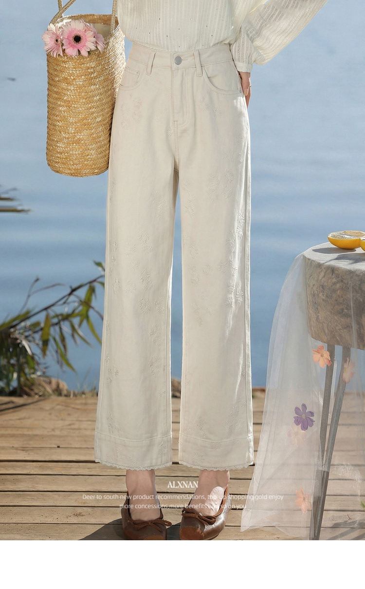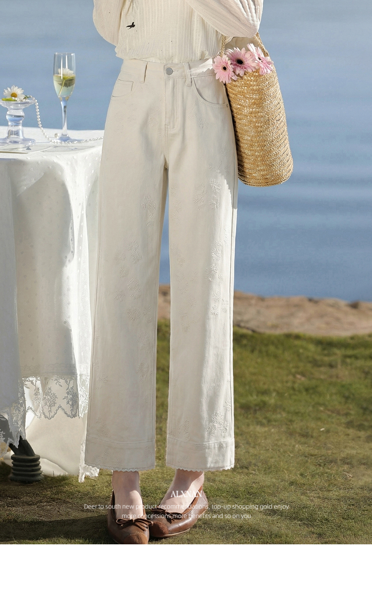 鹿向南「香草微风」米白色牛仔裤女春季韩系时尚宽松九分直筒裤