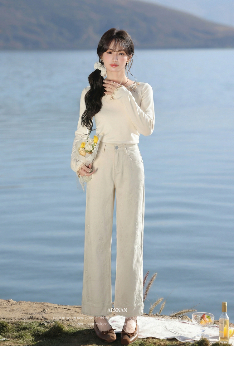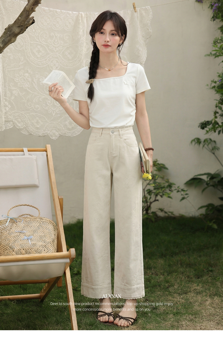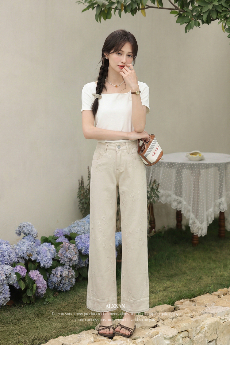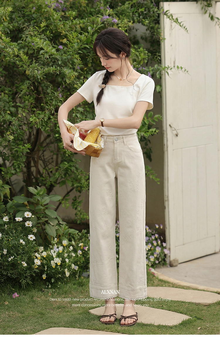 鹿向南「香草微风」米白色牛仔裤女春季韩系时尚宽松九分直筒裤