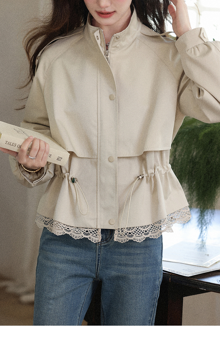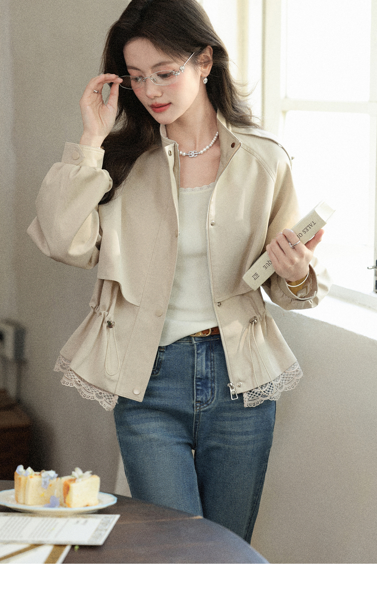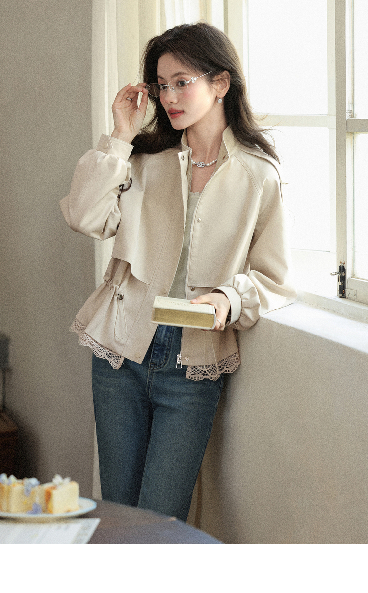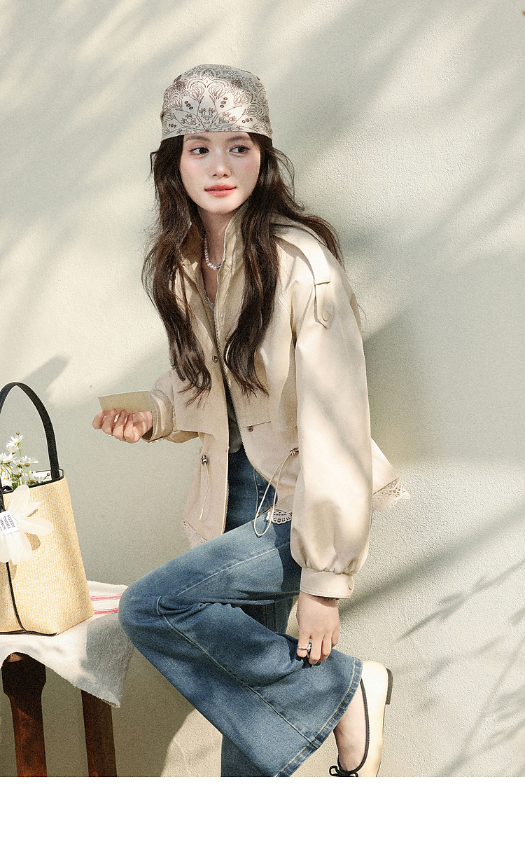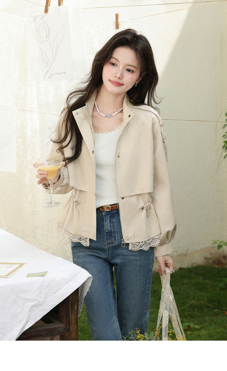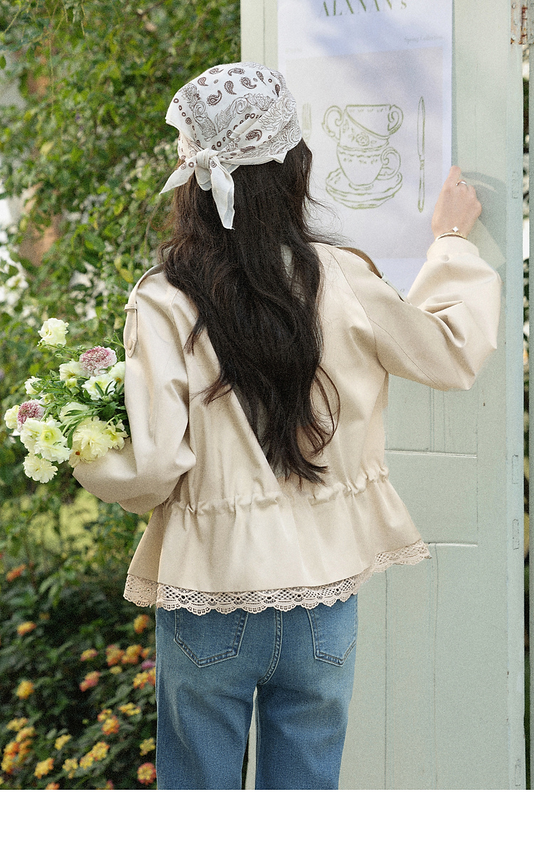 鹿向南「千里寻花」米色蕾丝拼接长袖短款风衣女春季收腰法式外套